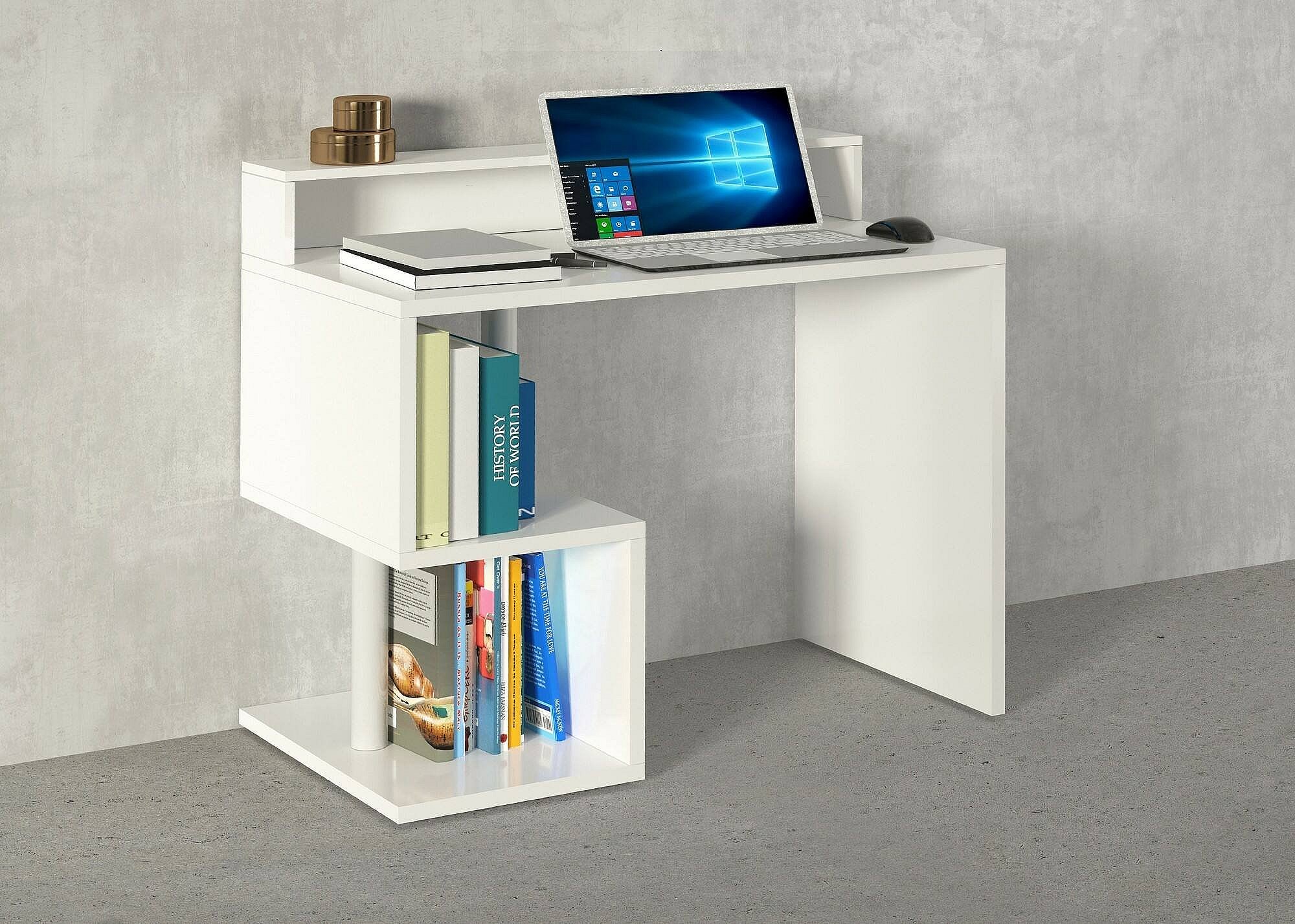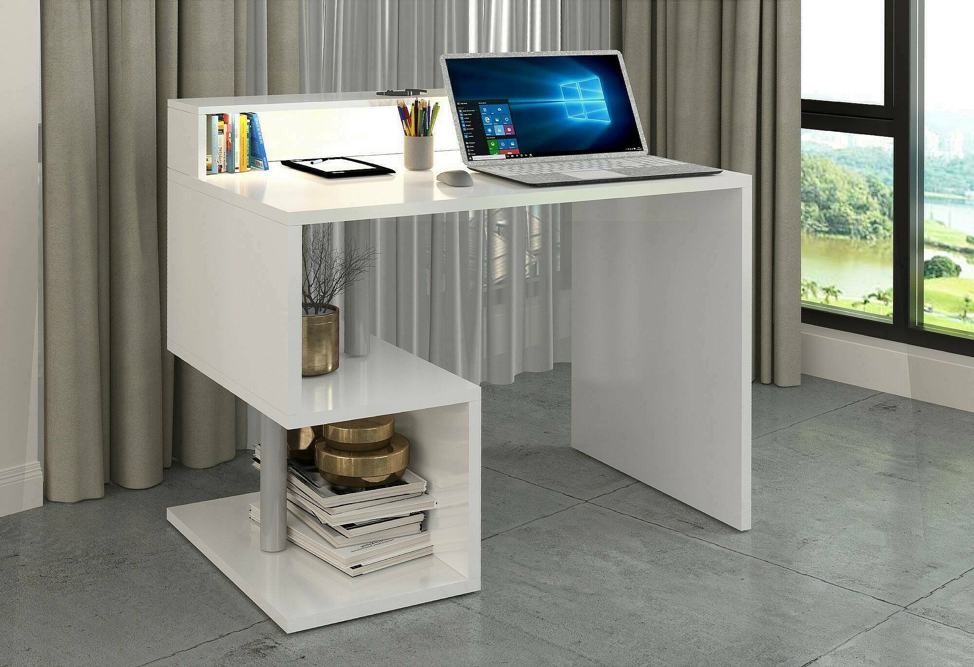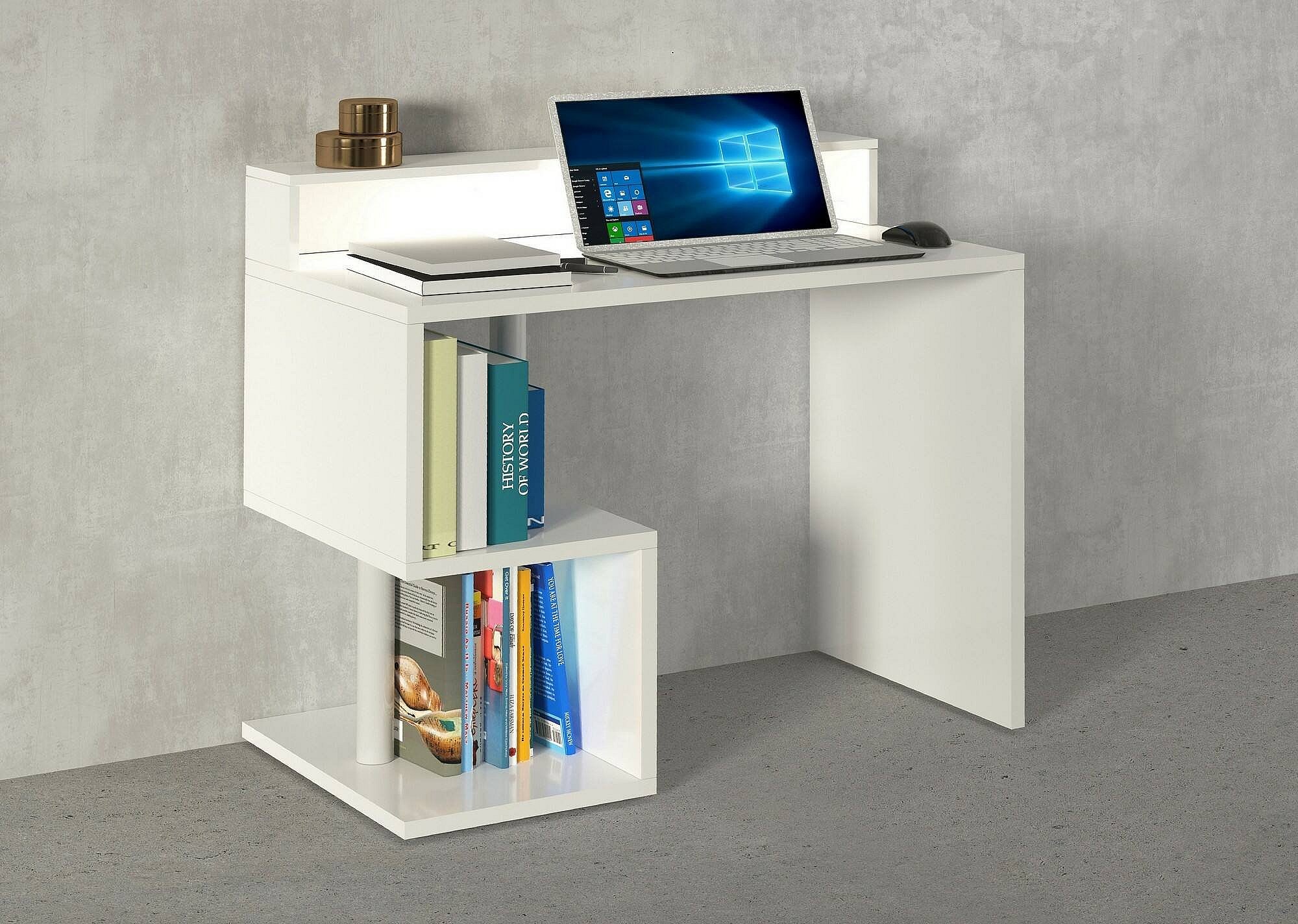 Mesa Dcalafior, Escrivaninha linear com prateleiras de armazenamento e luzes LED, Mesa de escritório multiuso com salto, 100x50h93 cm, Branco