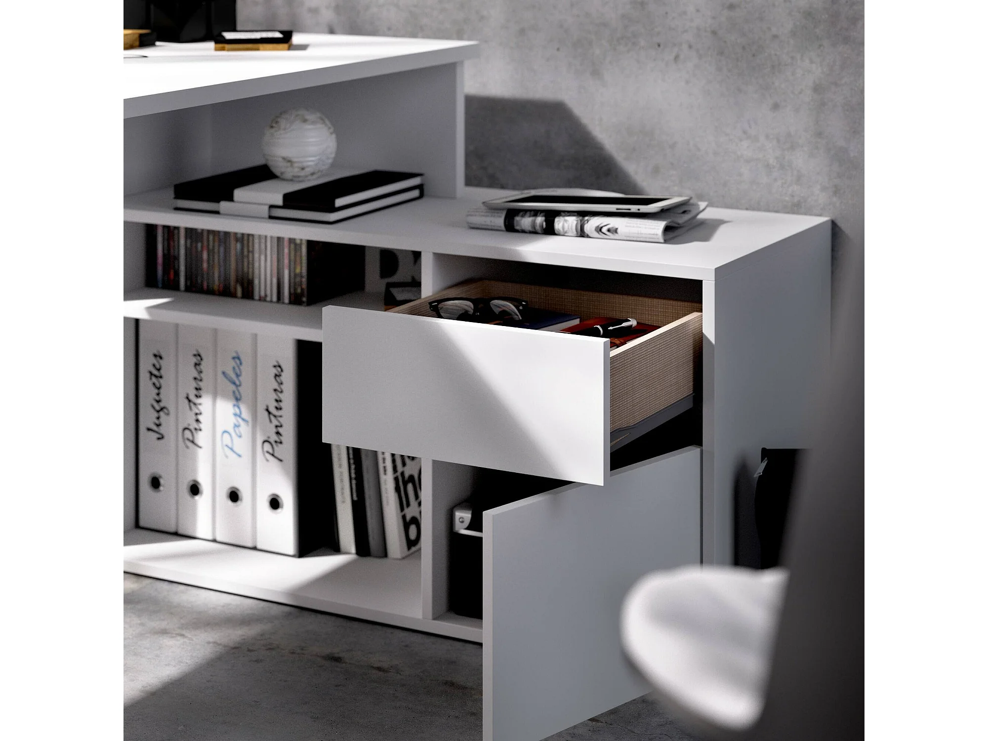 Mesa Ddiaw, Mesa multiposições para escritório ou quarto, Mesa de estudo multifuncional de canto, 139x92h75 cm, Branco