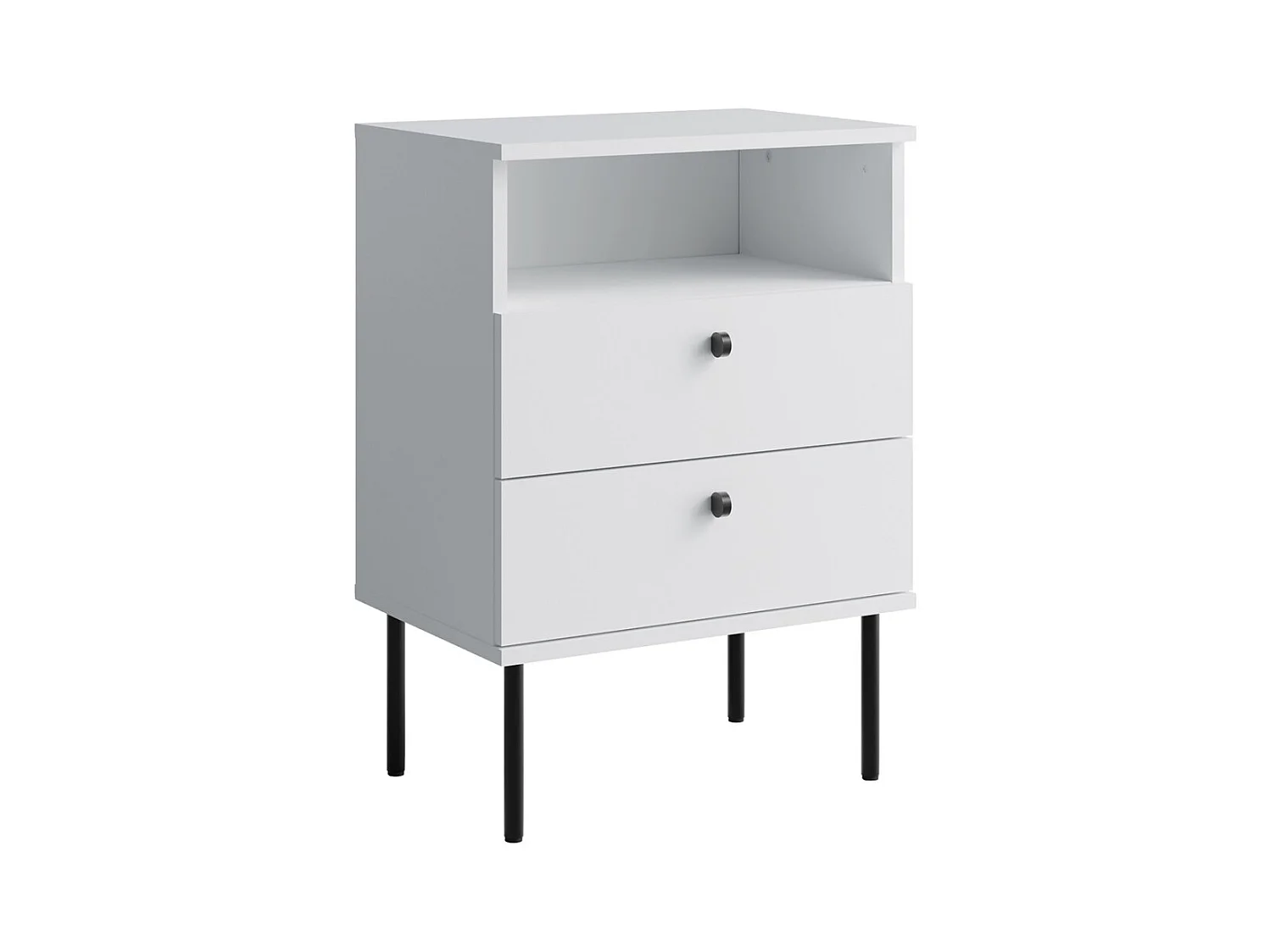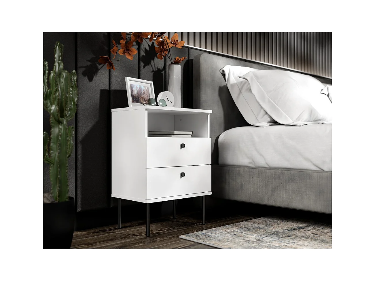 Mesa de Cabeceira 2 Gavetas com Nicho – Cor branca – Pés retos pretos – Coleção Aurora