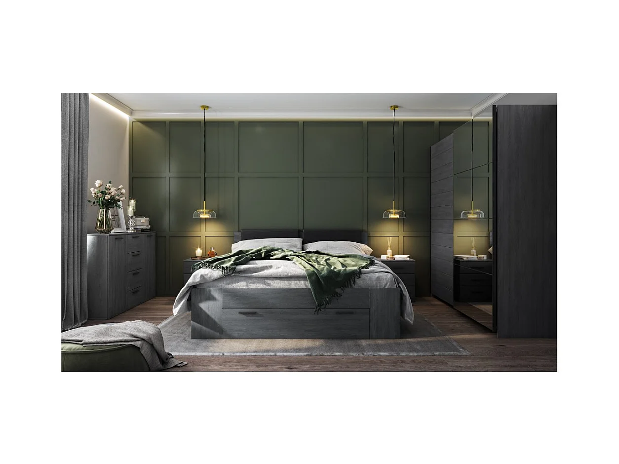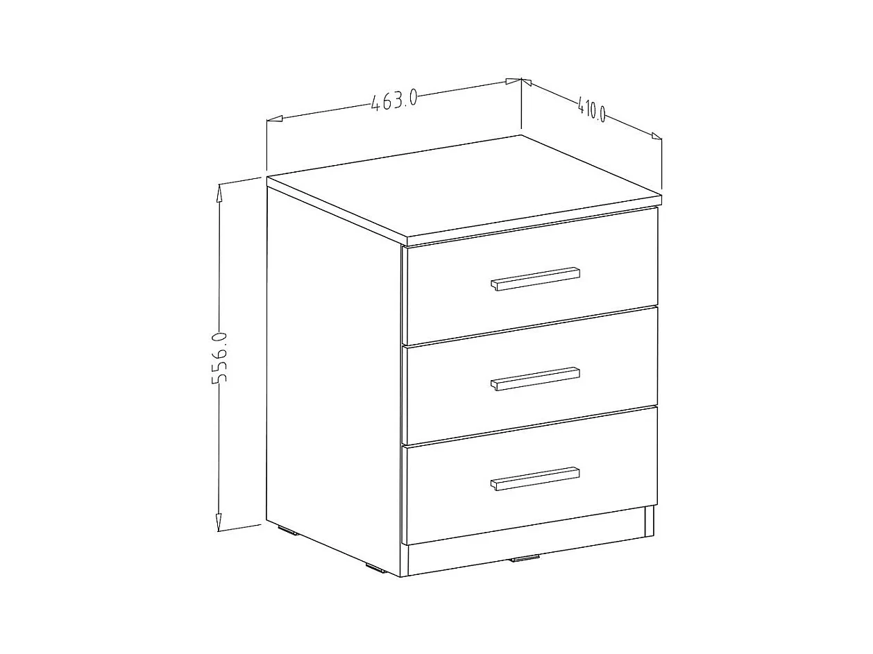 Mesa de cabeceira com três gavetas, coleção FLOYD. Cor cinza com efeito de madeira.