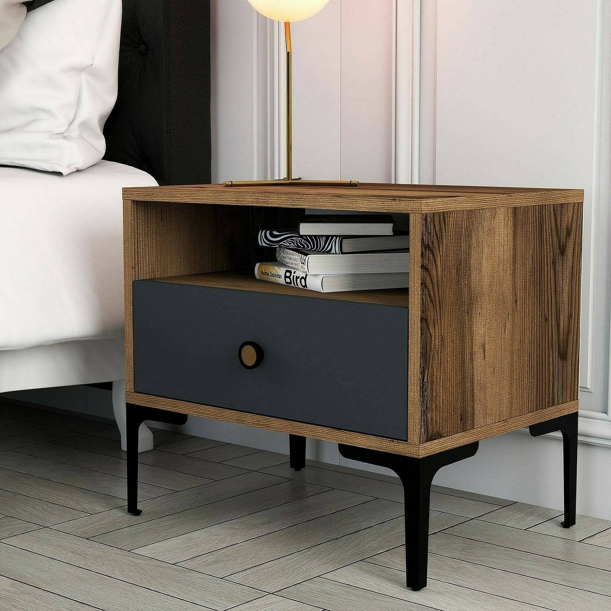 Mesa de cabeceira Dpidon, Cômoda baixa, Mesa de cabeceira, Prateleira de cabeceira, 56x40h51 cm, Nogueira e Antracite
