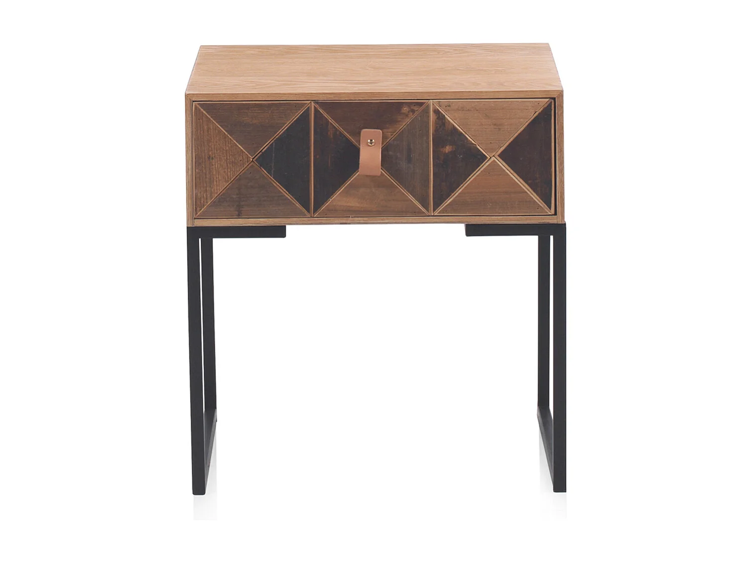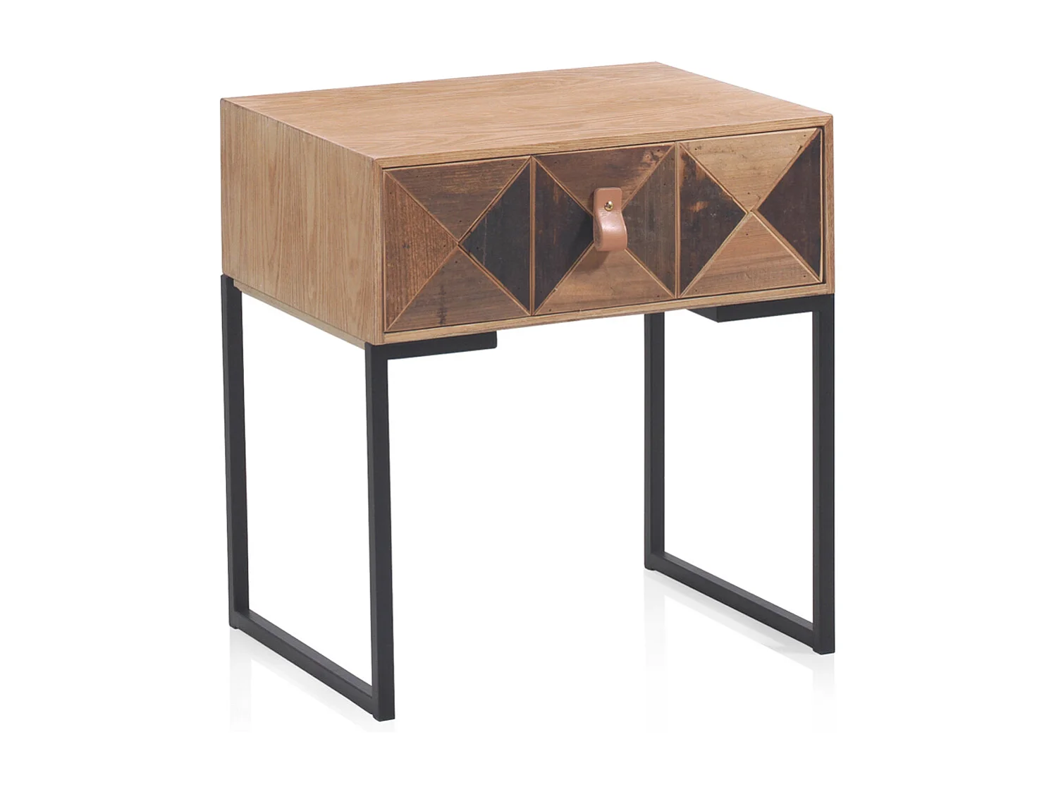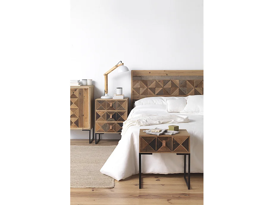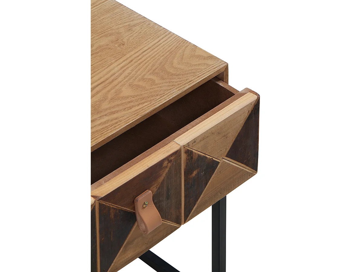 Mesa de cabeceira em madeira de freixo reciclado com 1 gaveta e base metálica