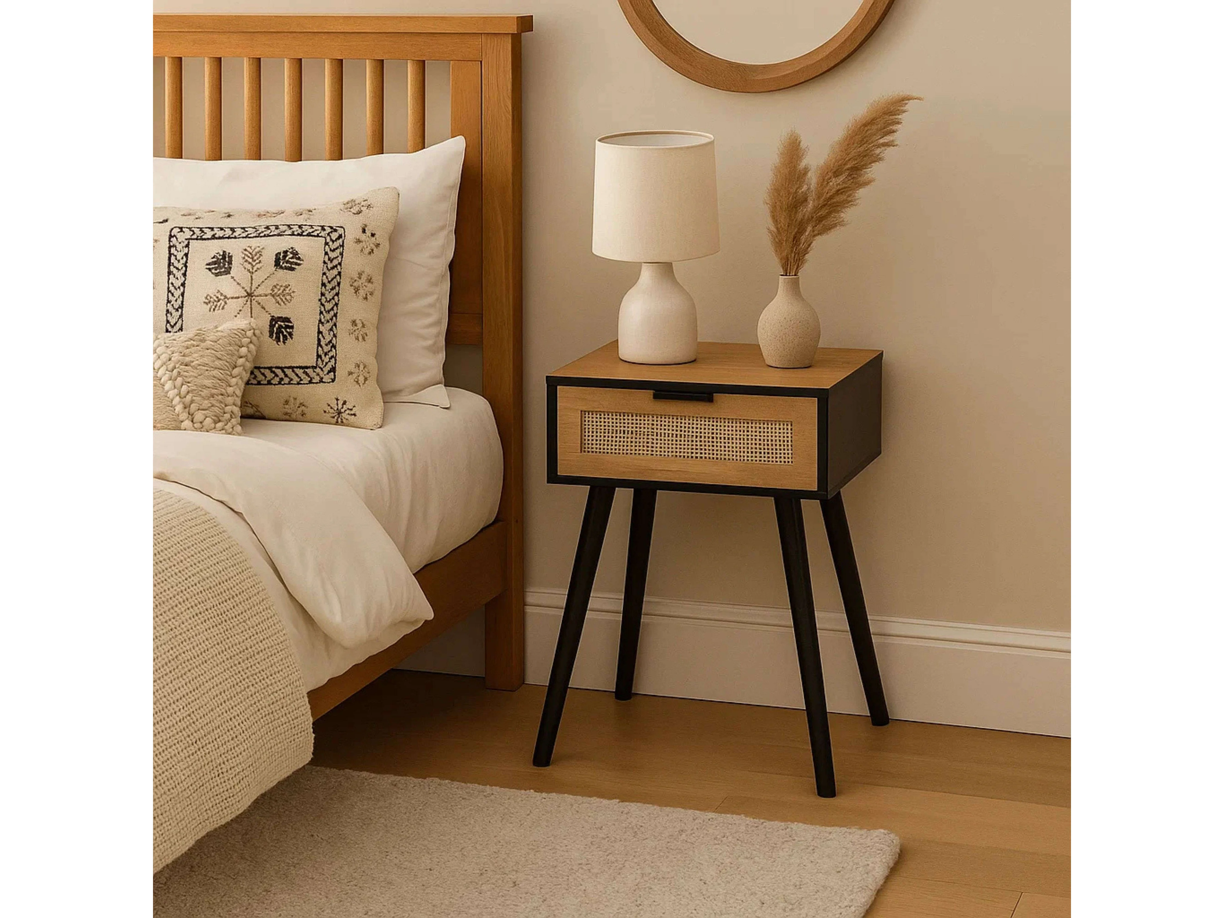 Mesa de cabeceira estilo industrial Frisa, preta e rattan, 1 gaveta, 40x52x30 cm