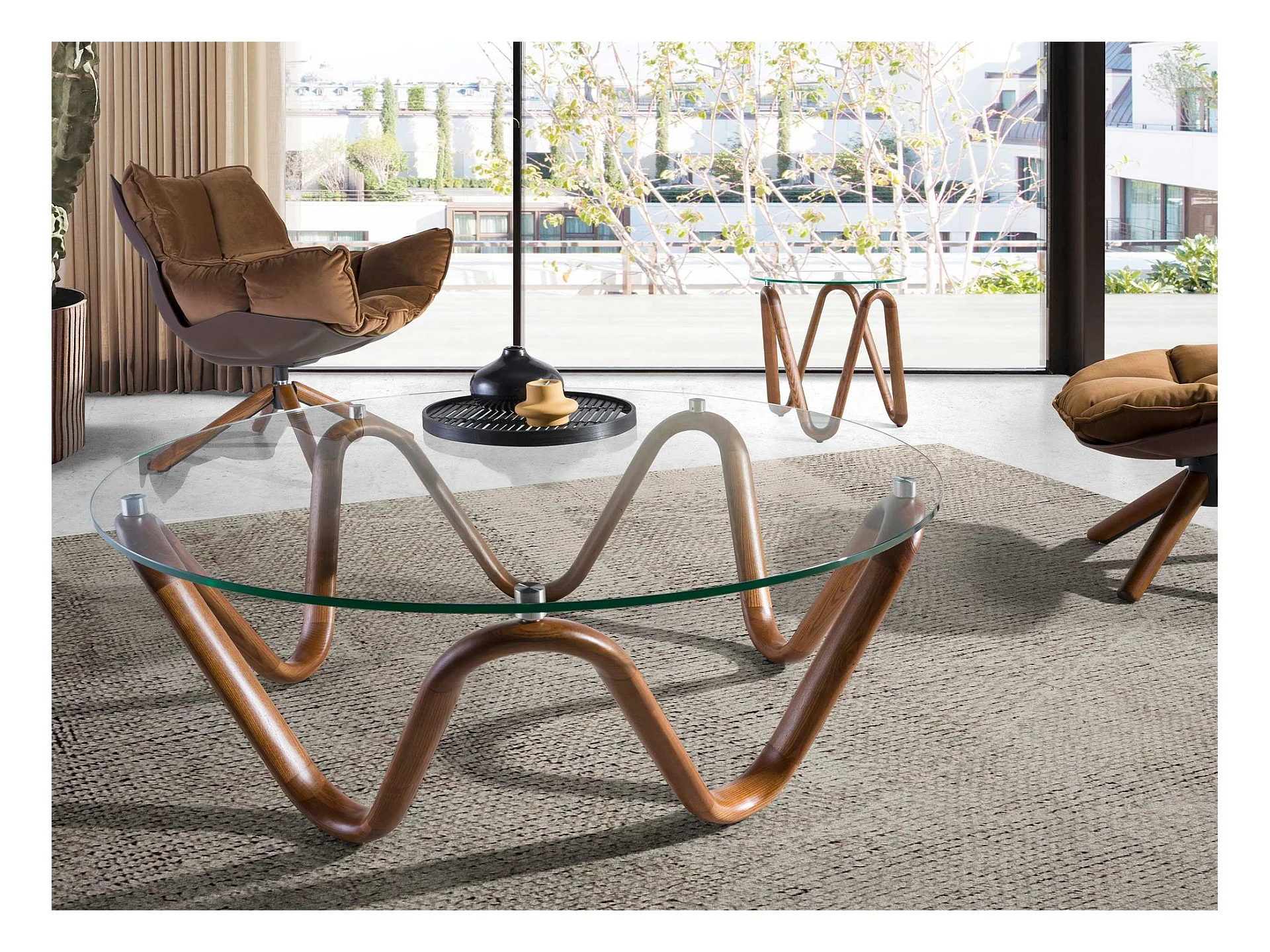 Mesa de canto redonda em vidro temperado e nogueira 2126