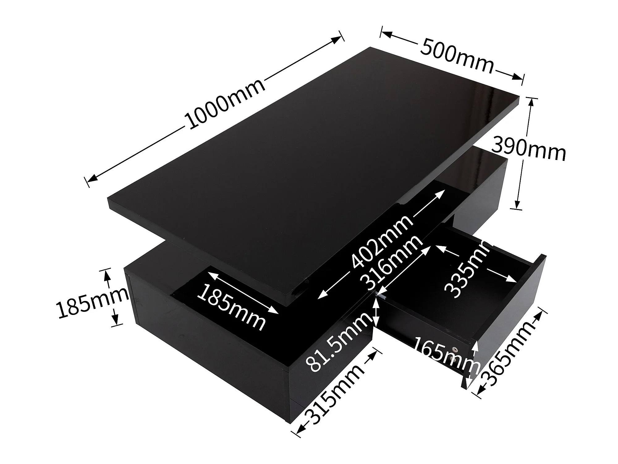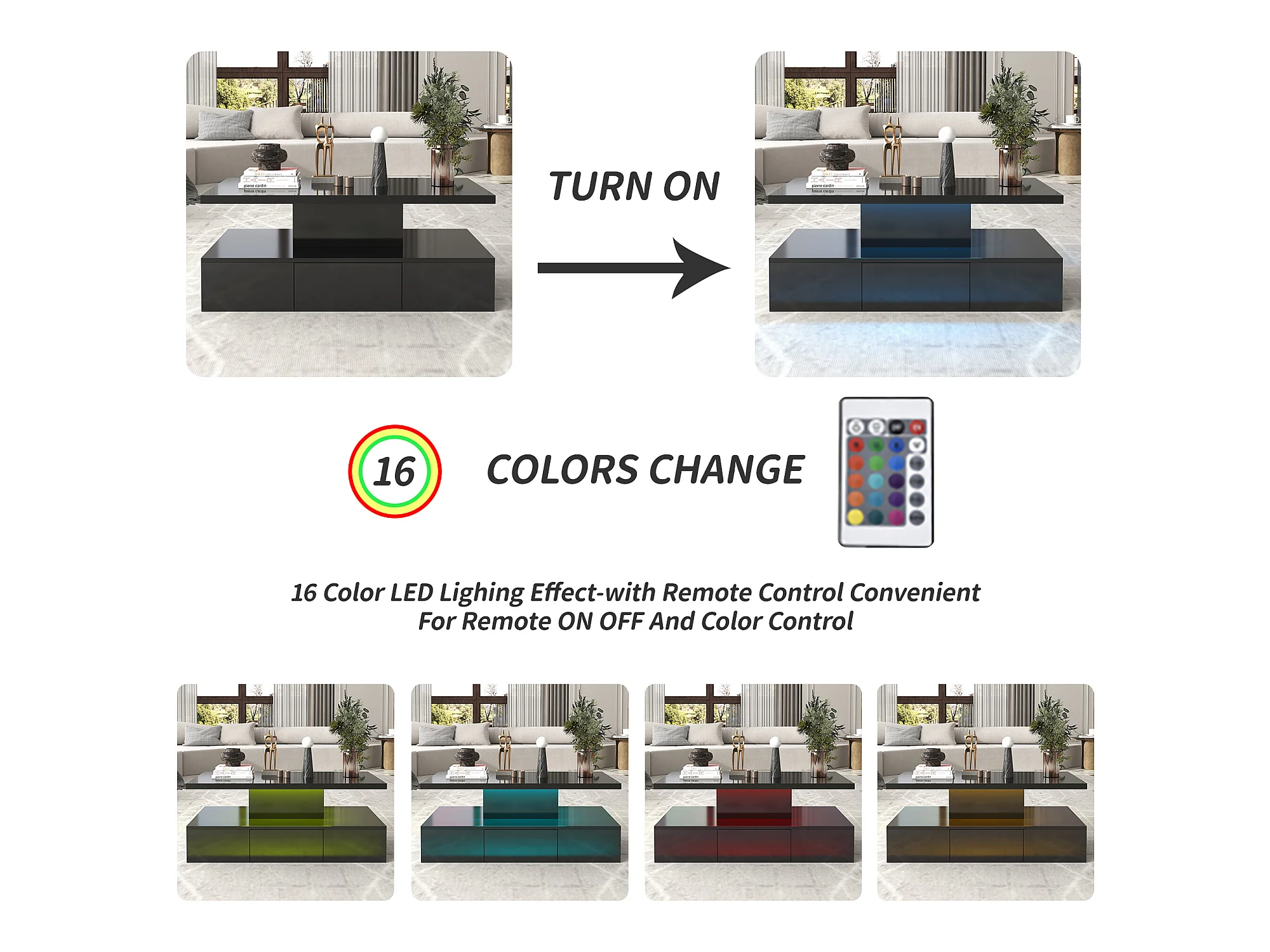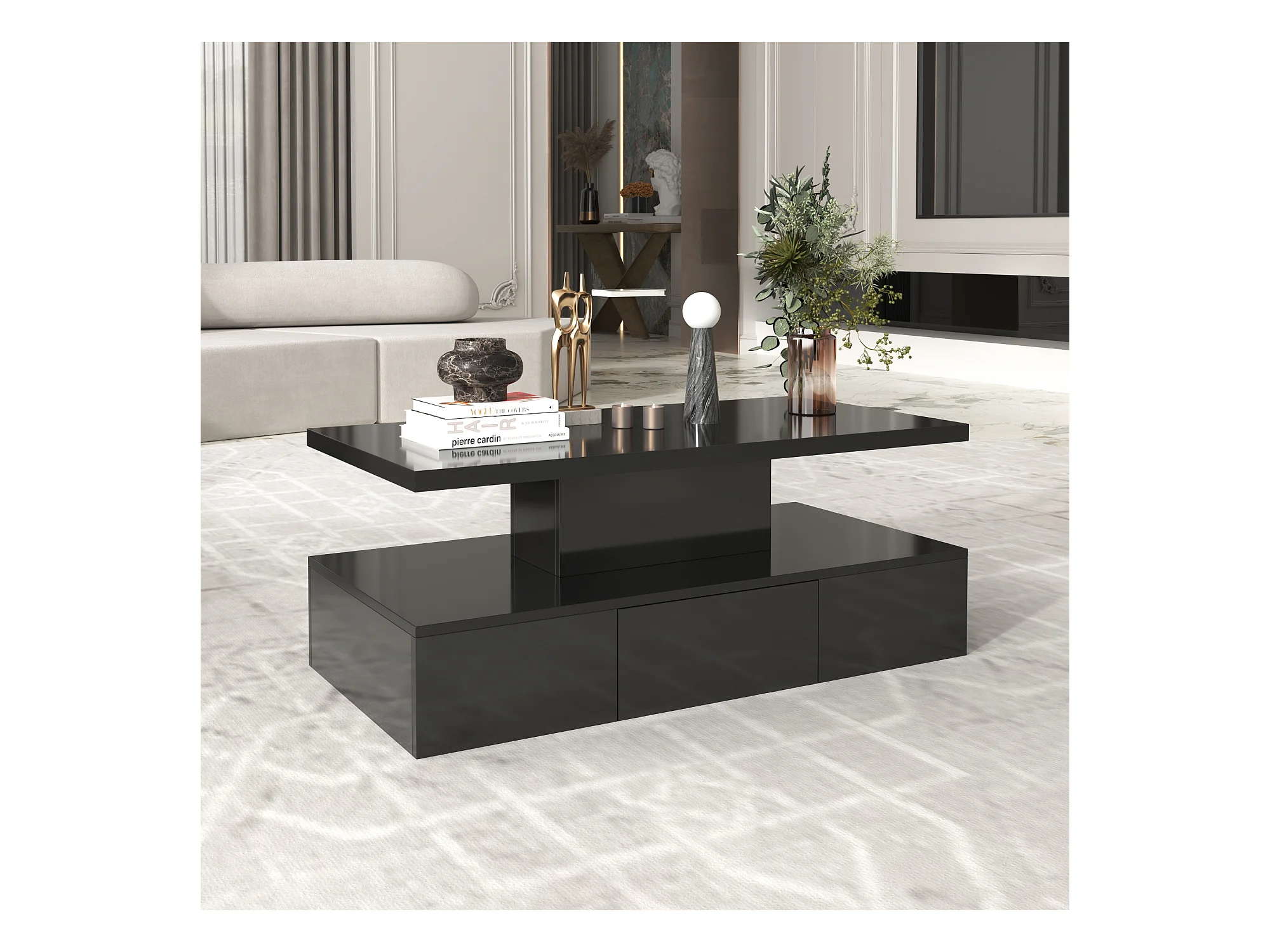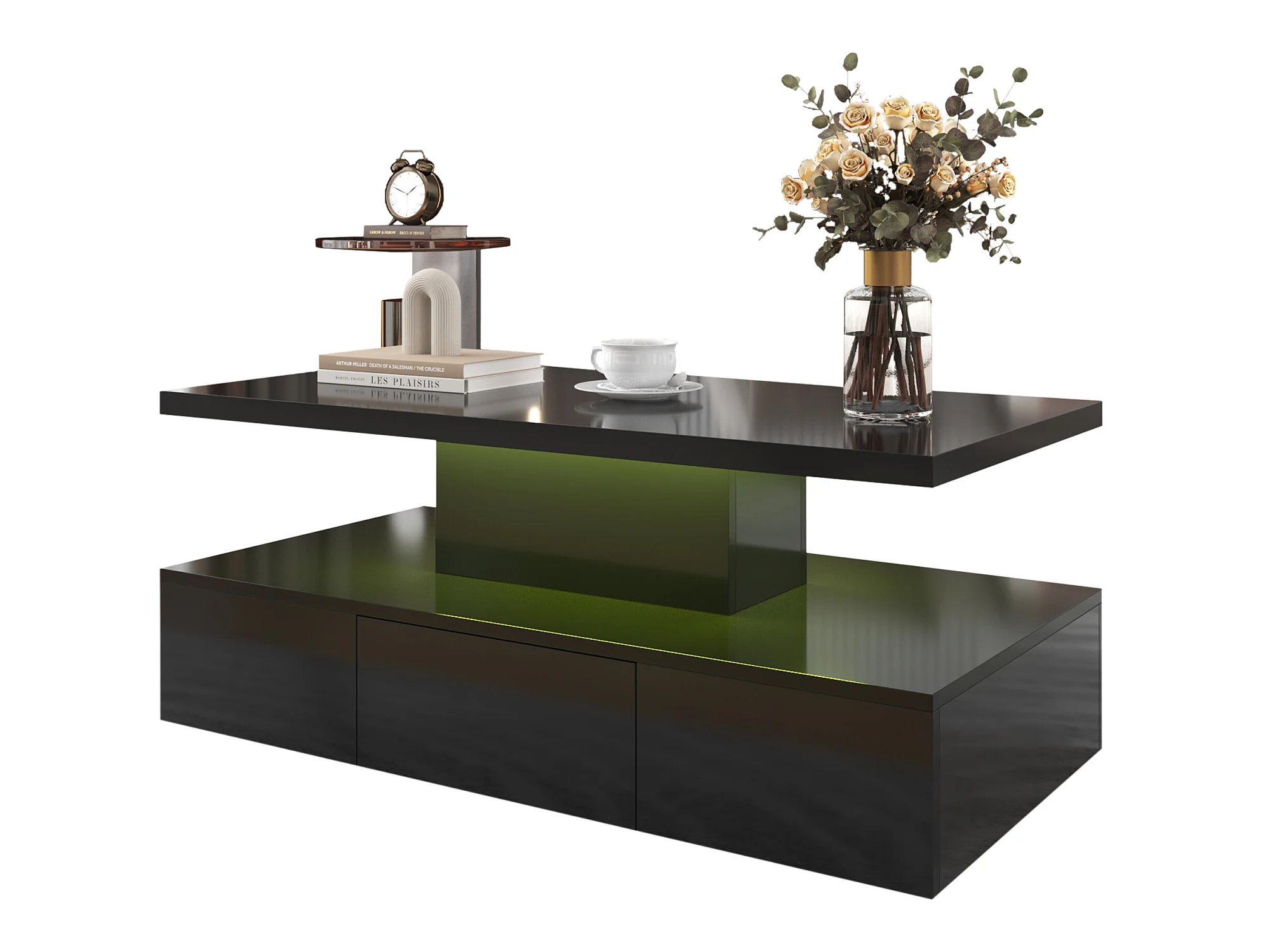 Mesa de centro - 1 gaveta e 2 prateleiras - aglomerado - LEDs - preto brilhante