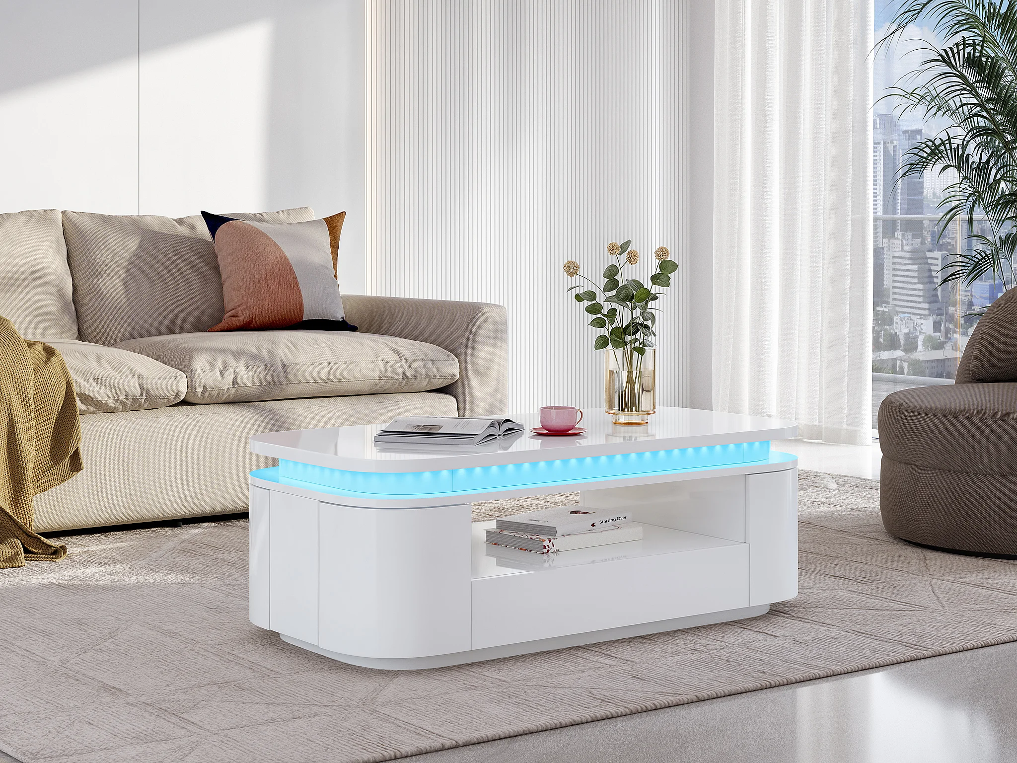 Mesa de centro 4 portas e 1 gaveta com LEDs em MDF lacado a branco - VANDANA