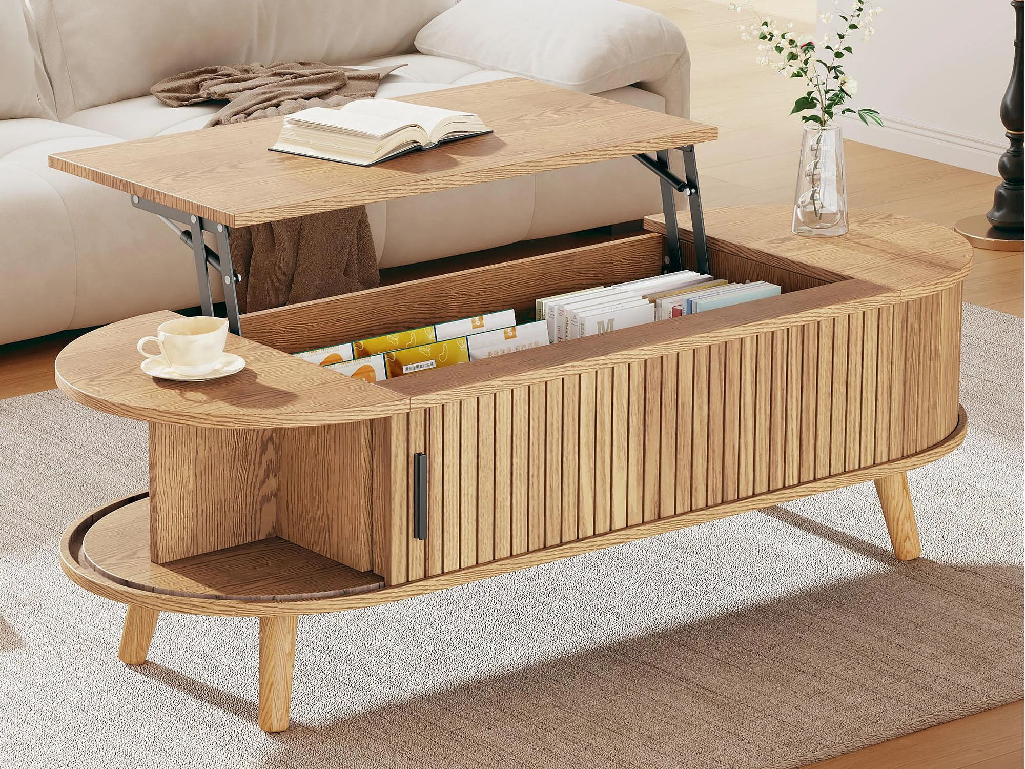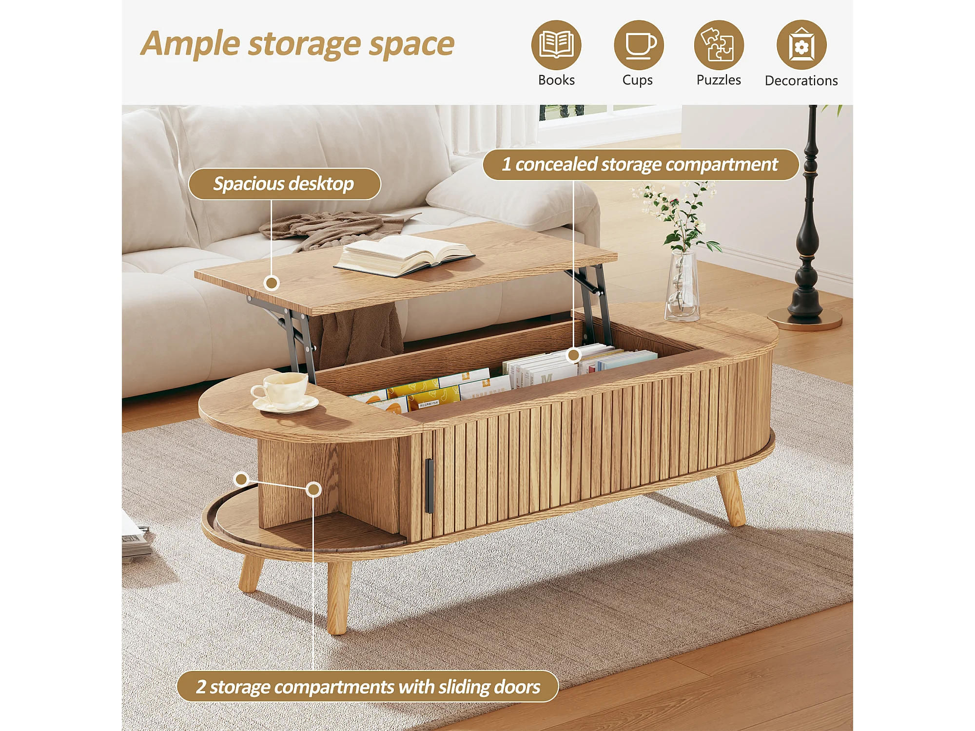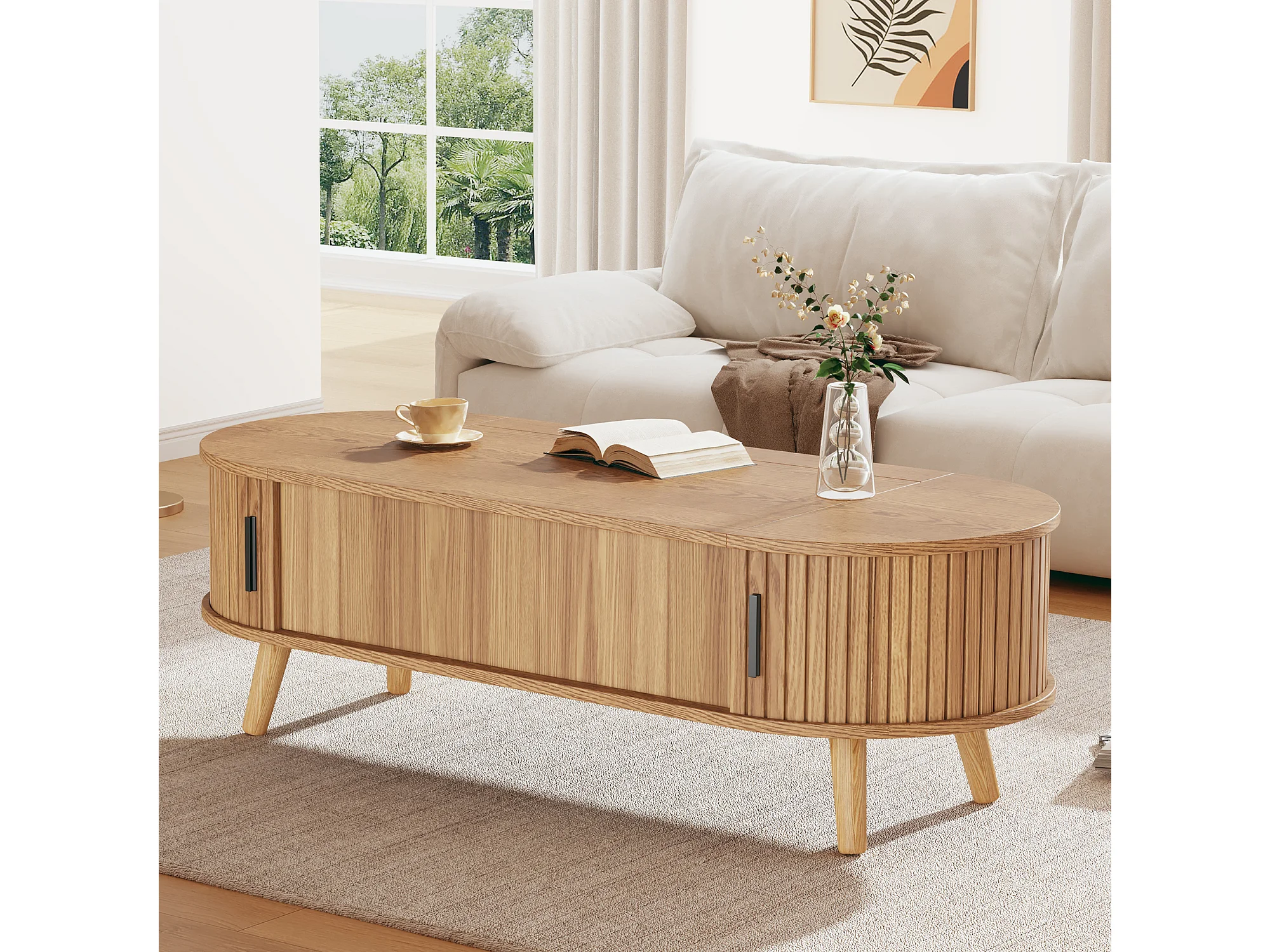 Mesa de centro ajustável em altura 120x50x39,5 cm - 2 portas - Armazenamento oculto - Pés de madeira maciça - Natural