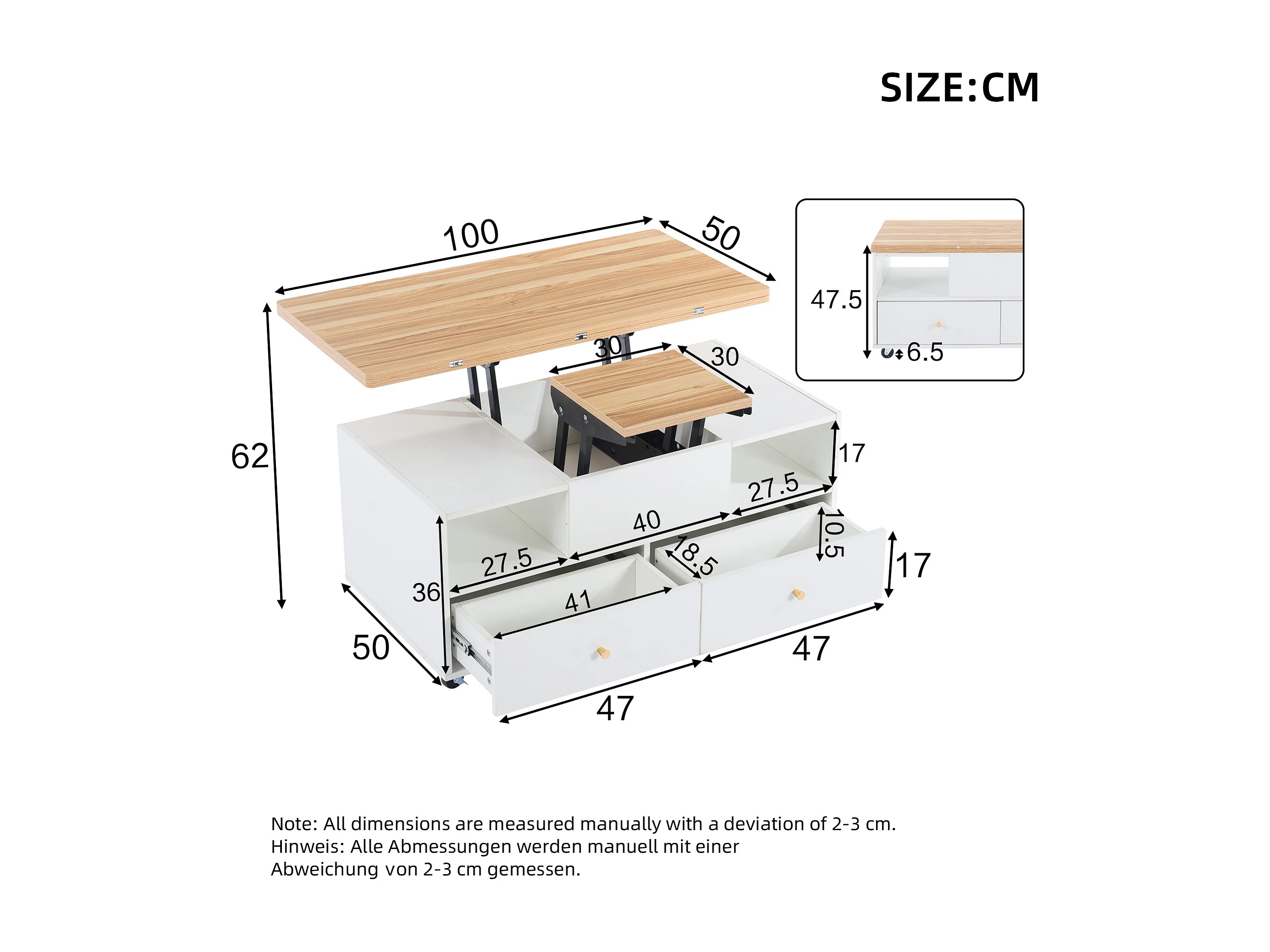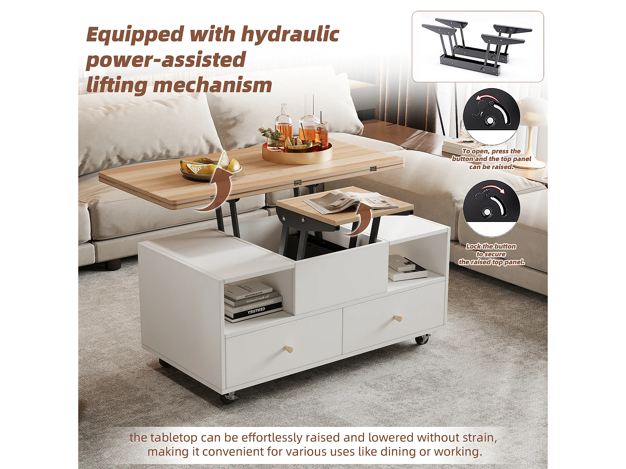 Mesa de centro elevatória - 100 x 51 x 47 cm - Tampo de abertura em 2 partes + 2 gavetas - Aglomerado - Branco