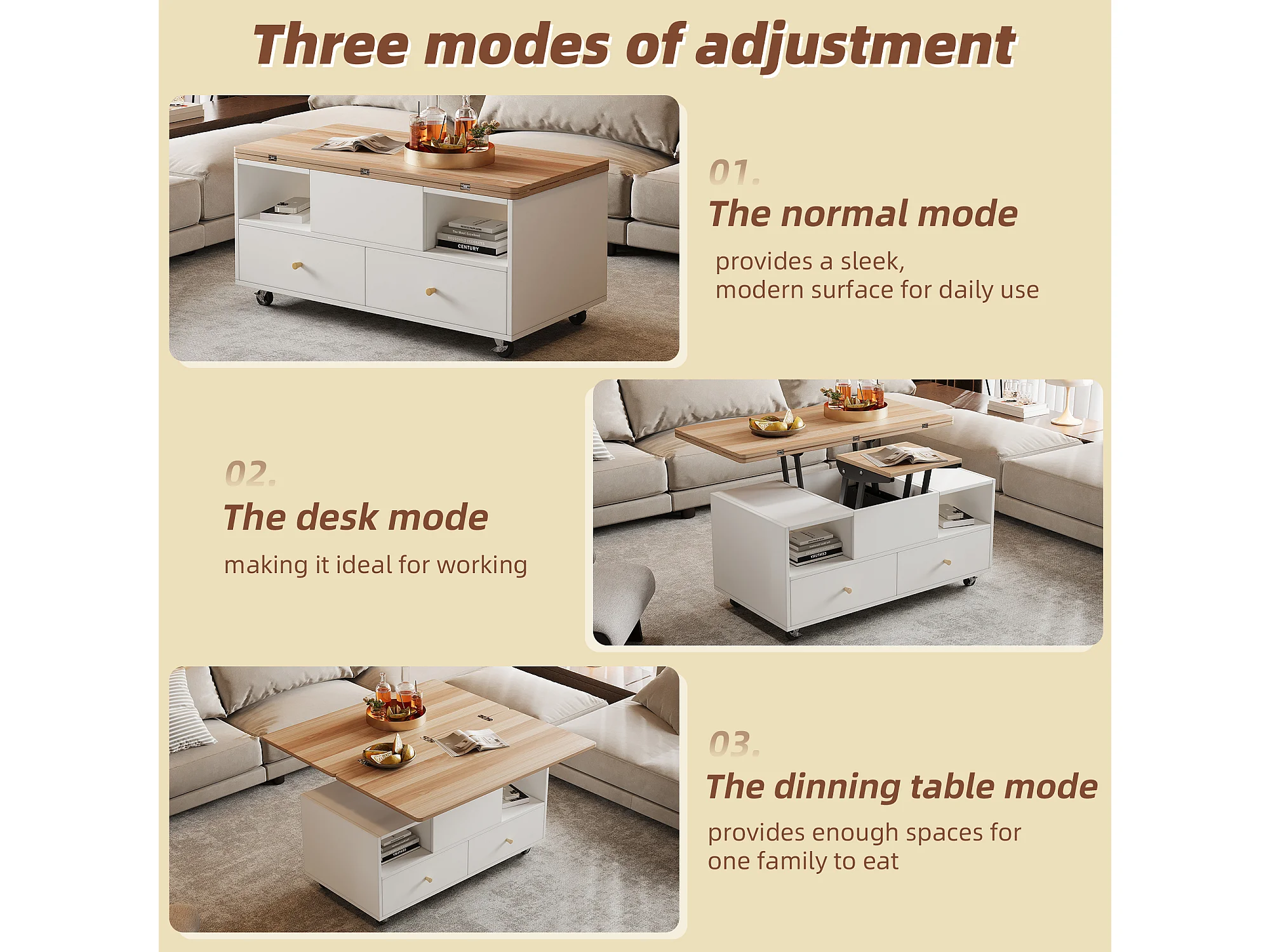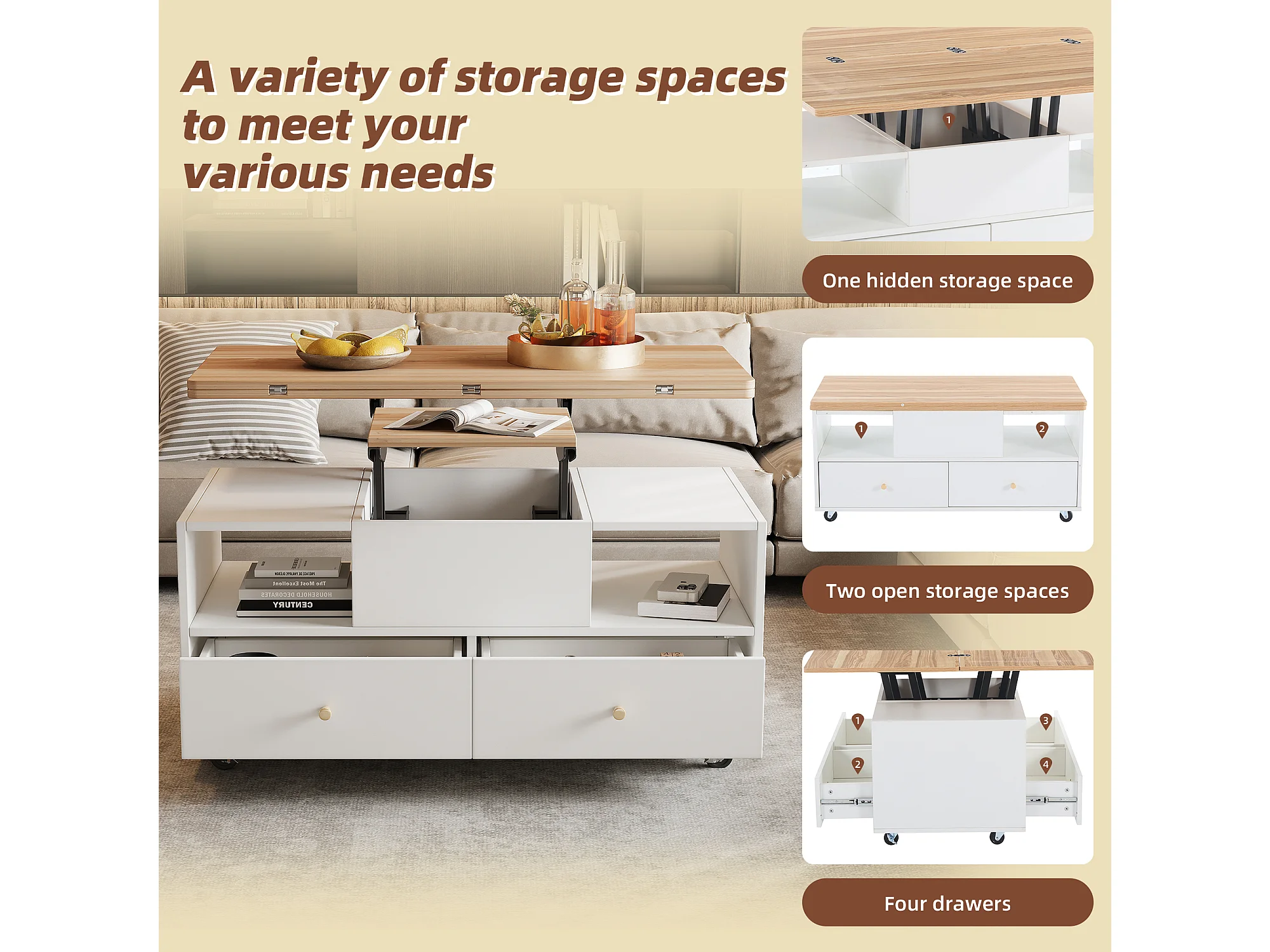Mesa de centro com tampo elevatório, função dobrável e 4 gavetas - 100 x 50 x 47,5 cm - mesa móvel com rodízios - MDF - branca