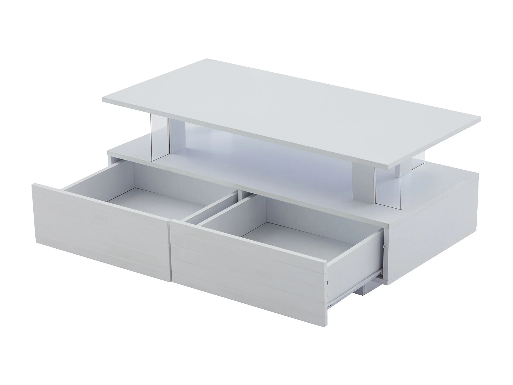 Mesa de centro brilhante de 2 níveis com LEDs + prateleira aberta + 1 gaveta deslizante - 100 x 50 x 39 cm - aglomerado - branco