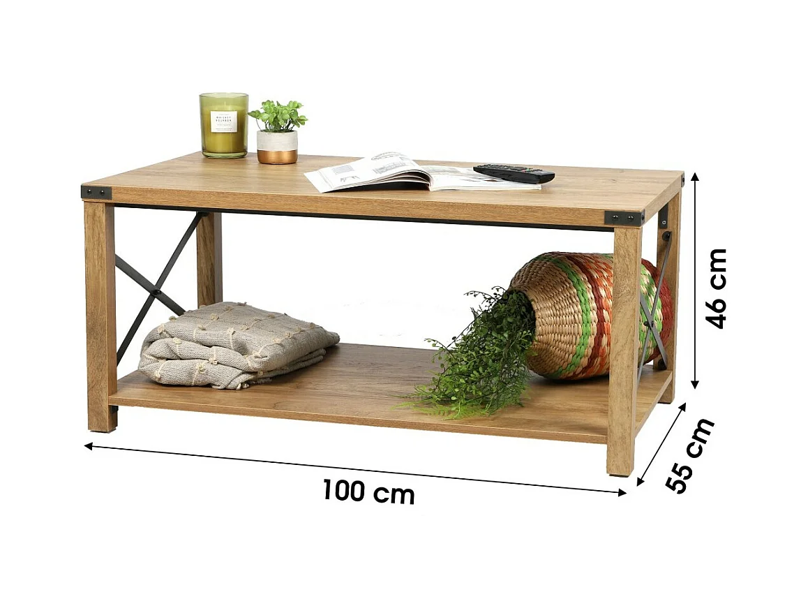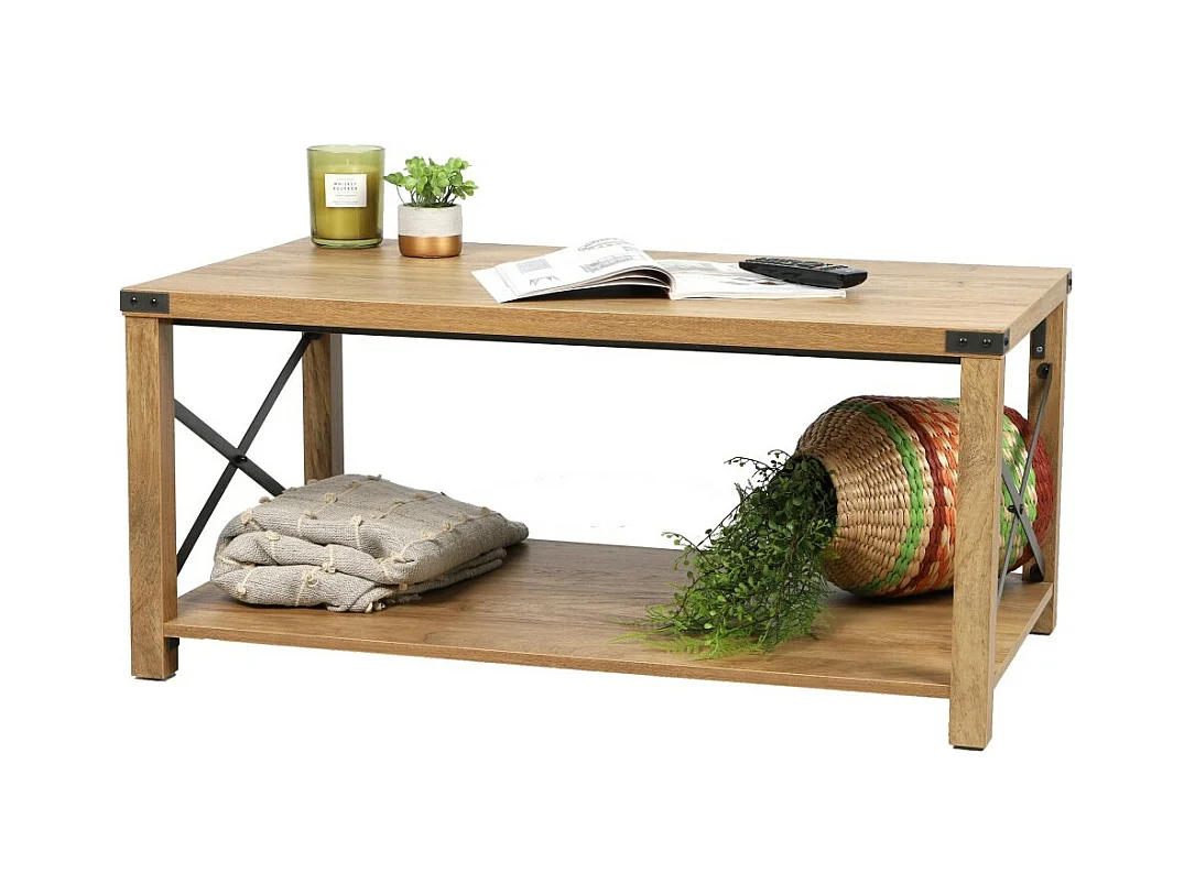 Mesa de centro cor carvalho claro com cruzetas de metal 100x55x46cm.