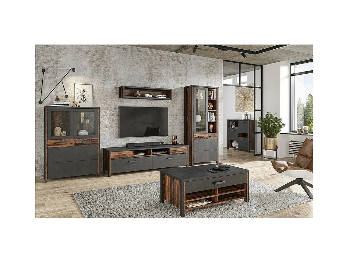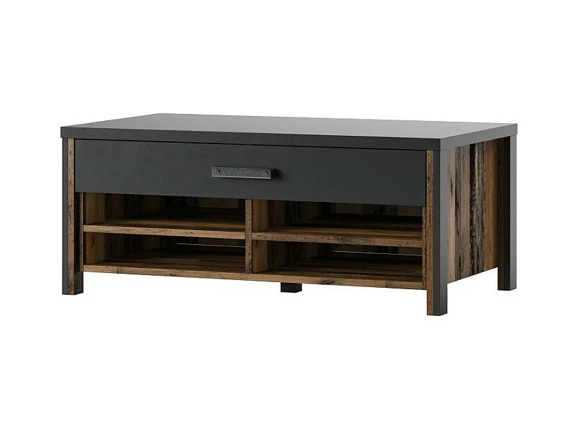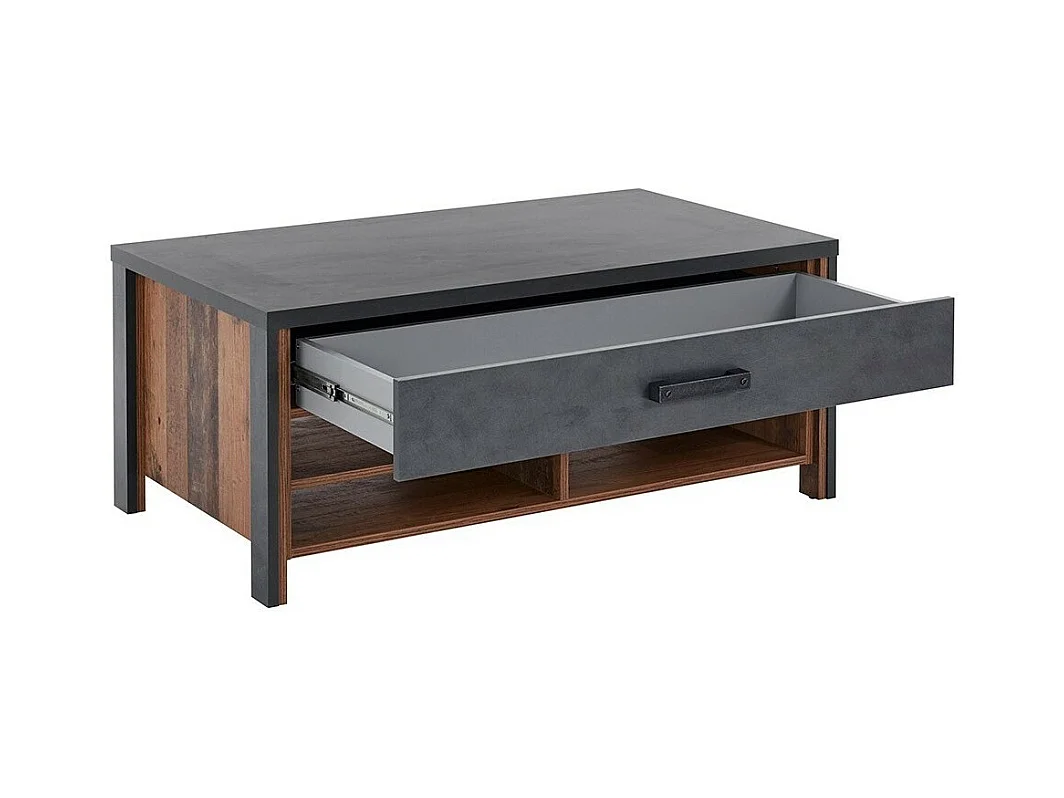 Mesa de centro design coleção WINDSOR com gaveta e nichos. Cores cinza antracite e carvalho escuro.