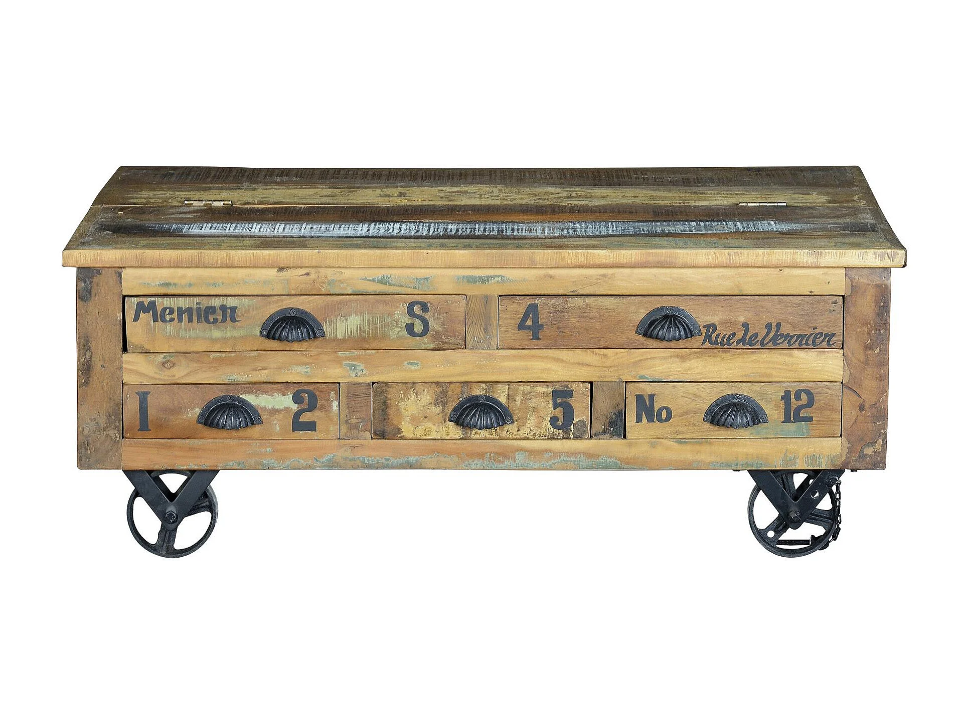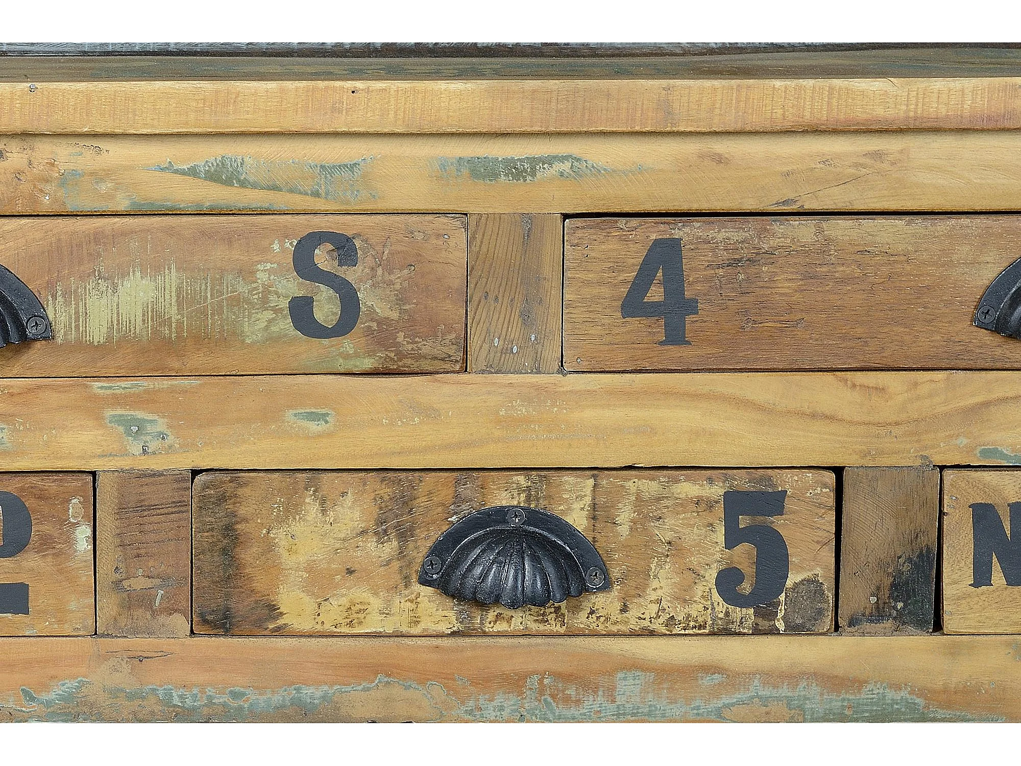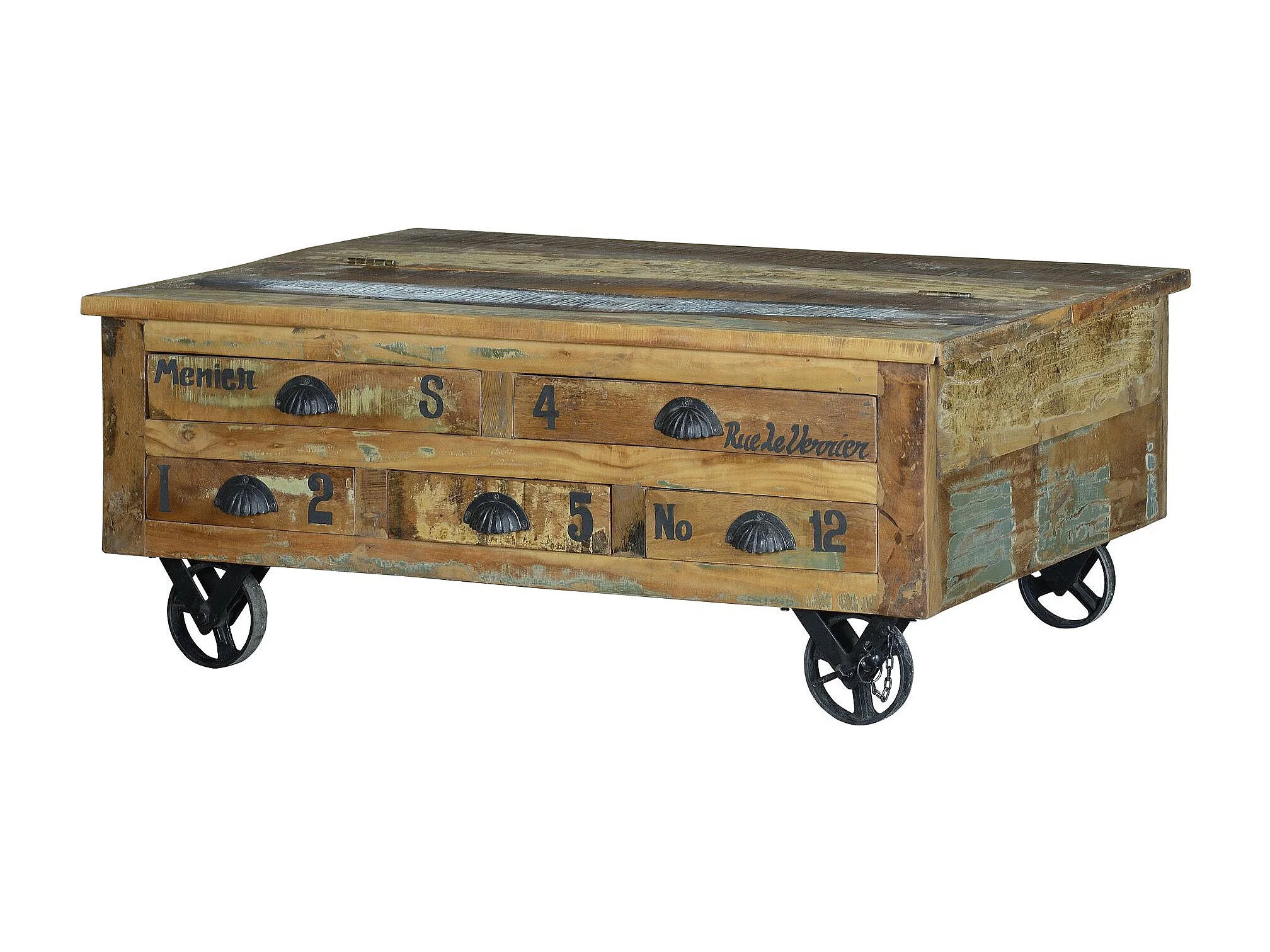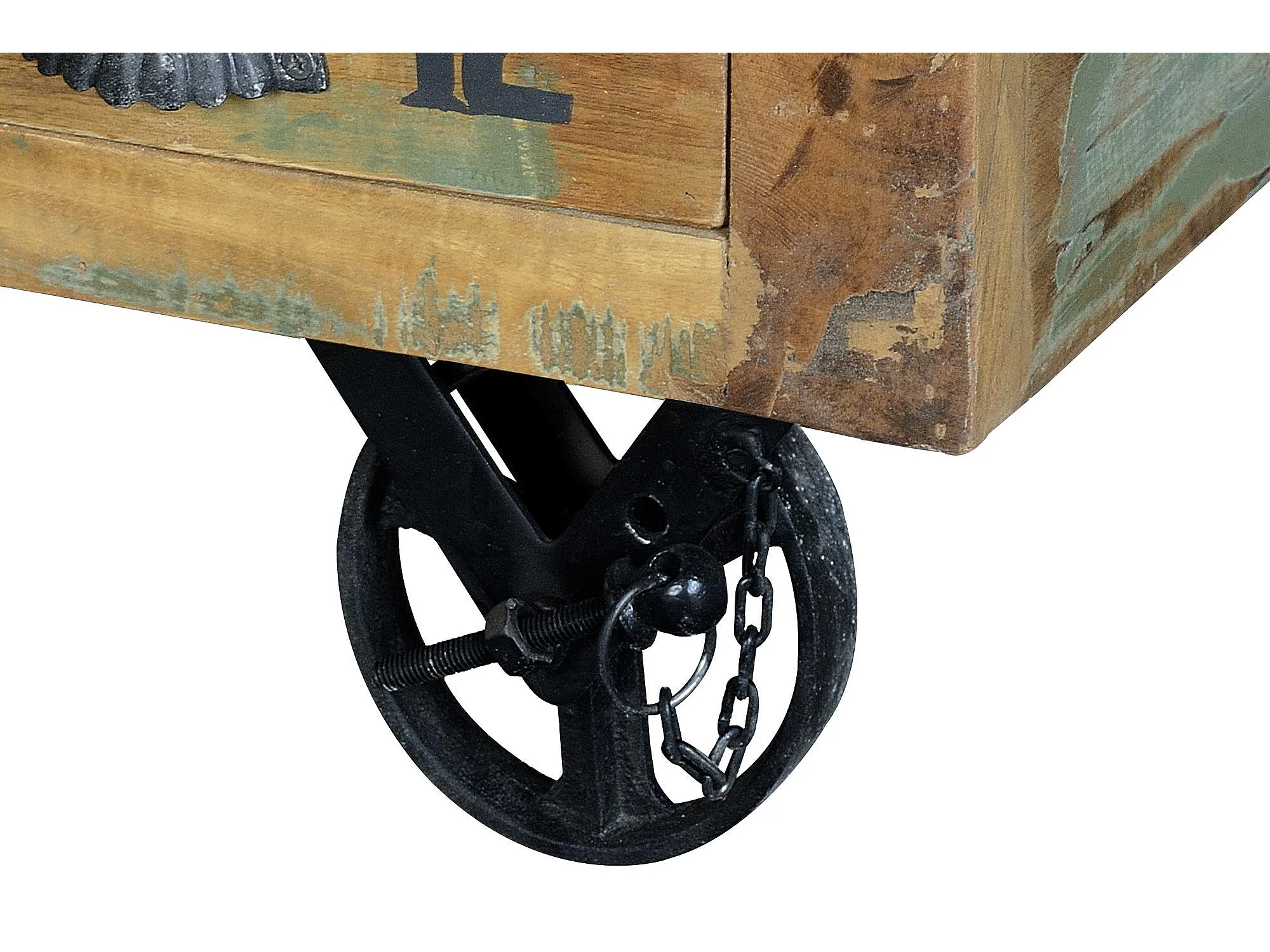 Base da mesa em madeira reciclada e roletas de metal multicoloridas.