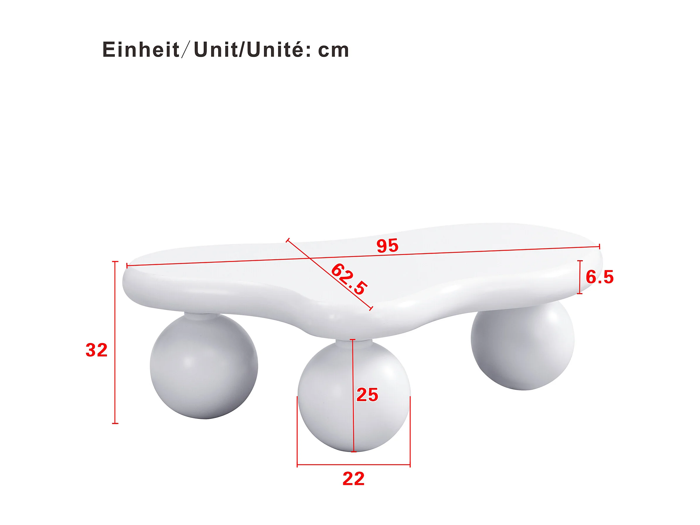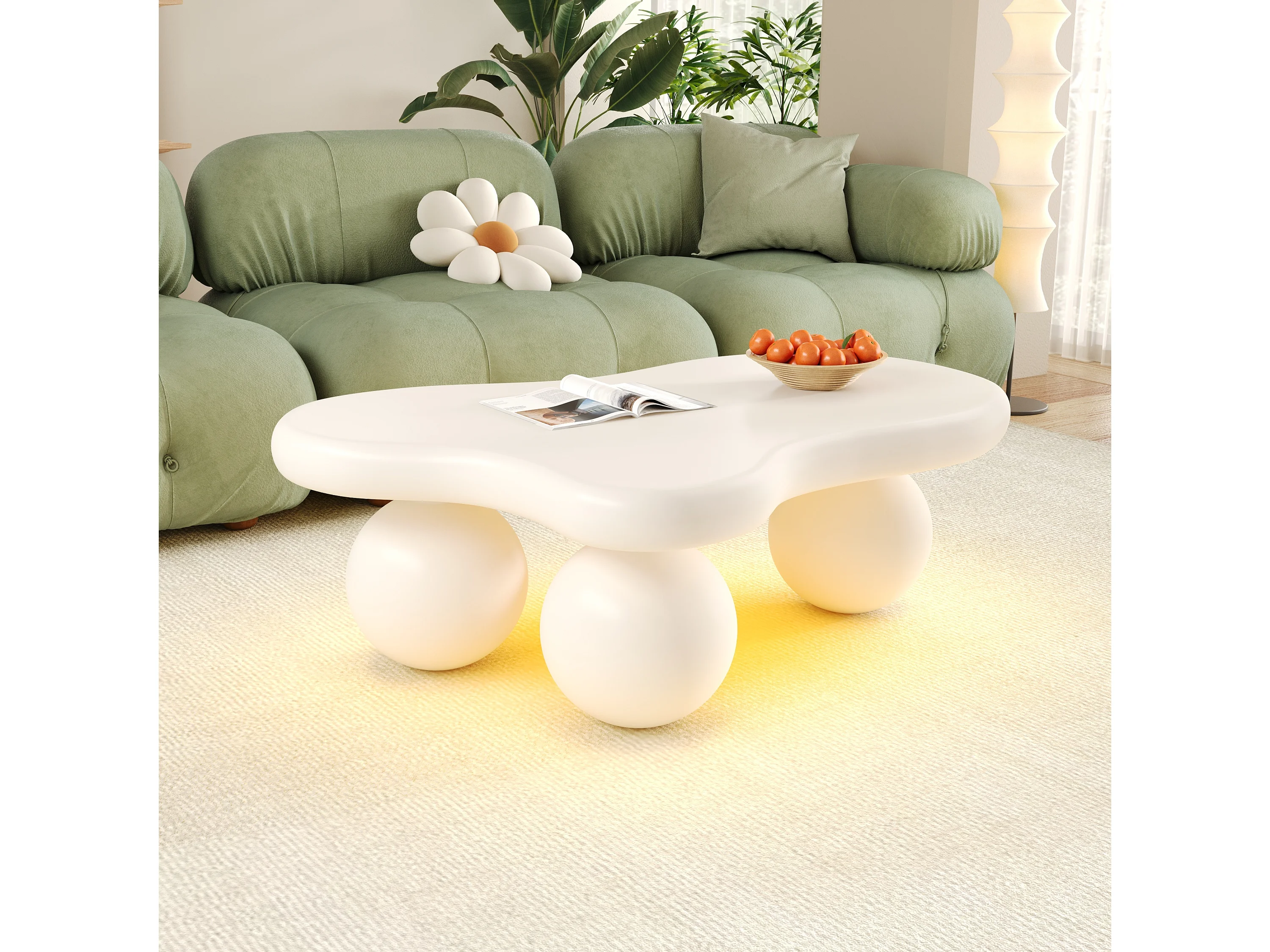 Mesa de Centro Irregular, Mesa Lateral Baixa com LED e 3 Pernas Esféricas, Branca