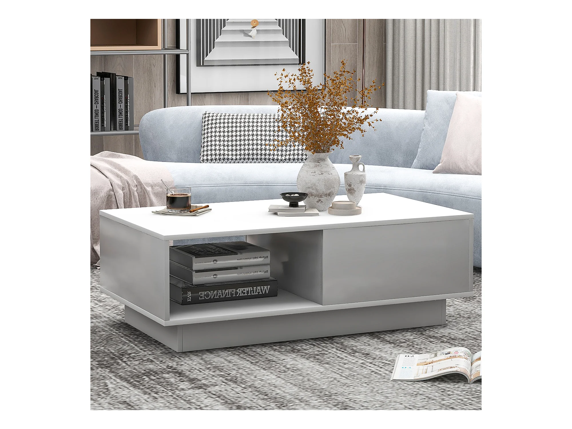 Mesa de centro moderna com gaveta e compartimentos de armazenamento, LED, lacada a branco