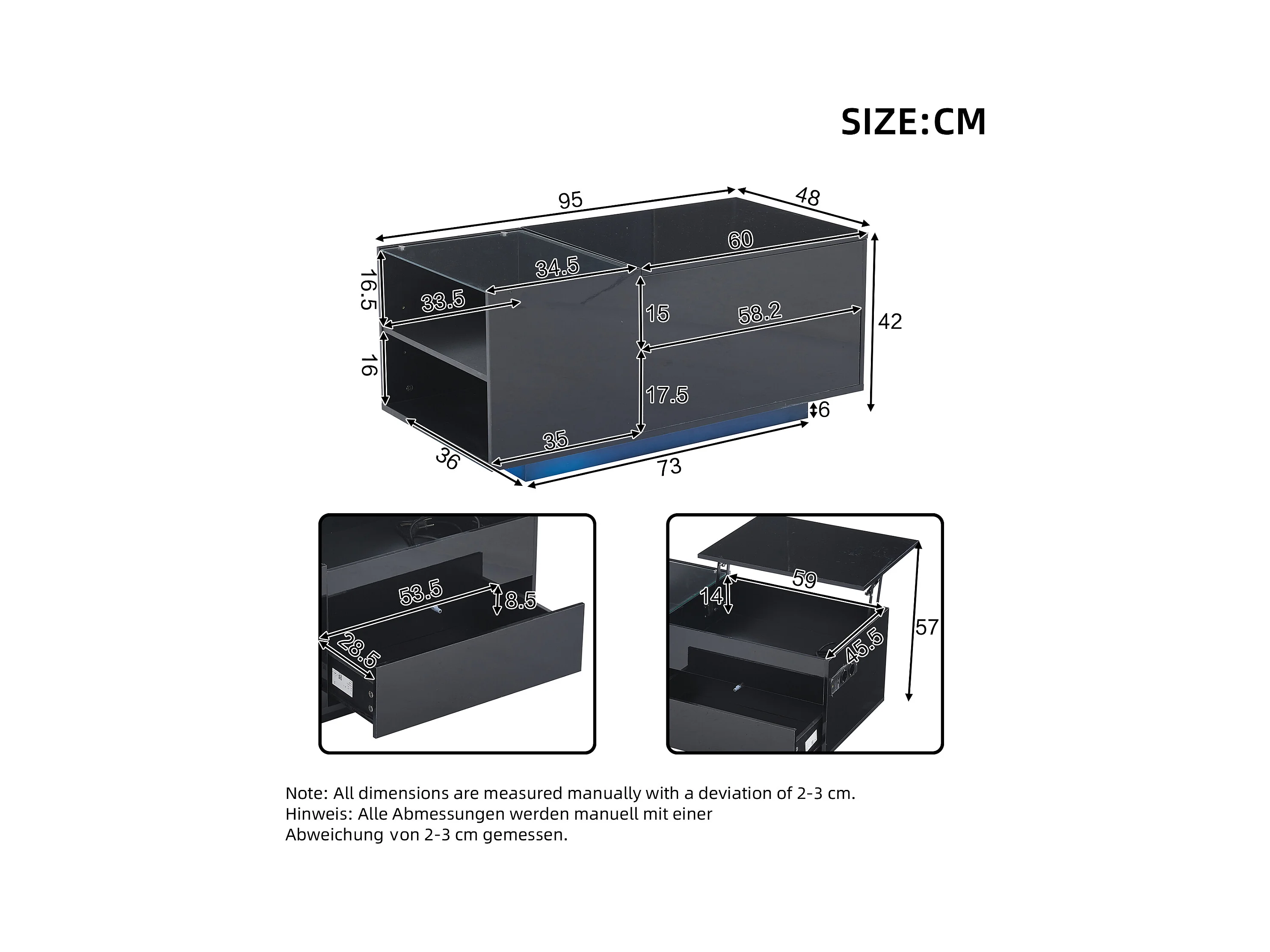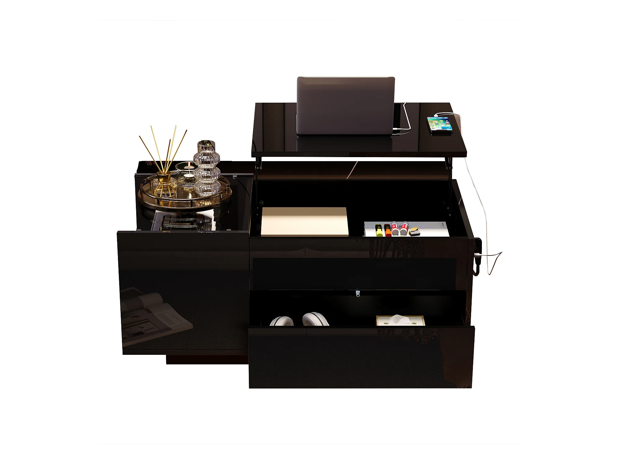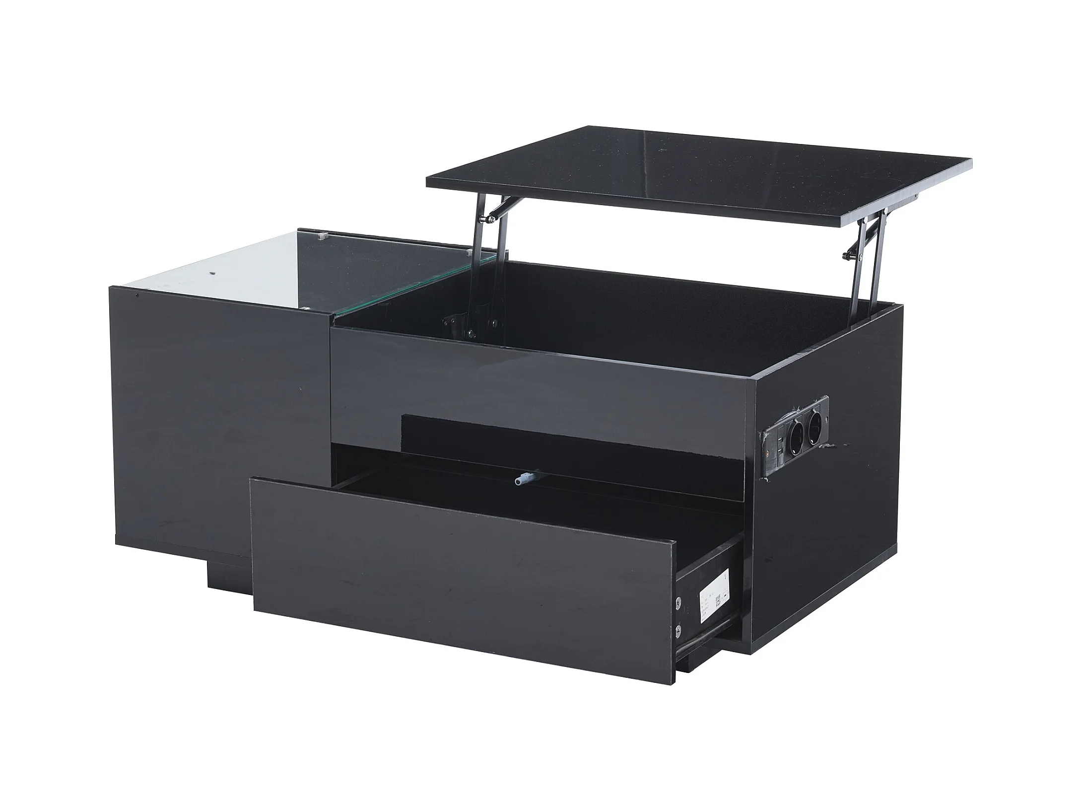 Mesa de centro preta com tampo regulável em altura - Mesa de centro com iluminação LED e 1 gaveta - Arrumação aberta