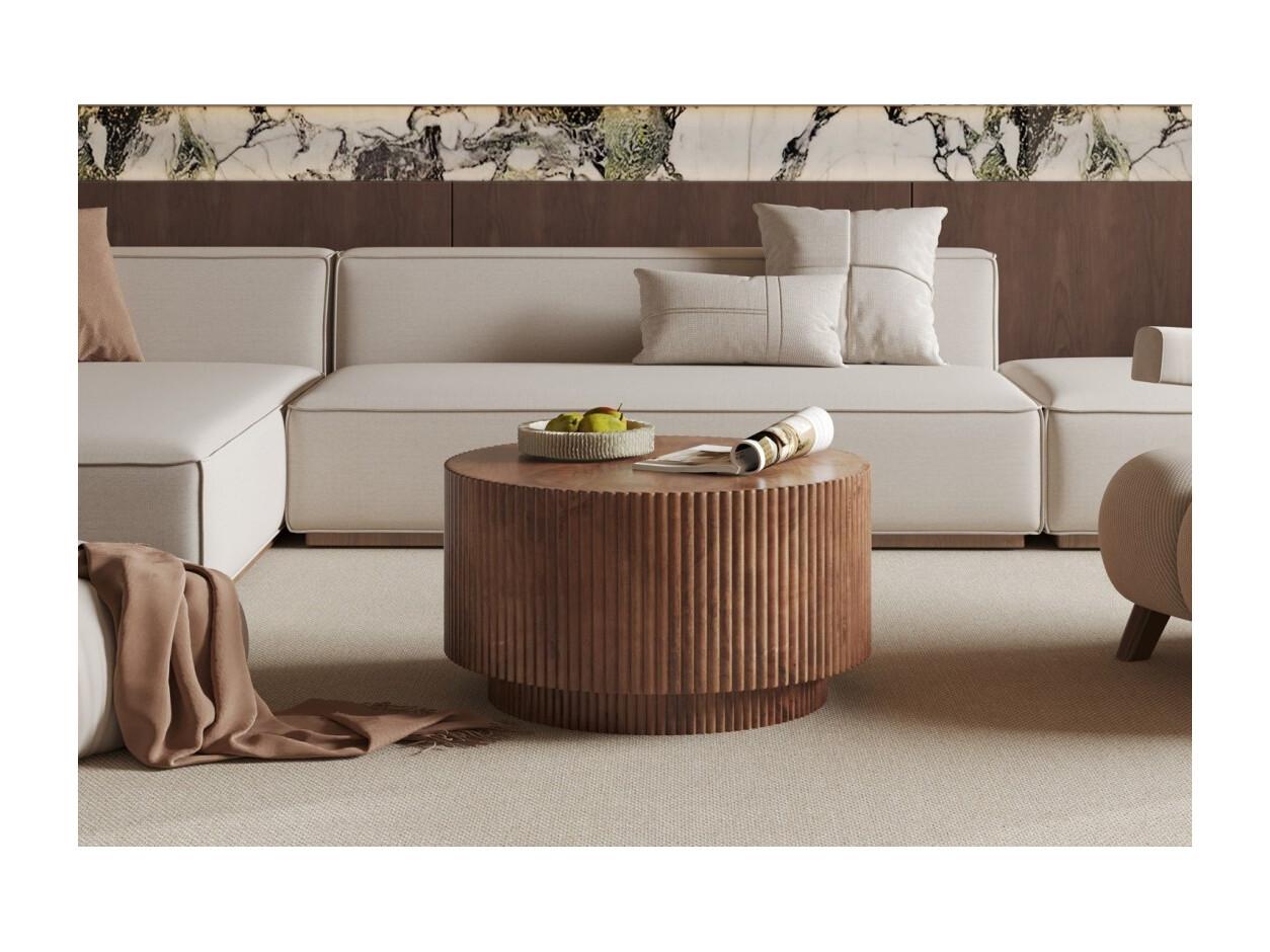 Traza calor e autenticidade ao seu interior com a mesa de centro redonda TALVORA em madeira maciça de mangueira. Com seu diâmetro de 70 cm, ela se estabelece como uma peça central refinada e acolhedora, perfeita para salas de estilo natural, boêmio ou contemporâneo.