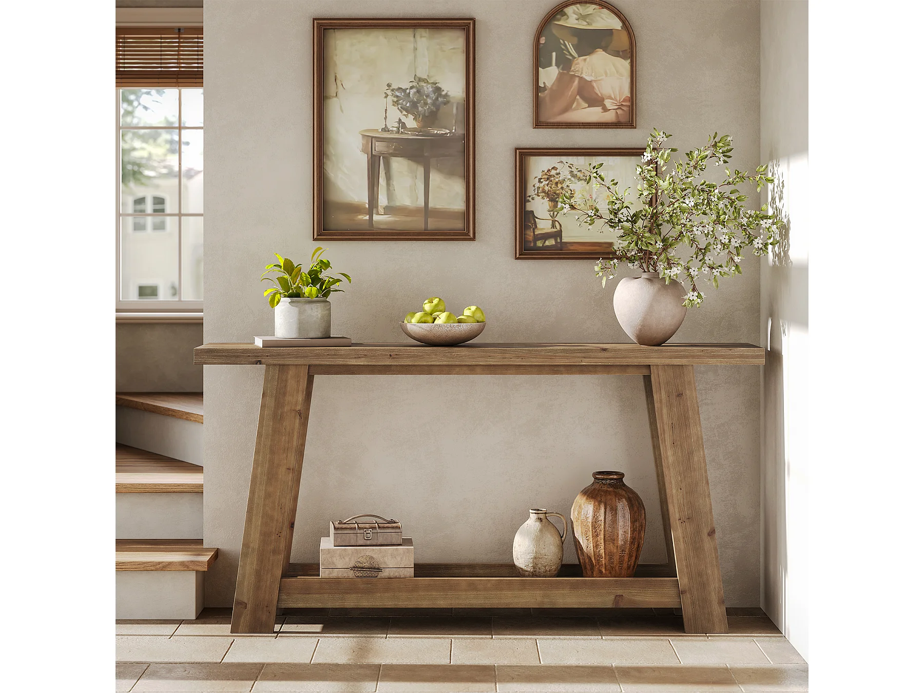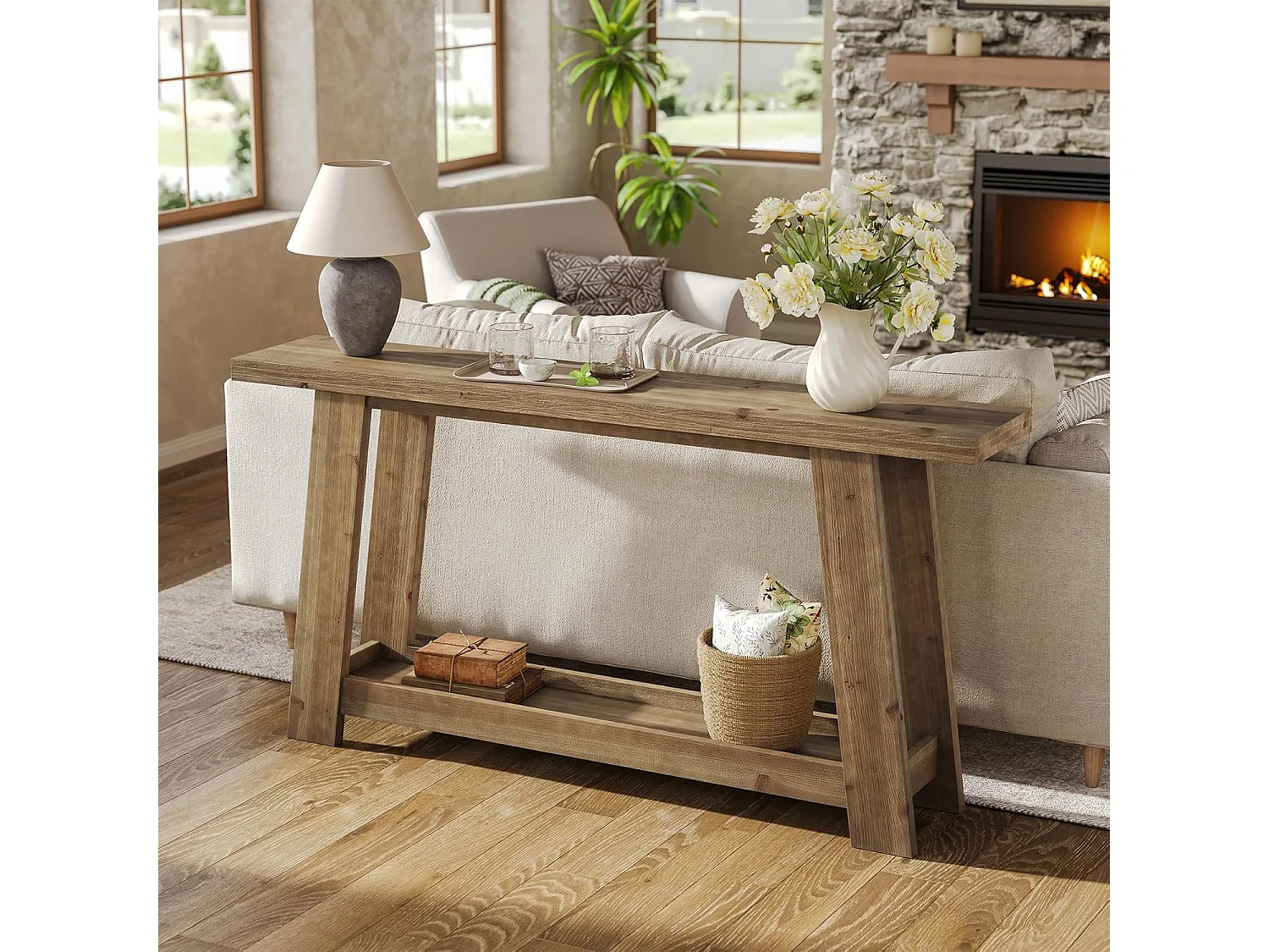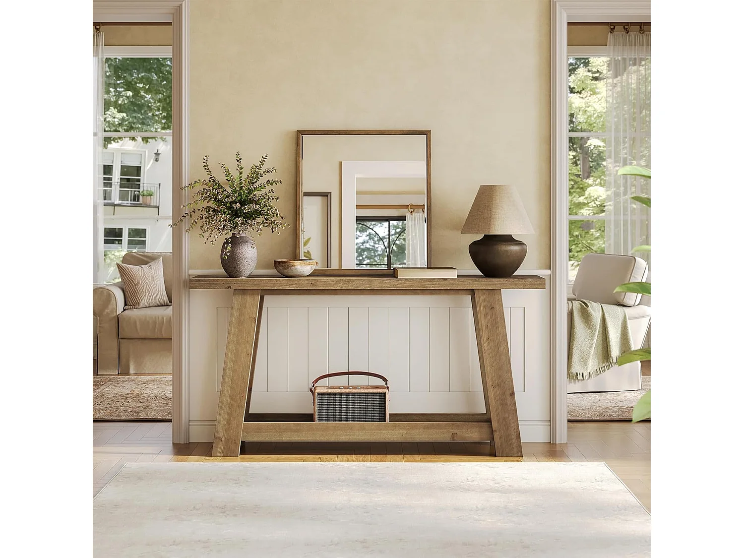 Mesa de Consola em Madeira Sólida de 160cm, Mesa de Entrada Rural com Prateleira de 2 Níveis
