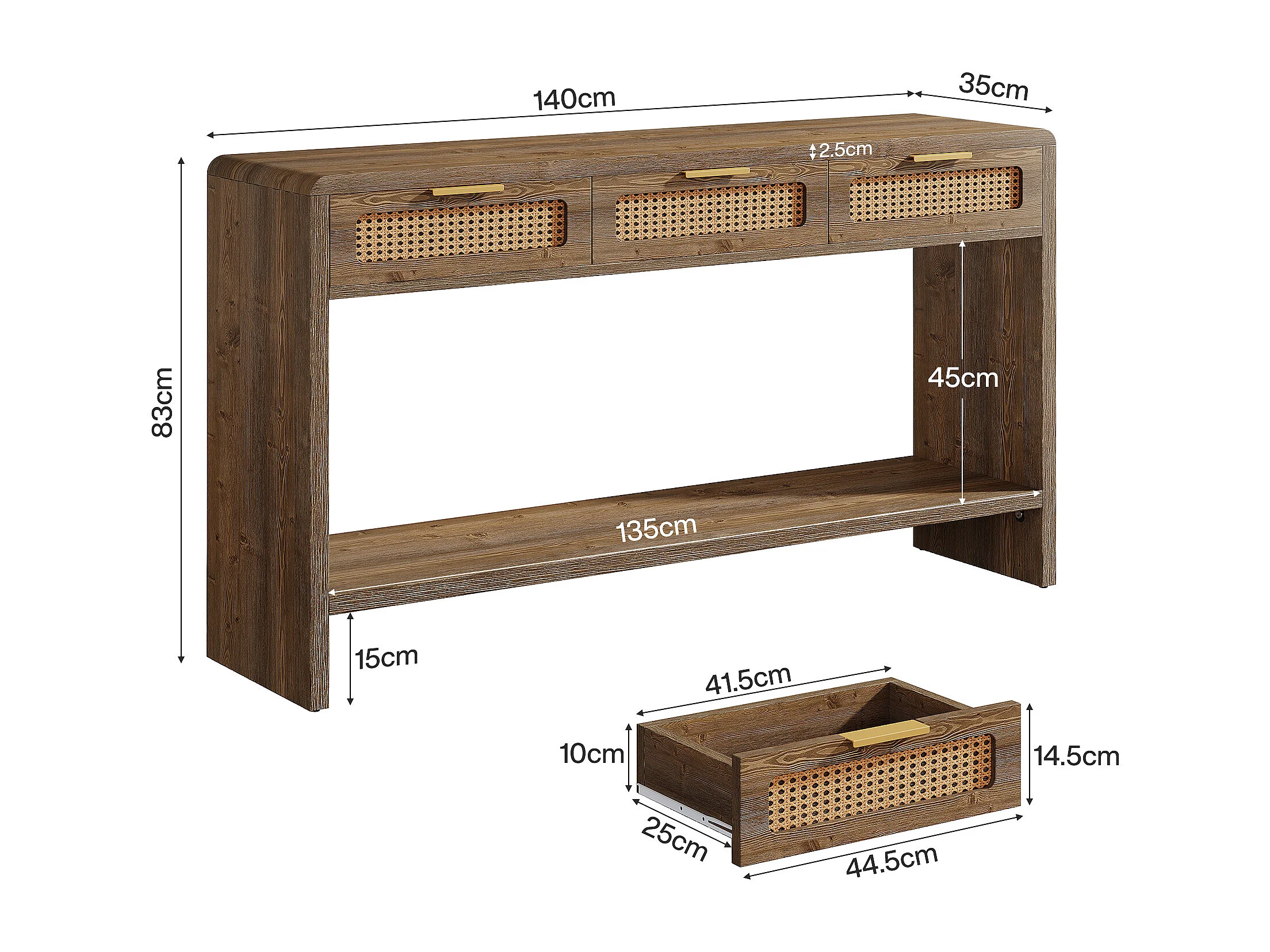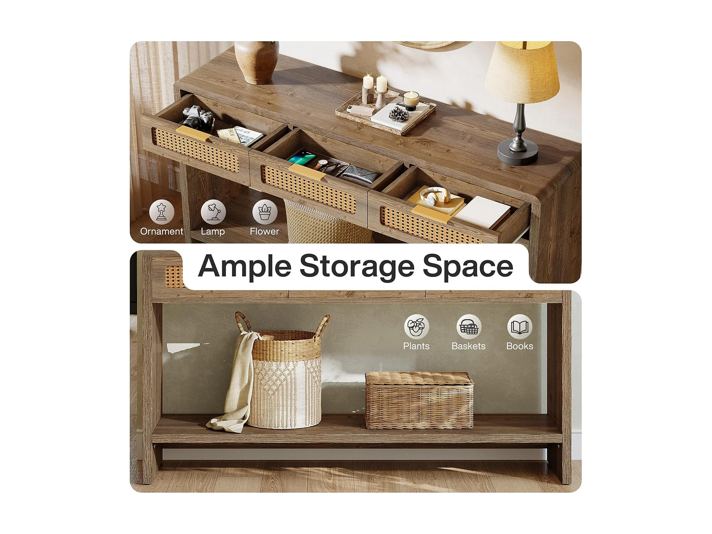 Mesa de entrada de 140 cm com 3 gavetas de rattan, mesa de console estreita para sofá com prateleira de armazenamento aberta de 2 níveis