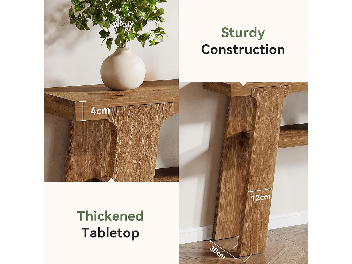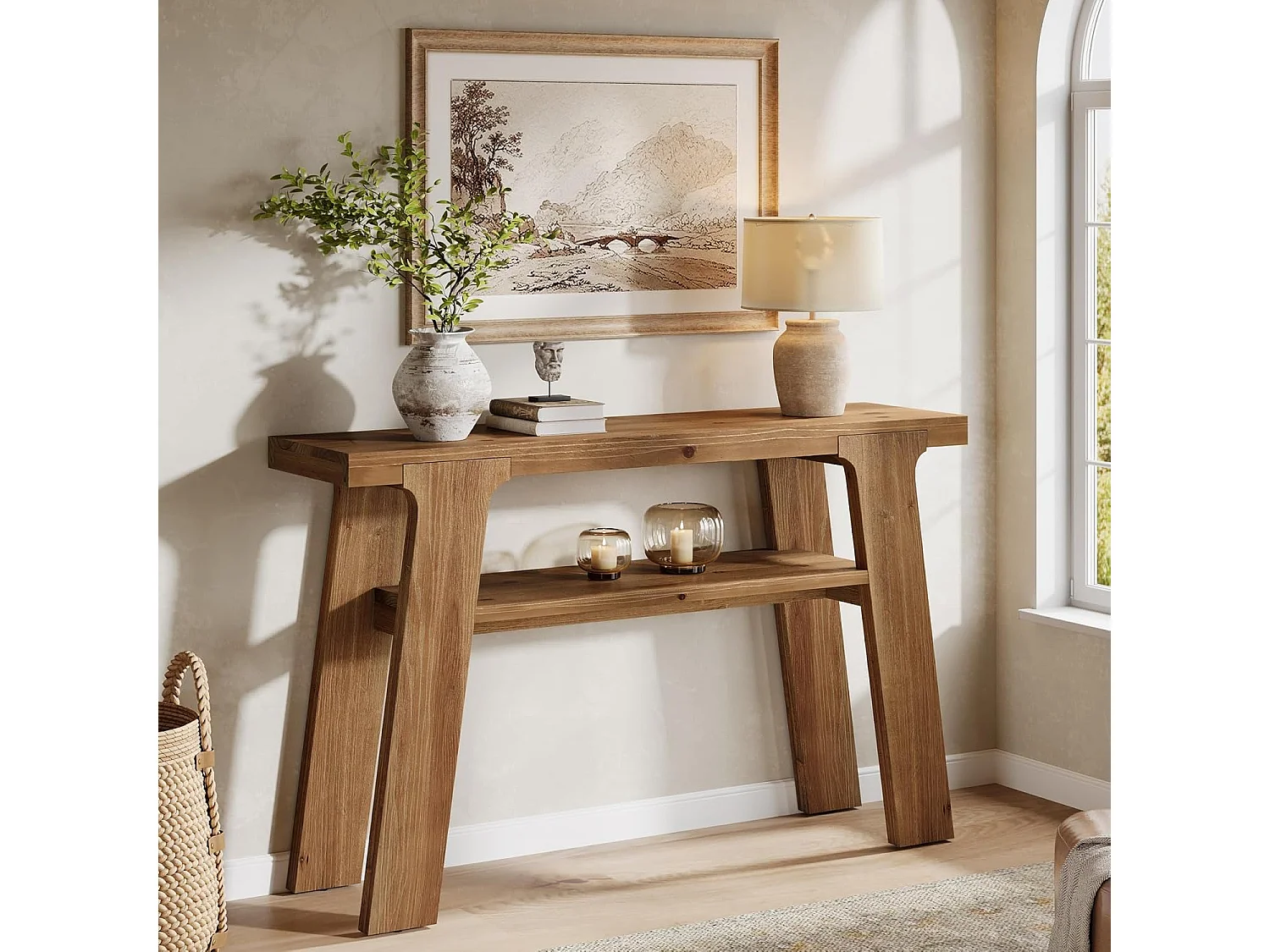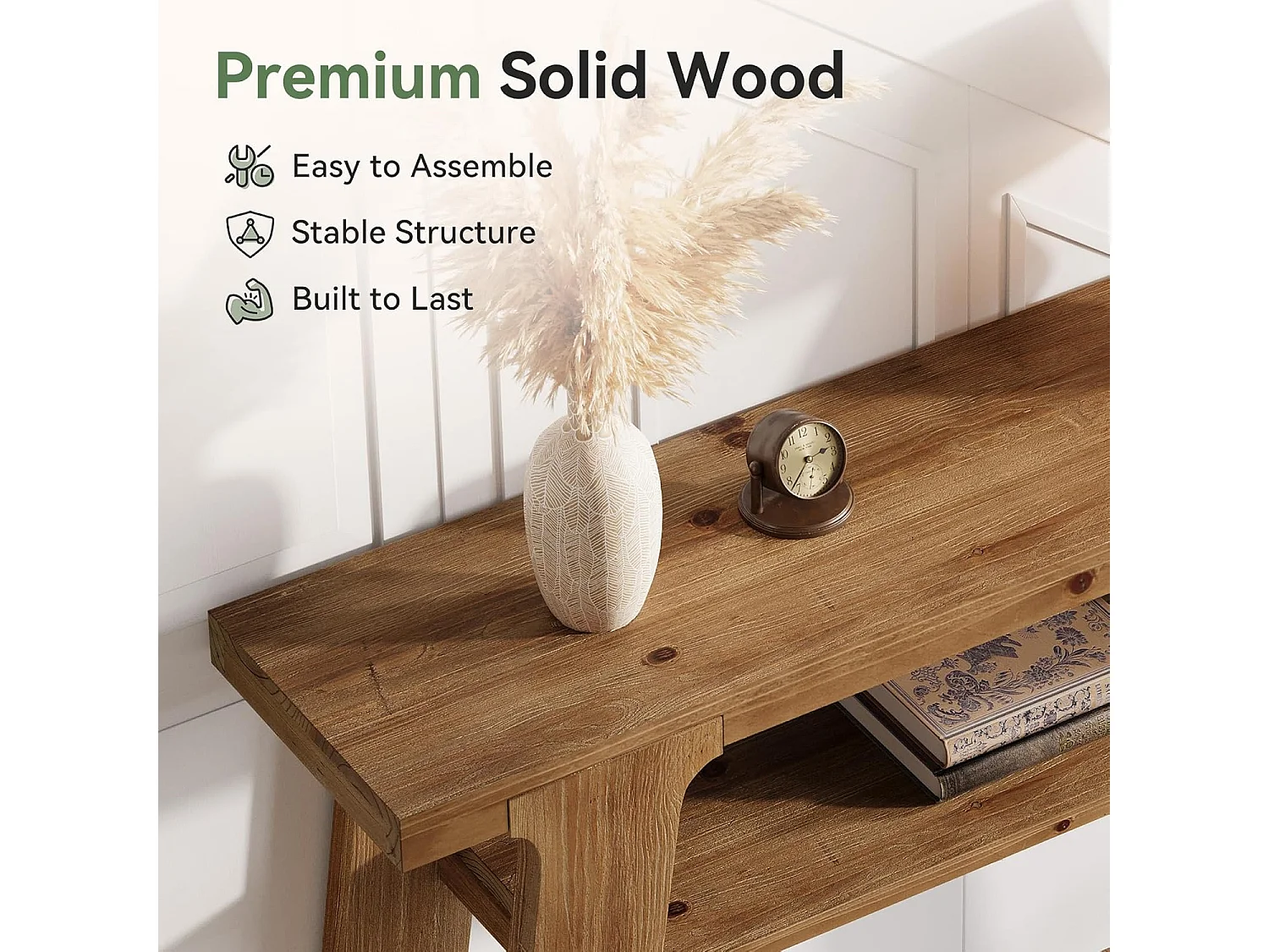 Mesa de entrada de consola de madeira maciça, mesa de sofá pequena rural de 120 cm com armazenamento de 2 níveis