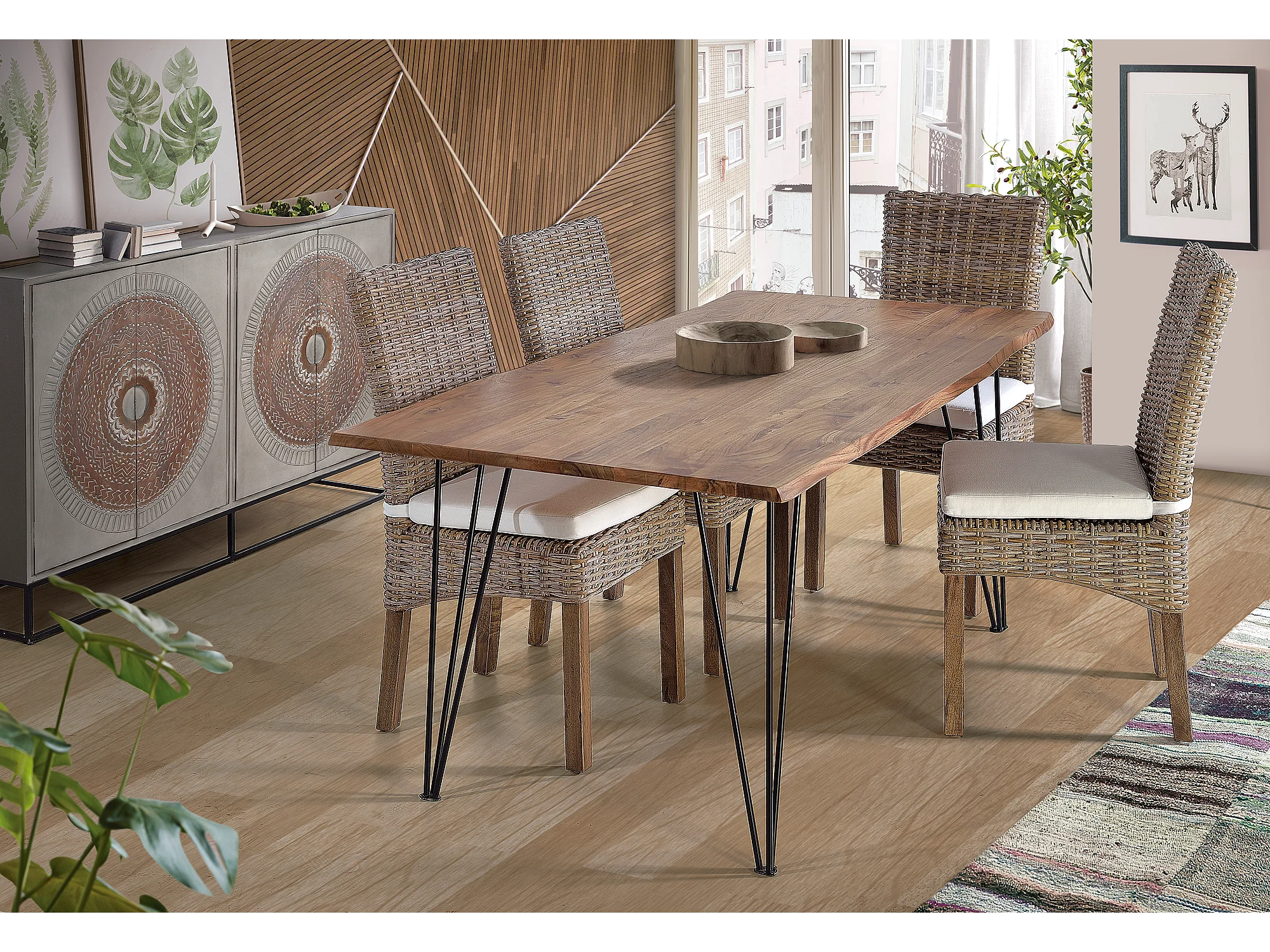 Mesa com manjedoura em madeira de acácia natural e pés de metal para 6 pessoas.