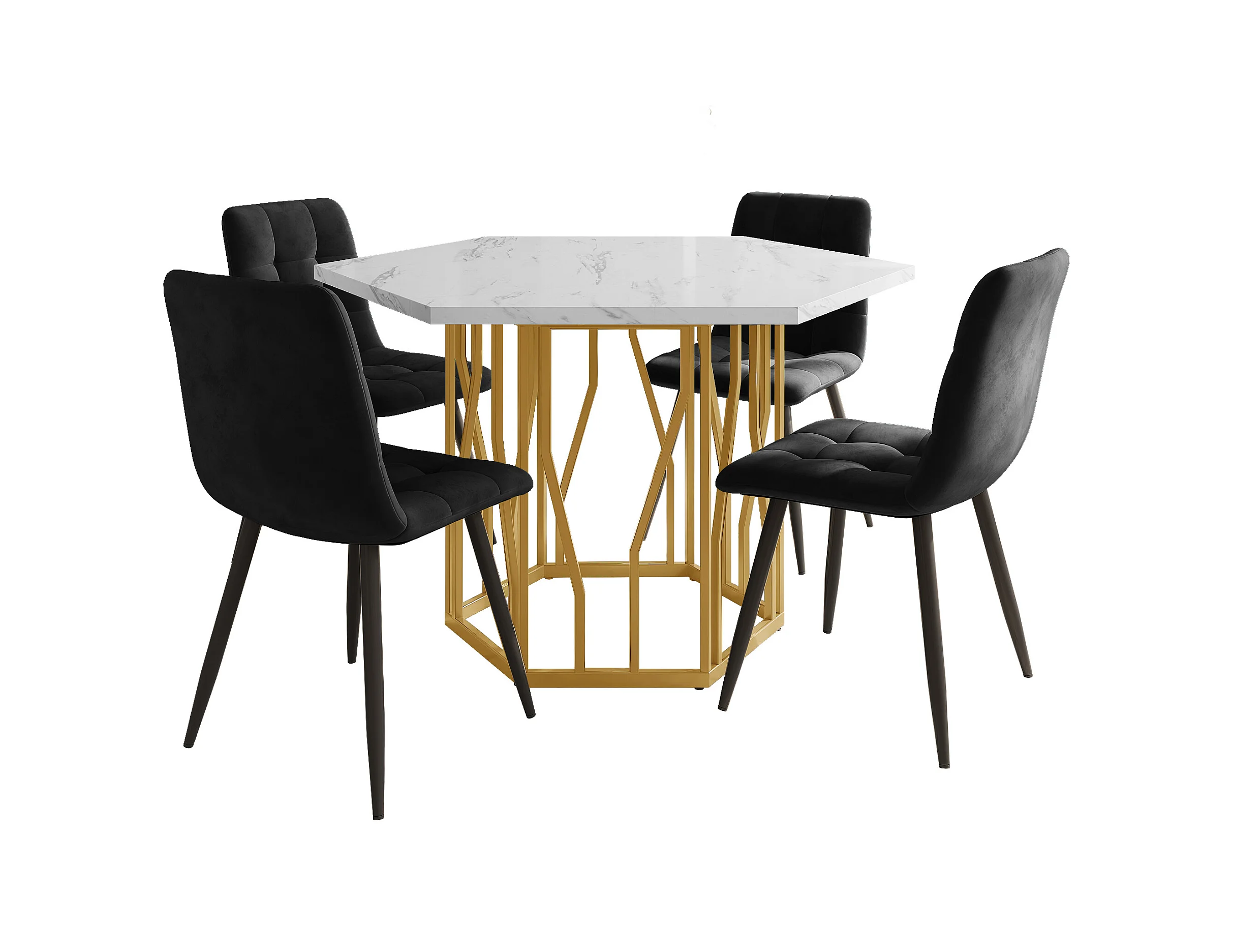 Mesa de jantar hexagonal com efeito mármore branco 115x100 cm com 4 cadeiras de veludo preto com pernas douradas