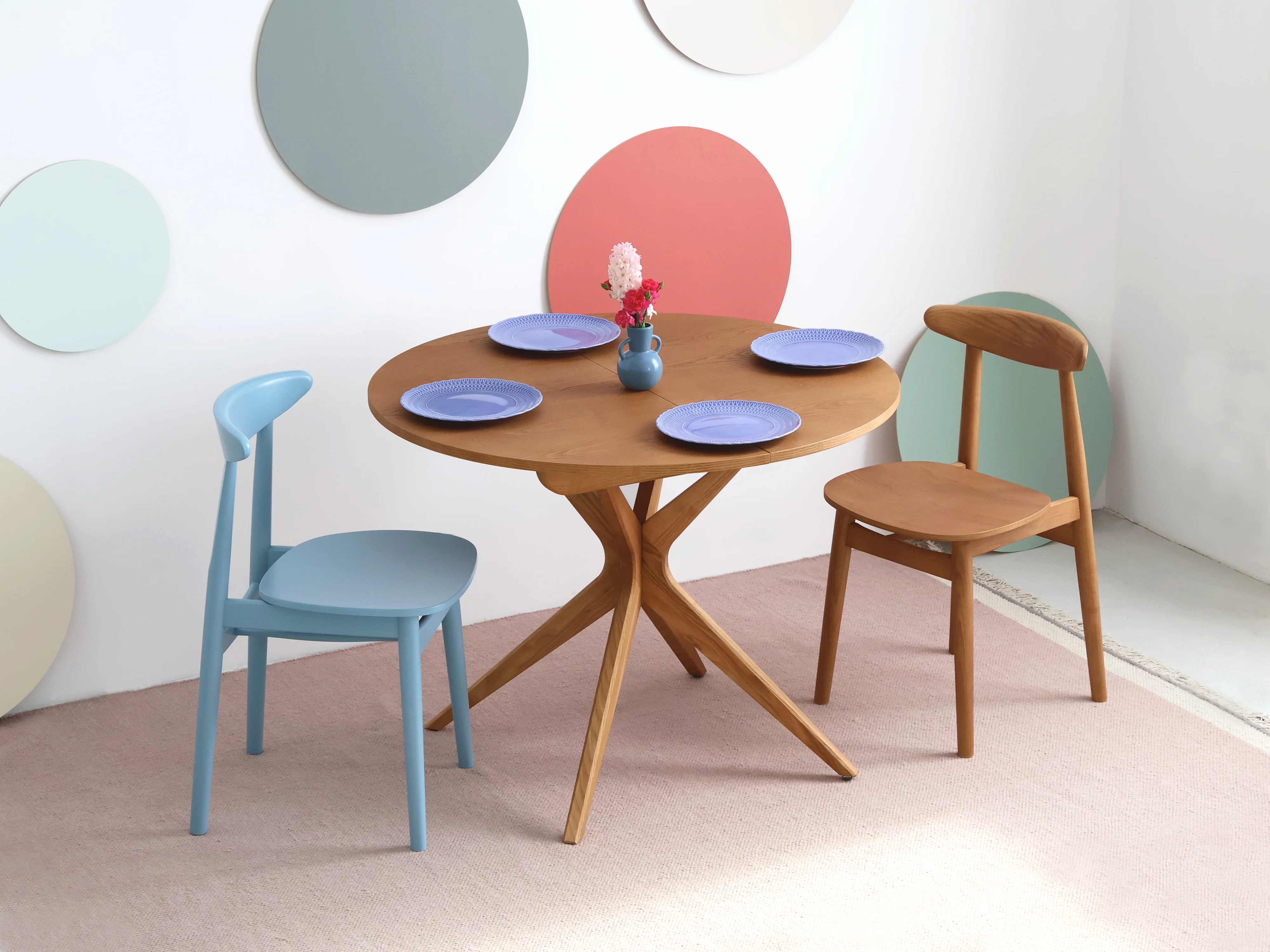 Mesa de jantar redonda extensível 100 cm para 5 pessoas, Jubi, folheada em freixo tingido de carvalho | Pés em madeira maciça de freixo tingidos de carvalho