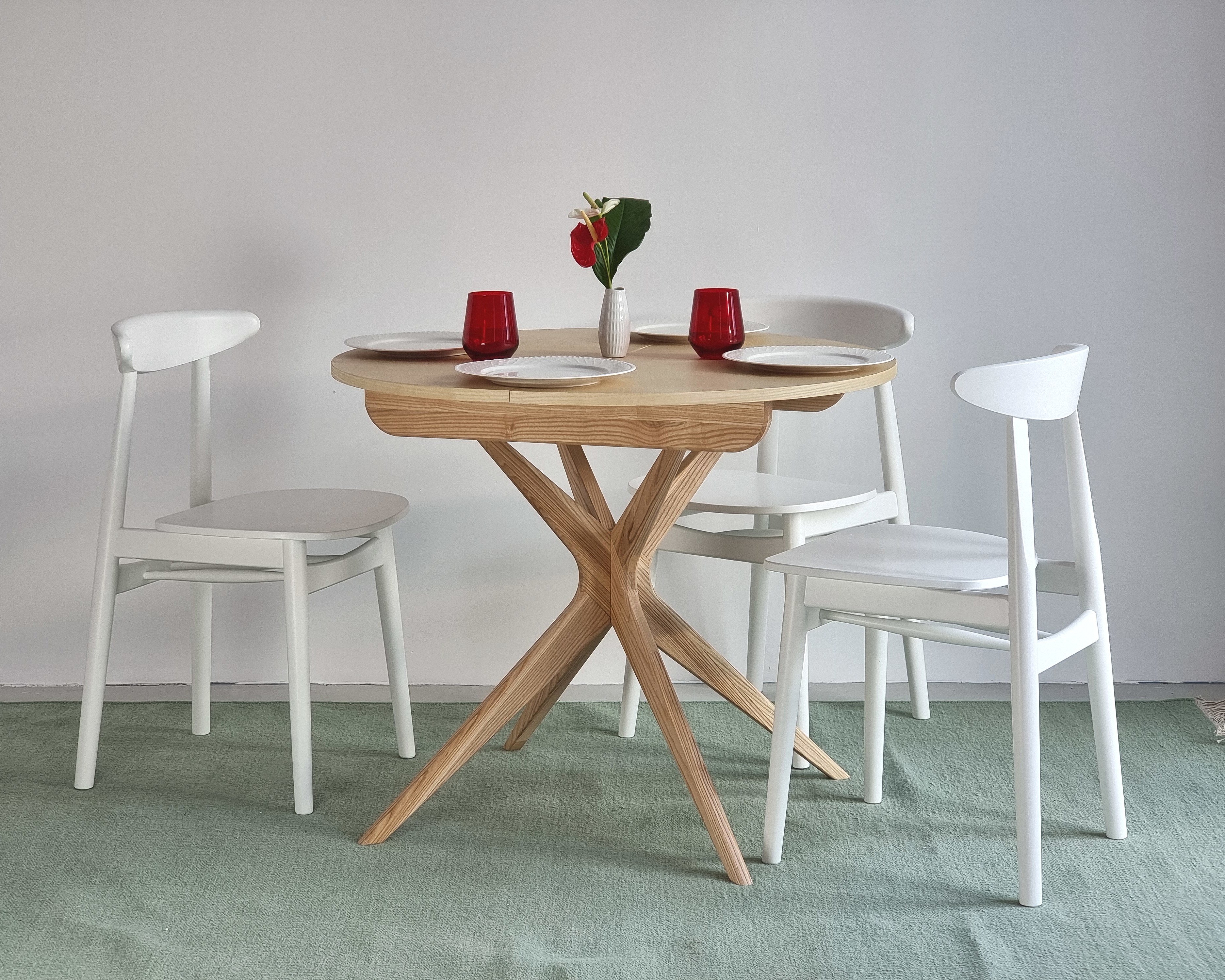 Mesa de jantar redonda extensível 90cm Jubi Branco Giz | Pé em freixo tingido de carvalho