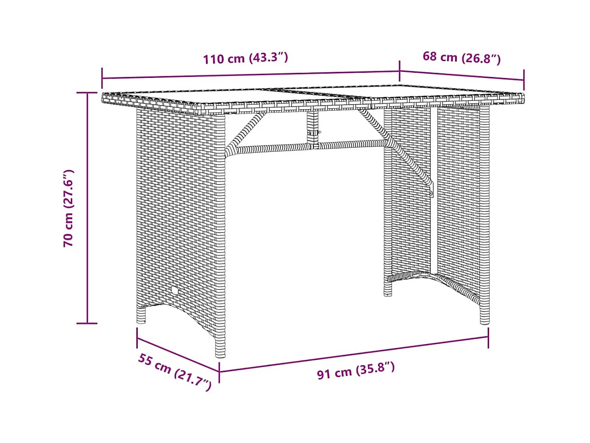 Mesa de jardim com tampo de vidro 110x68x70 cm vime PE bege