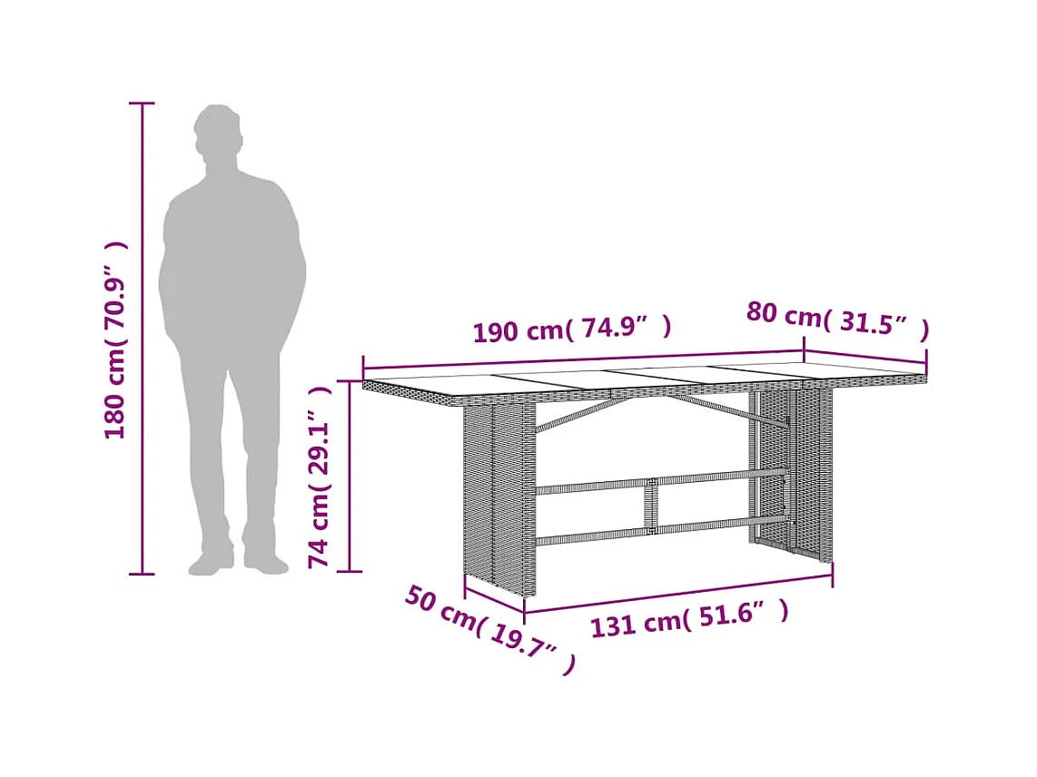 Mesa de jardim com tampo de vidro 190x80x74 cm vime PE castanho