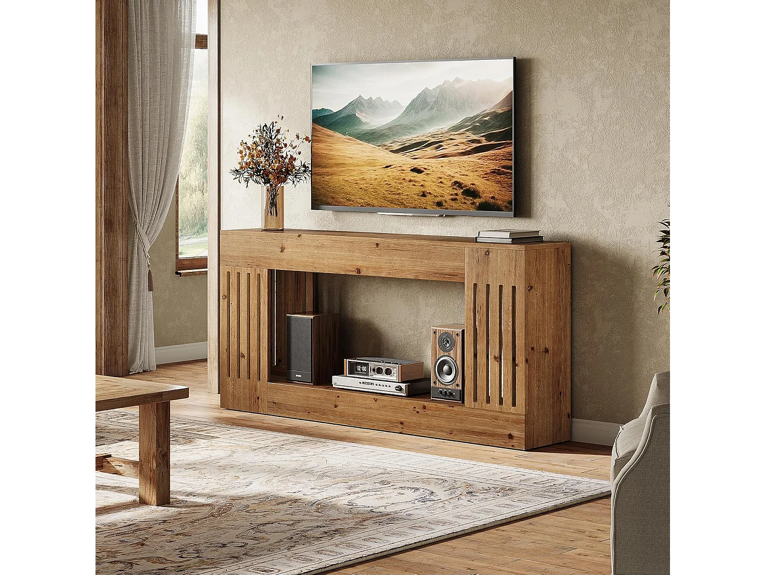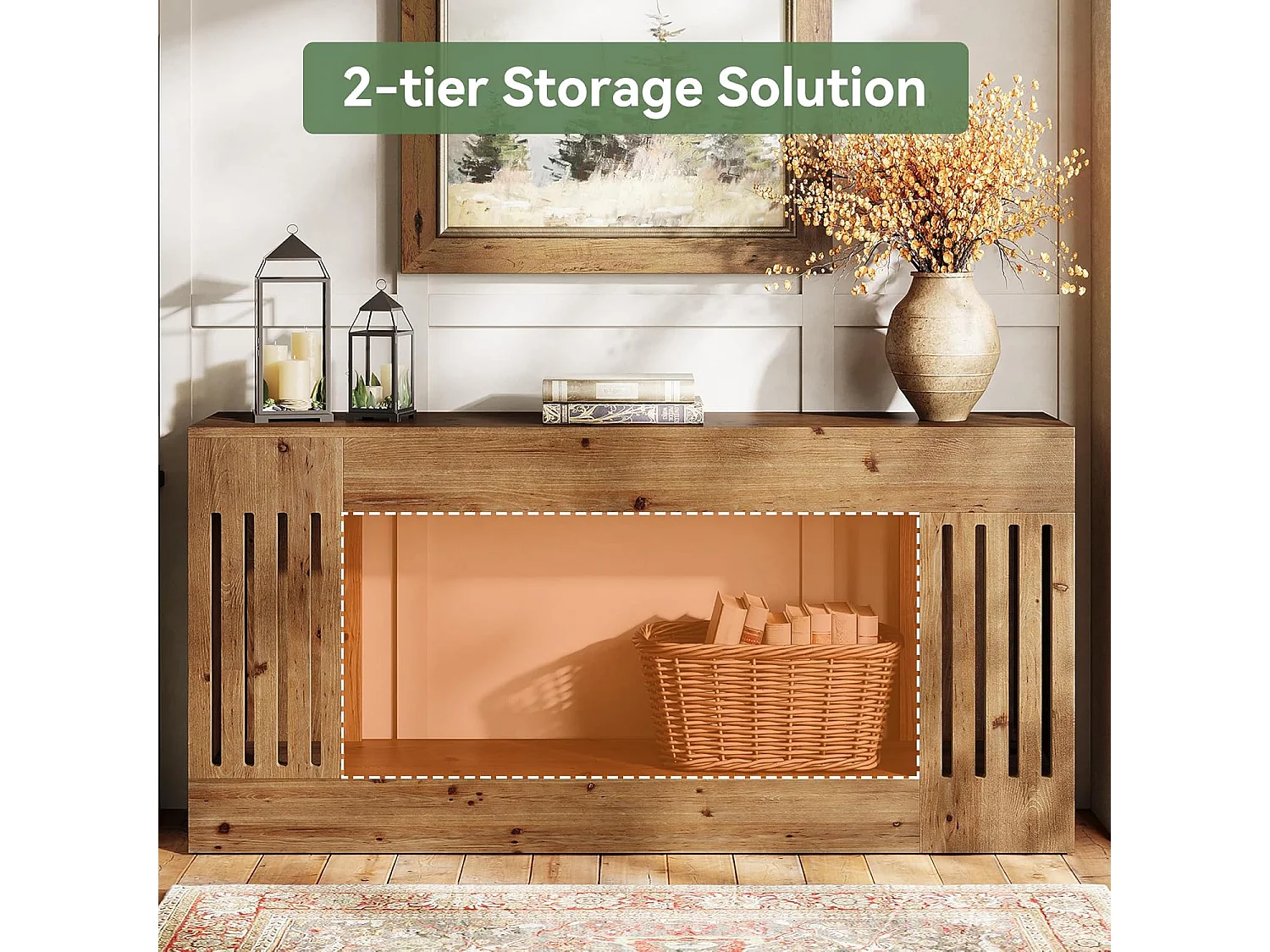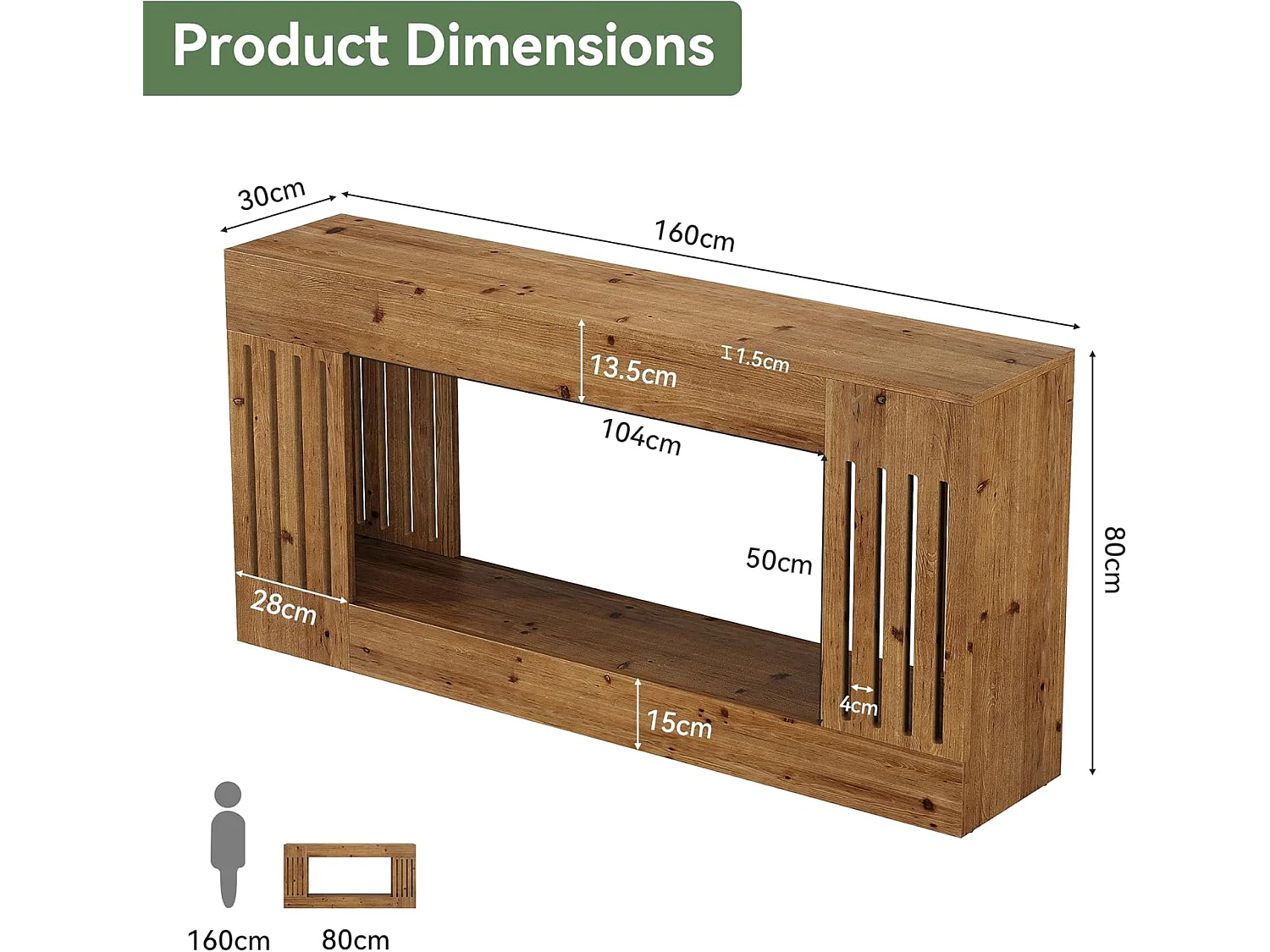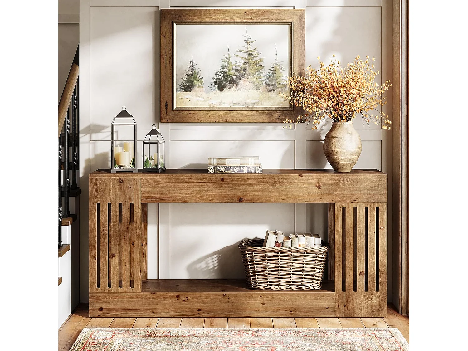 Mesa de Sofá de Madeira Sólida de 160cm, Mesa de Consola Rustica atrás do Sofá com Pernas de Listras Verticais, 2 Andares