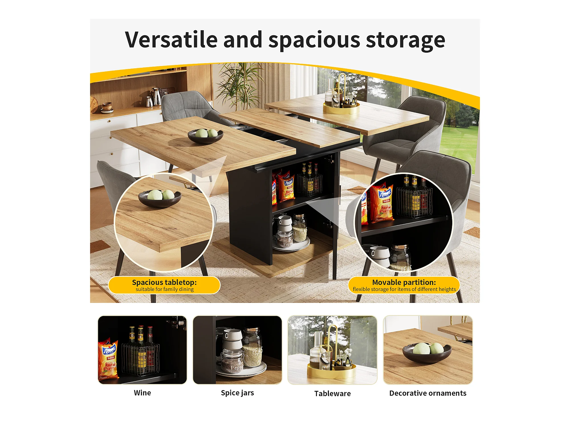 Mesa extensível de MDF com prateleiras de 3 níveis para cozinha e sala de estar 110-140×80cm natural e preto