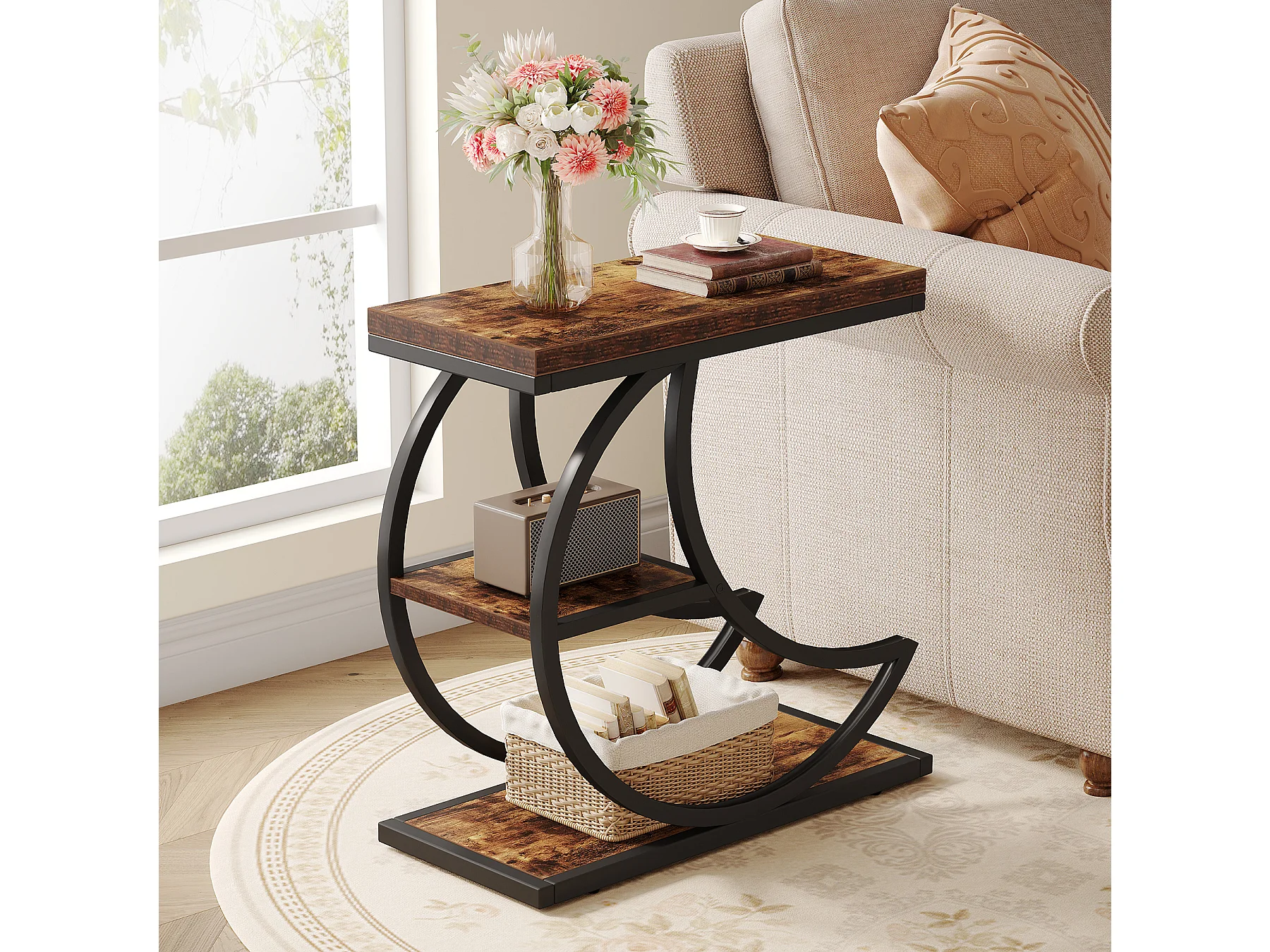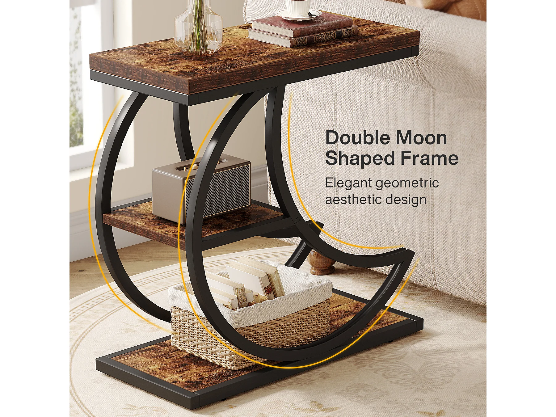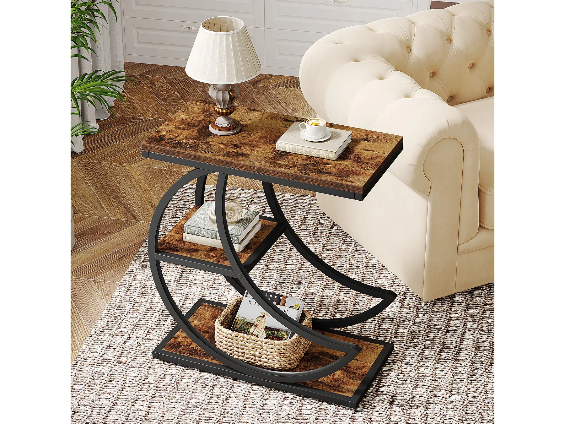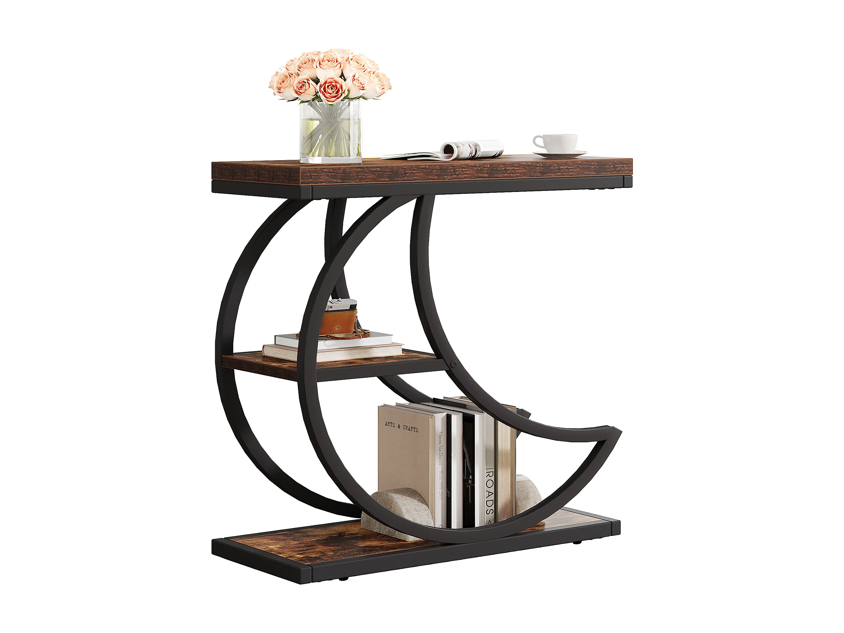 Mesa Lateral de 3 Camadas, Mesas Laterais Industriais com 3 Prateleiras de Armazenamento, Mesa Lateral de Sofá com Moldura de Metal em Meia Lua Crescente