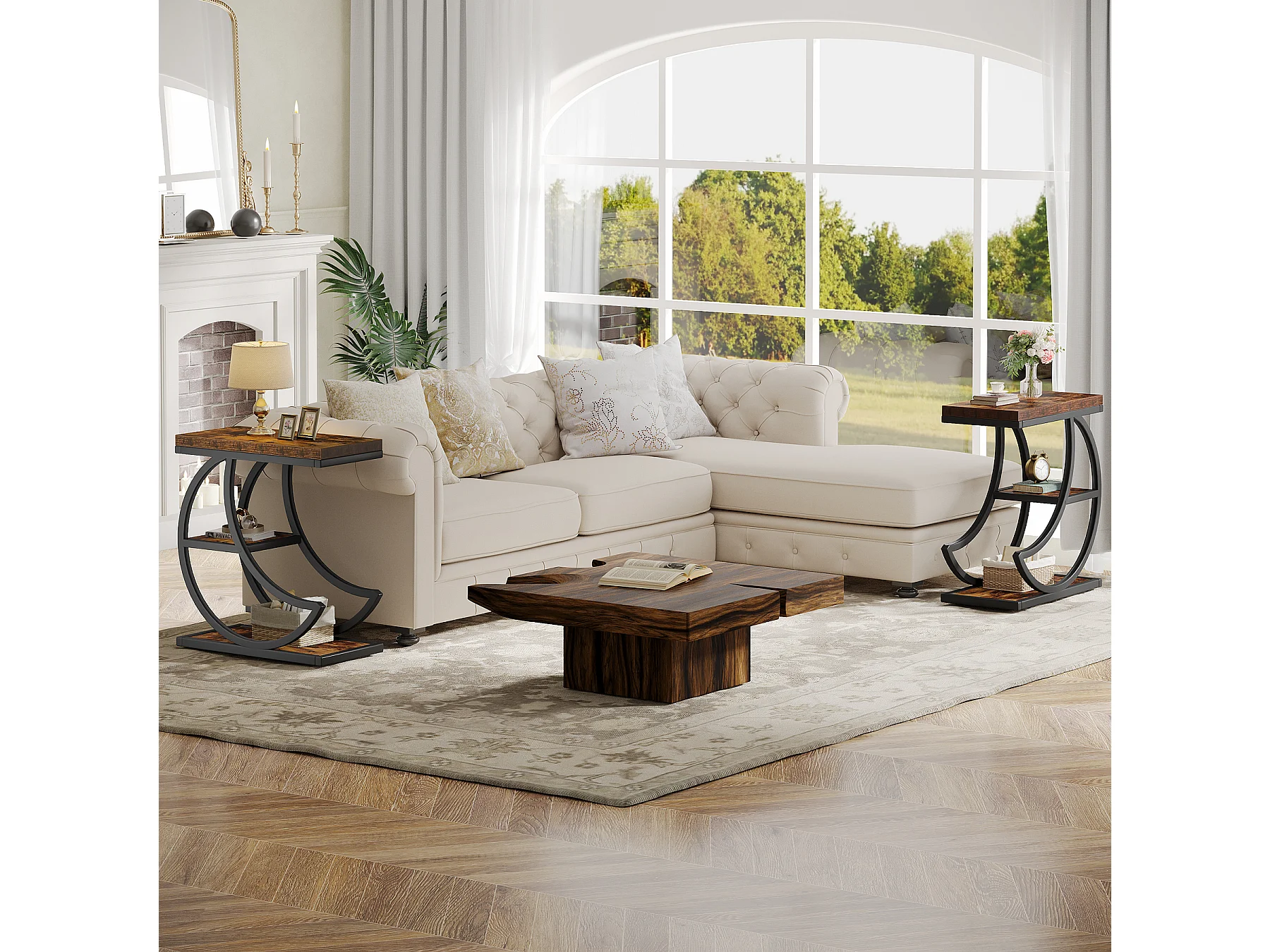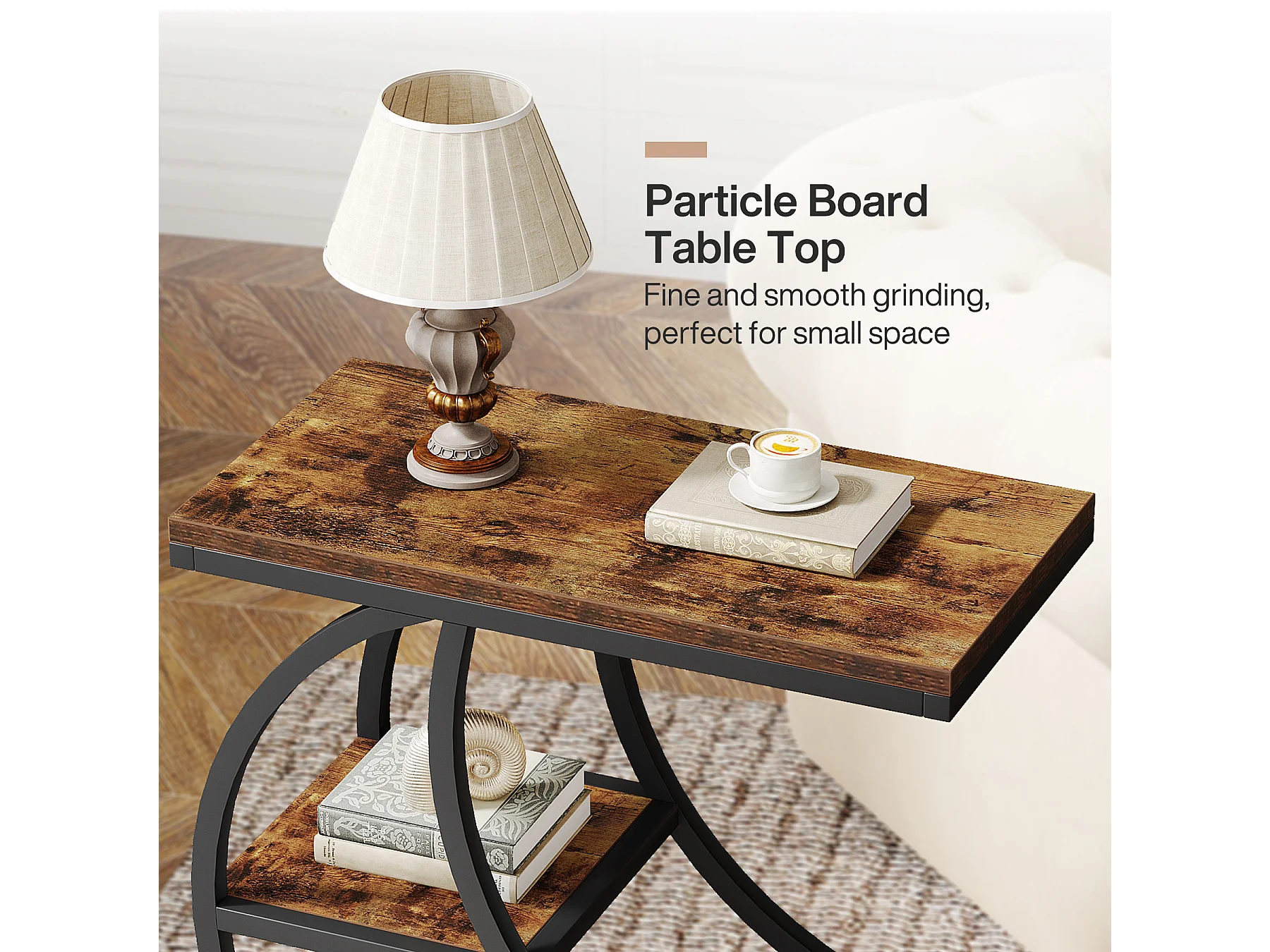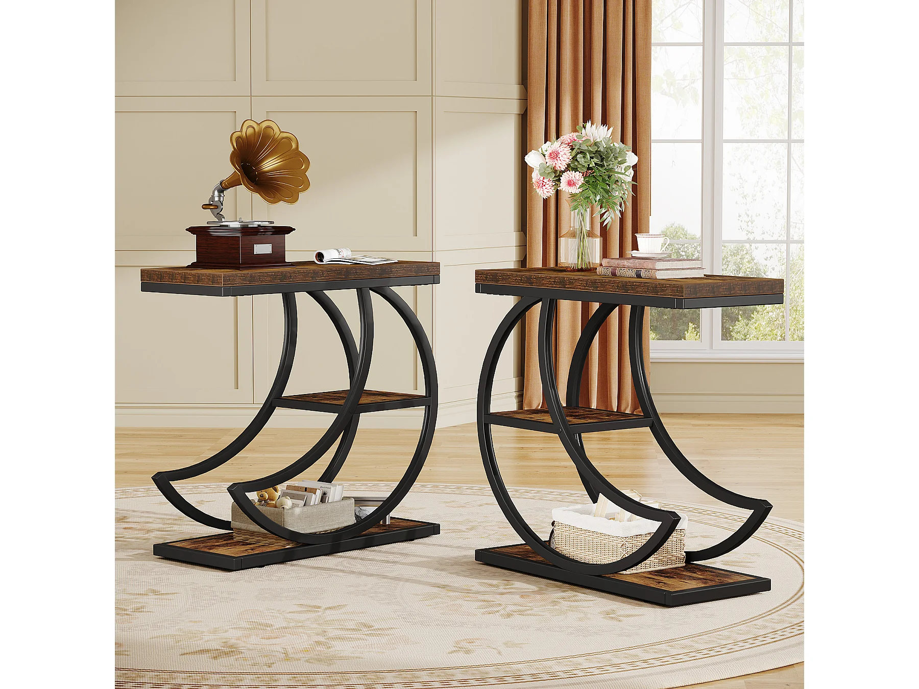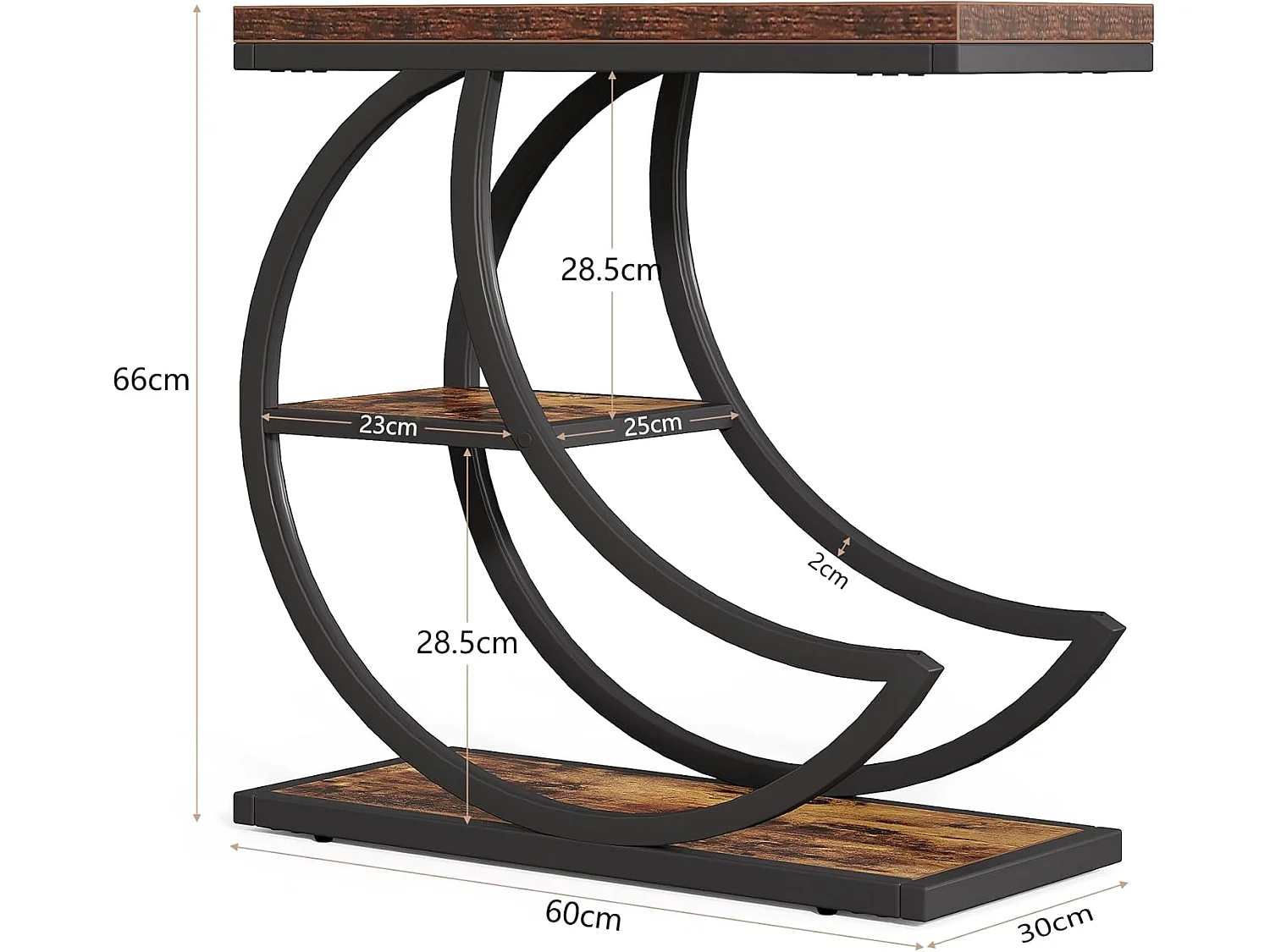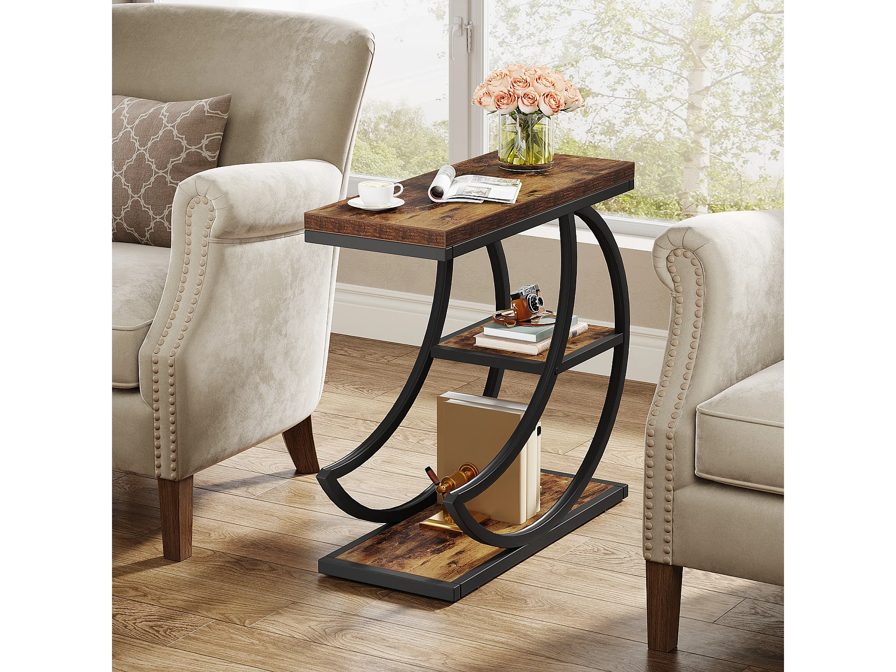 Mesa Lateral de 3 Camadas, Mesas Laterais Industriais com 3 Prateleiras de Armazenamento, Mesa Lateral de Sofá com Moldura de Metal em Meia Lua Crescente