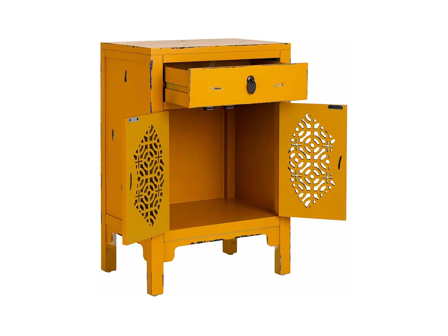 Mesinha de madeira lacada amarela com 1 gaveta e 2 portas 48x32x70h cm