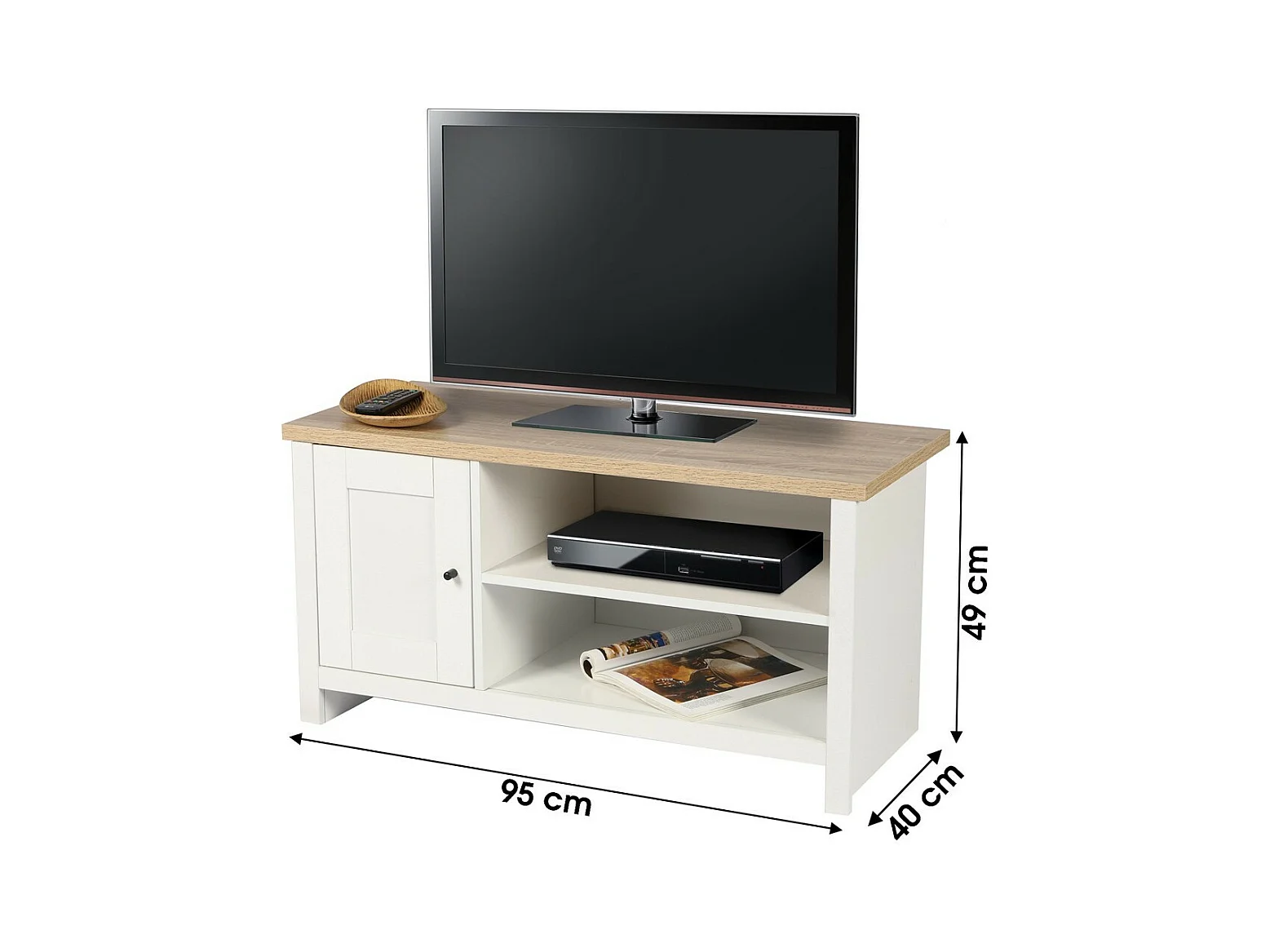 Meuble TV avec 2 niches et 1 porte design colonial – 95x40xH49 cm, coloris blanc et plateau chêne clair – Collection MADERA