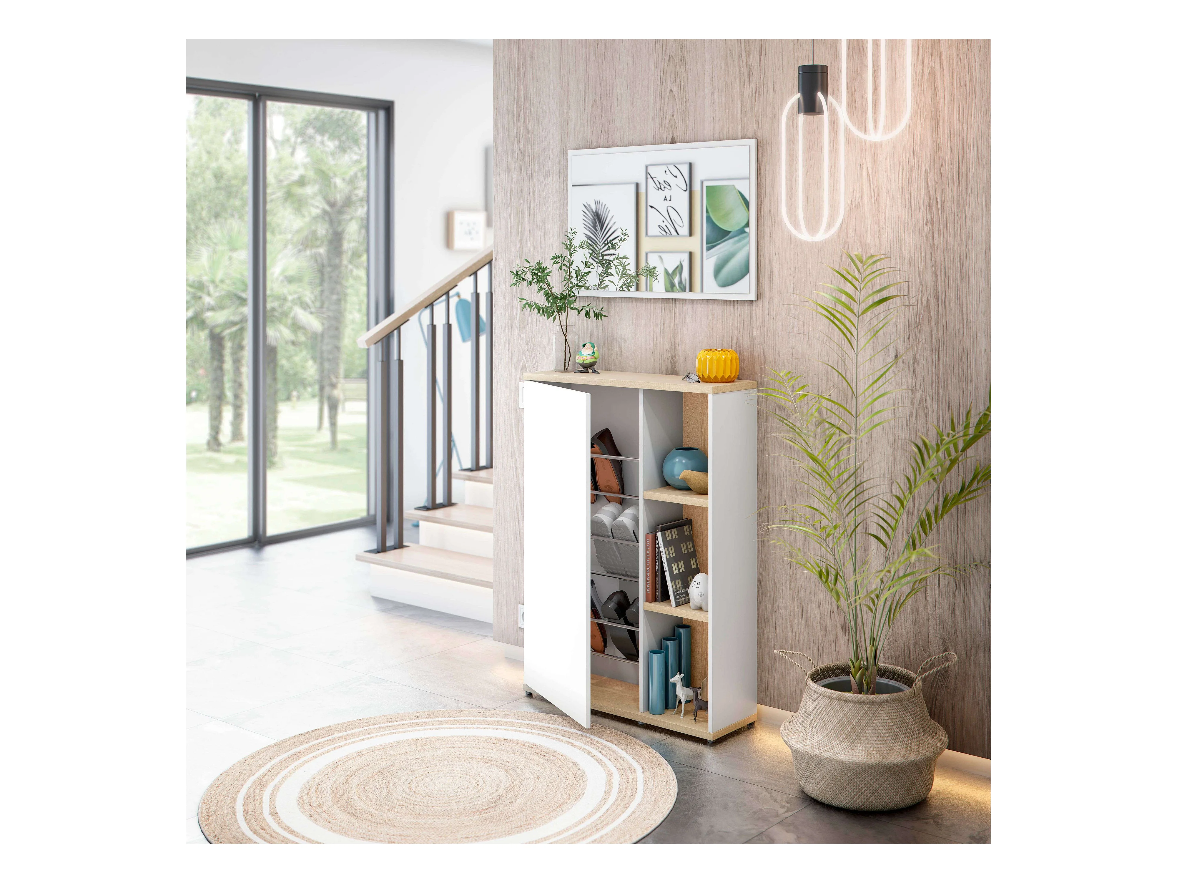 Móveis de corredor Adhara com espelho nórdico em branco/carvalho, 1 porta, 2 prateleiras