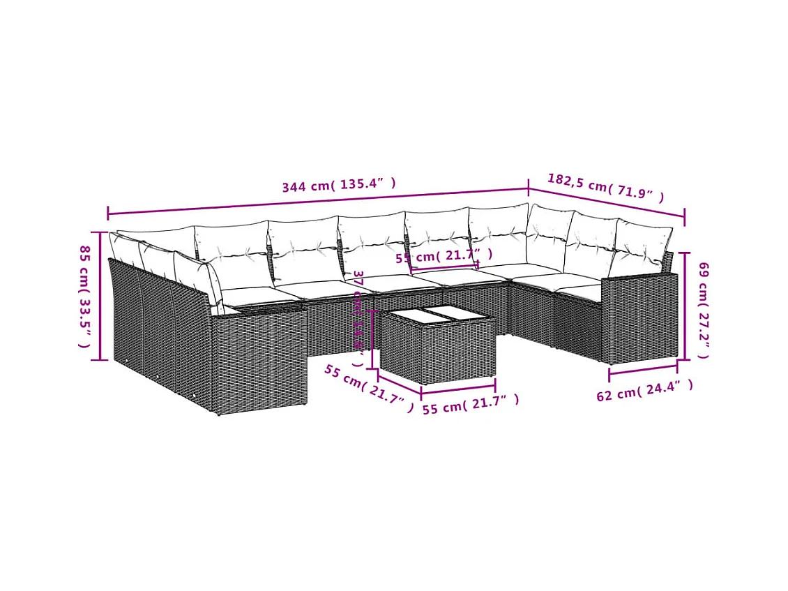 Conjunto de móveis de jardim de 10 peças com almofadas marrons em resina trançada
