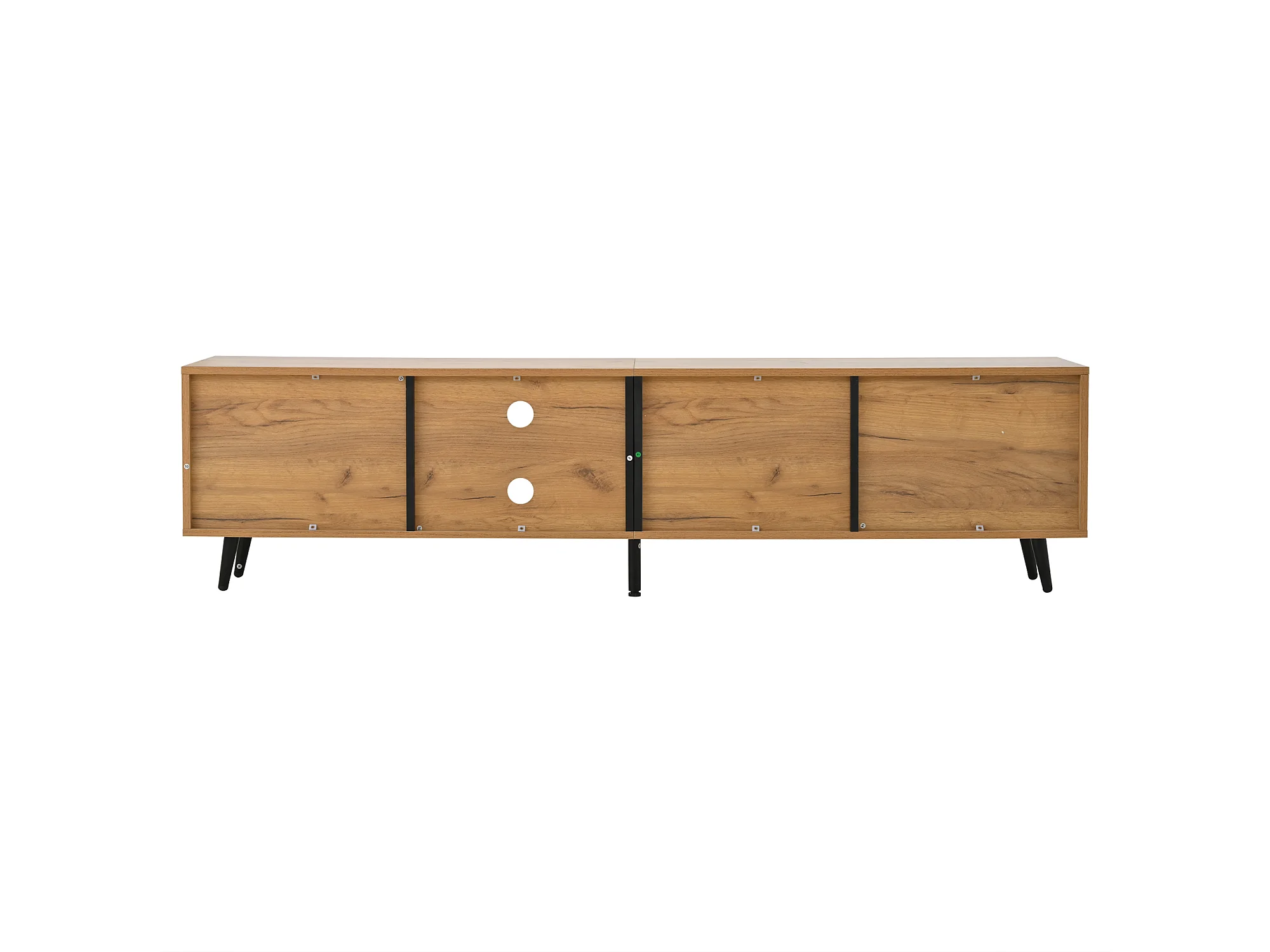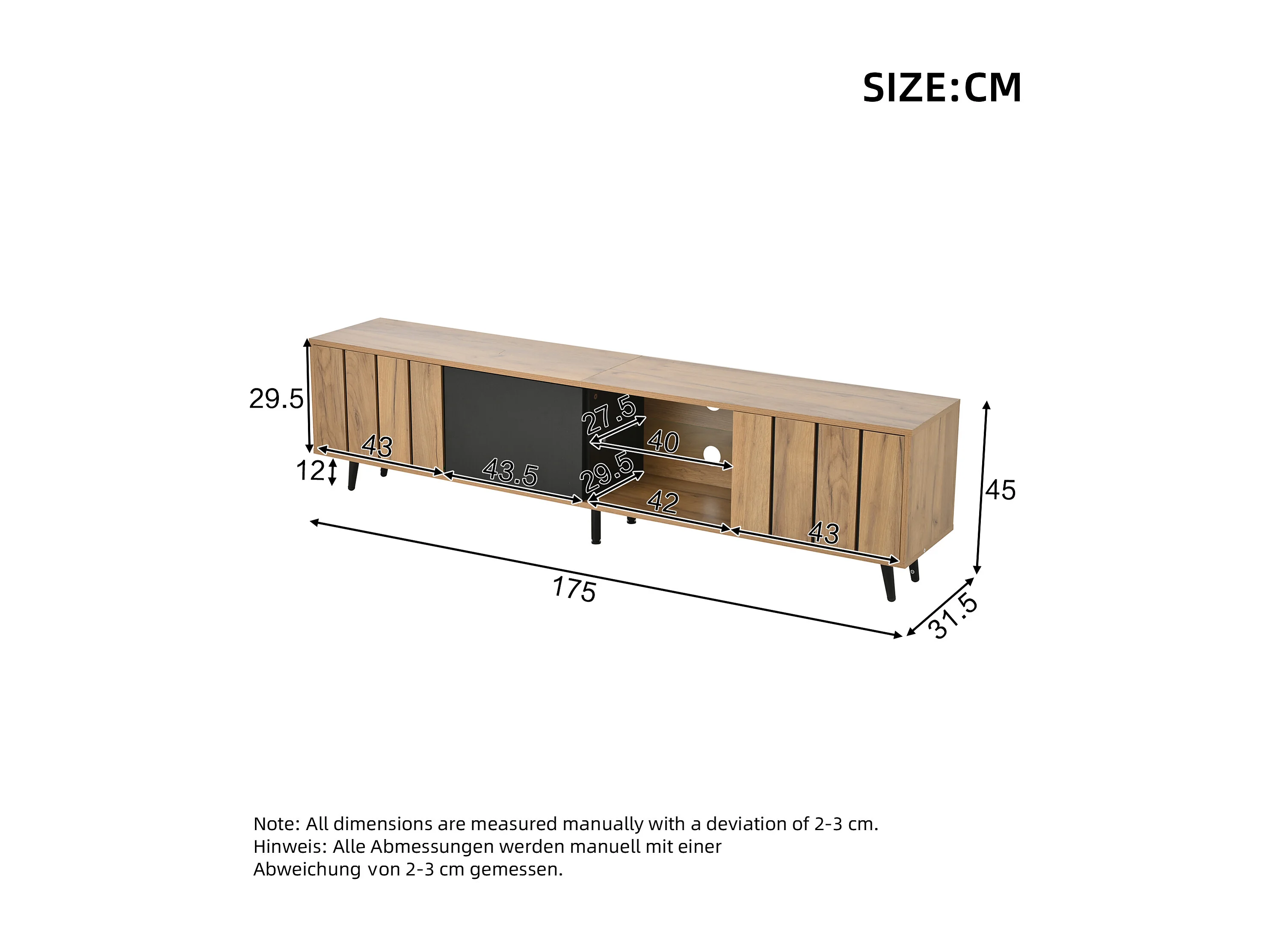Móvel baixo para TV, 175×31,5×45 cm, 3 armários, madeira natural e preto, para TVs de até 75 polegadas, sala de estar.
