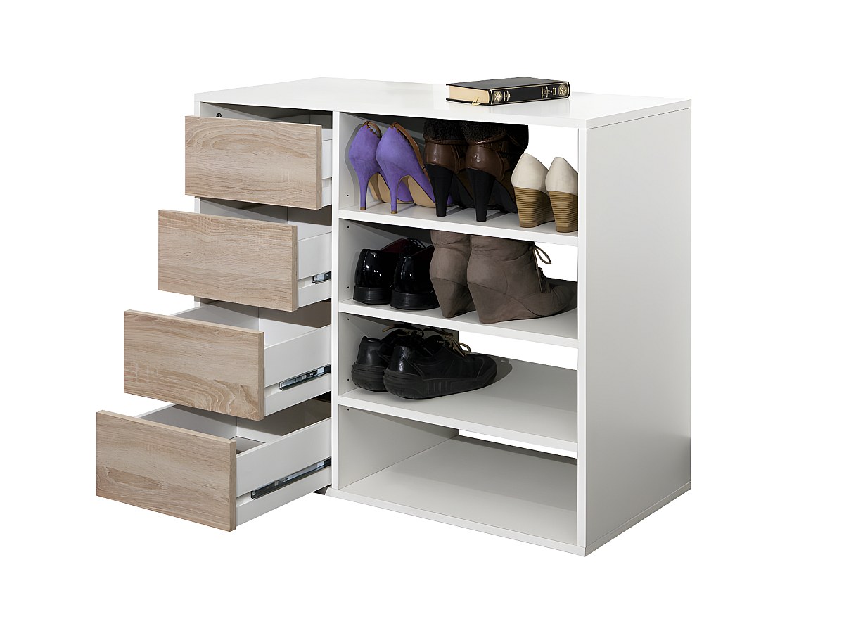 O móvel de arrumação EMERIC é dotado de 4 gavetas e de 4 nichos para lhe permitir arrumar o que achar melhor! As estantes são ajustáveis em altura, podendo, desta forma, modular estas em função das suas necessidades (ideal para os sapatos alto).