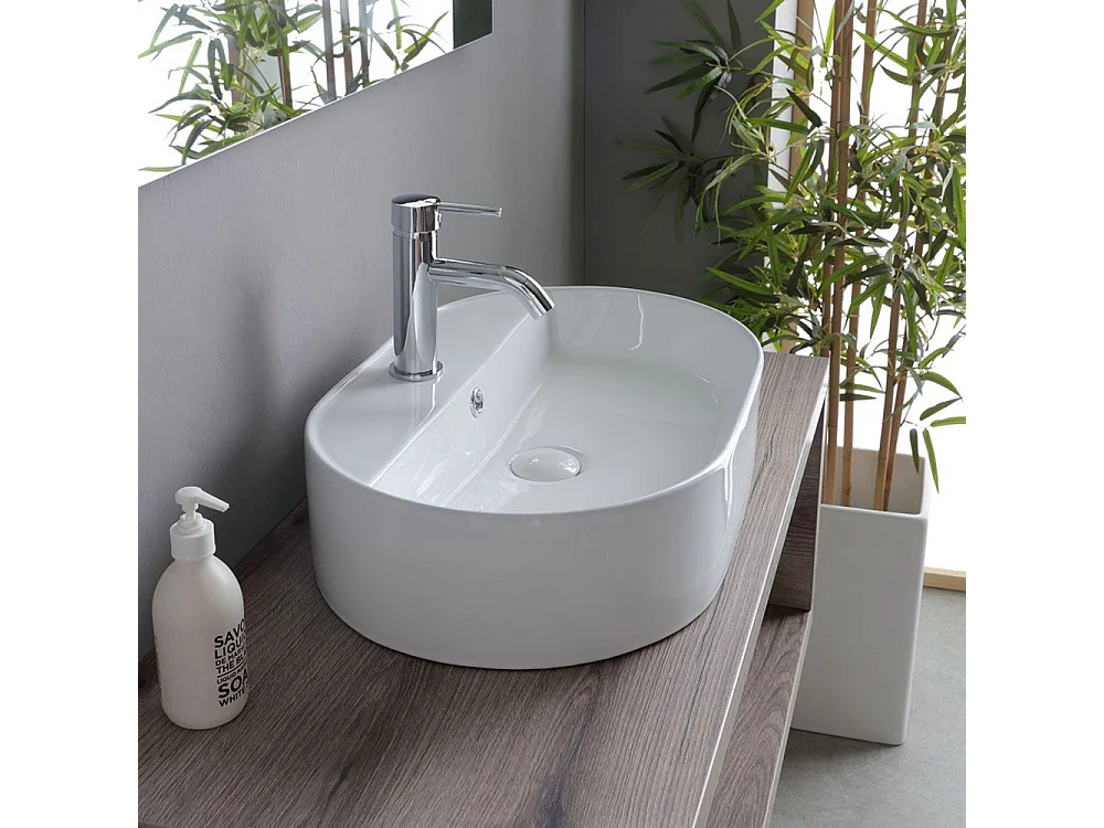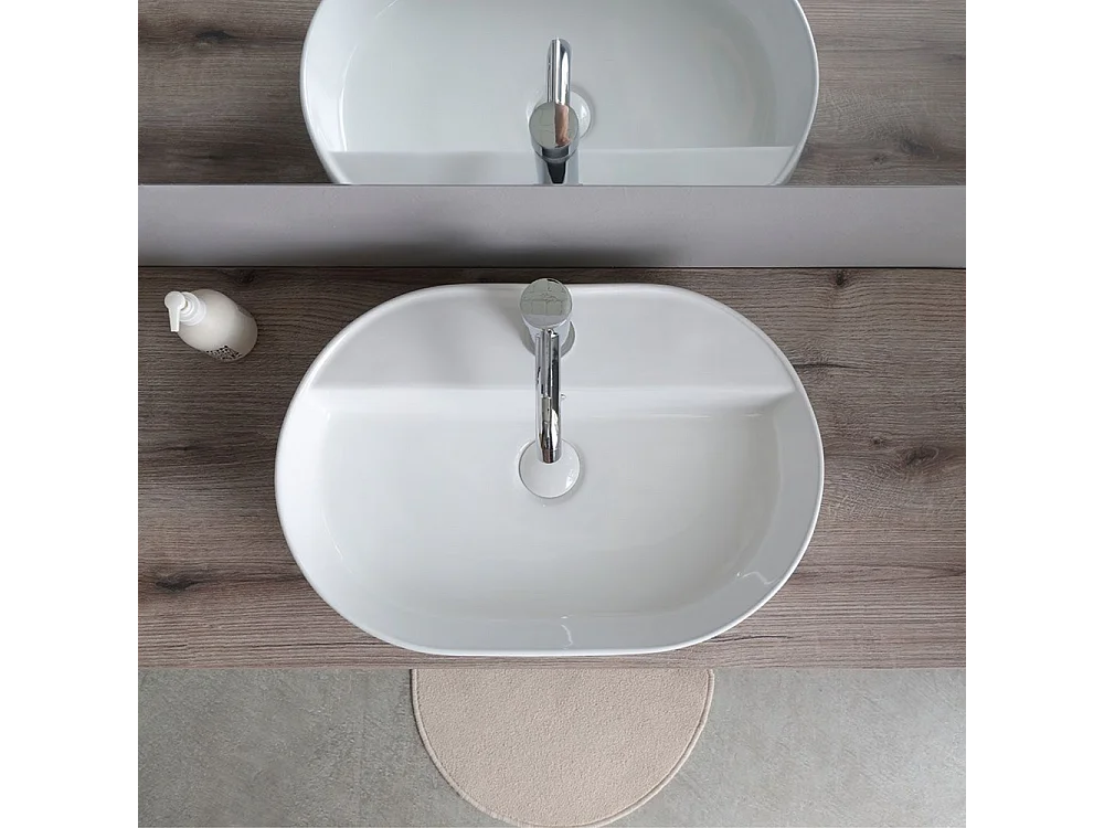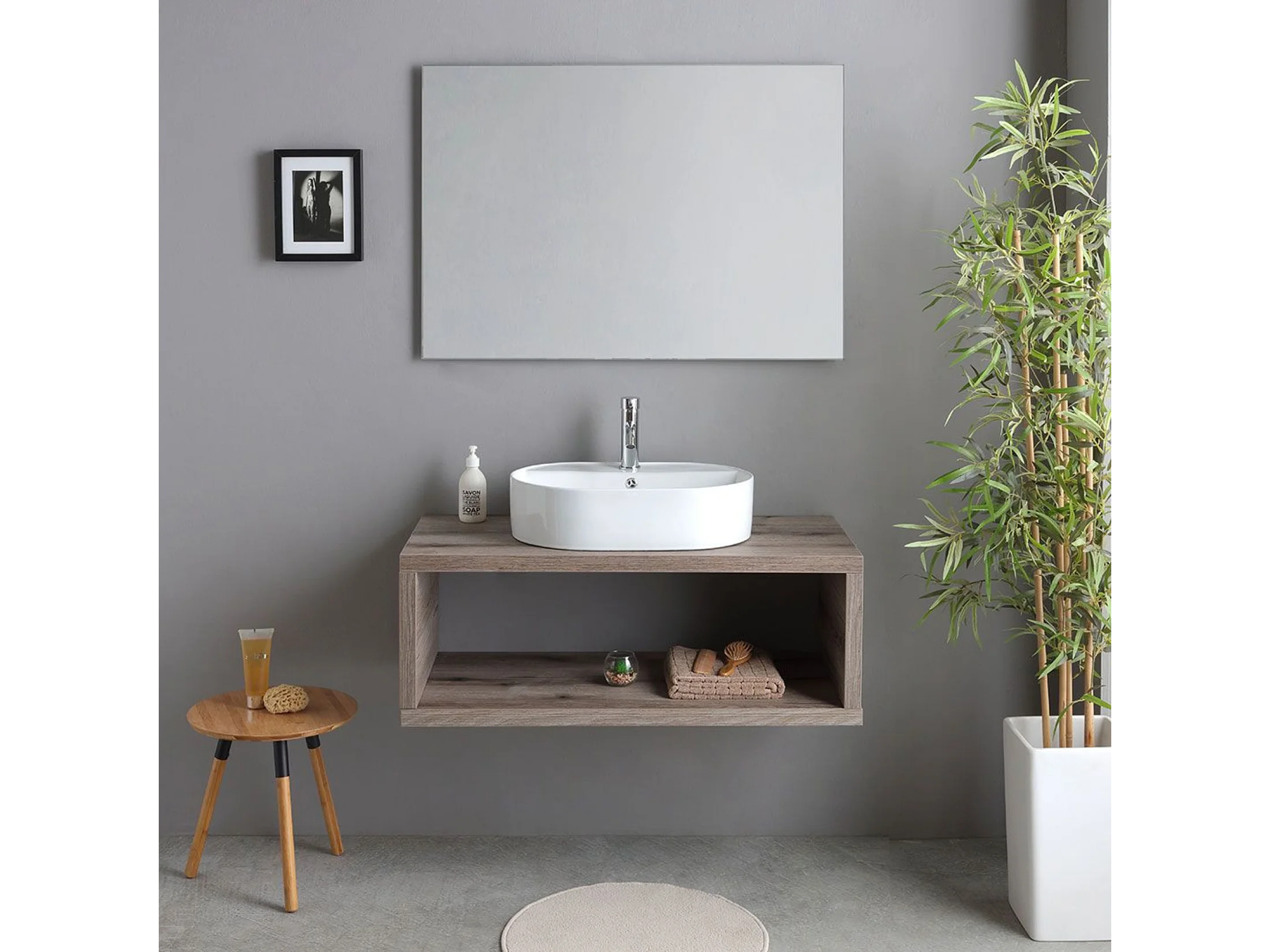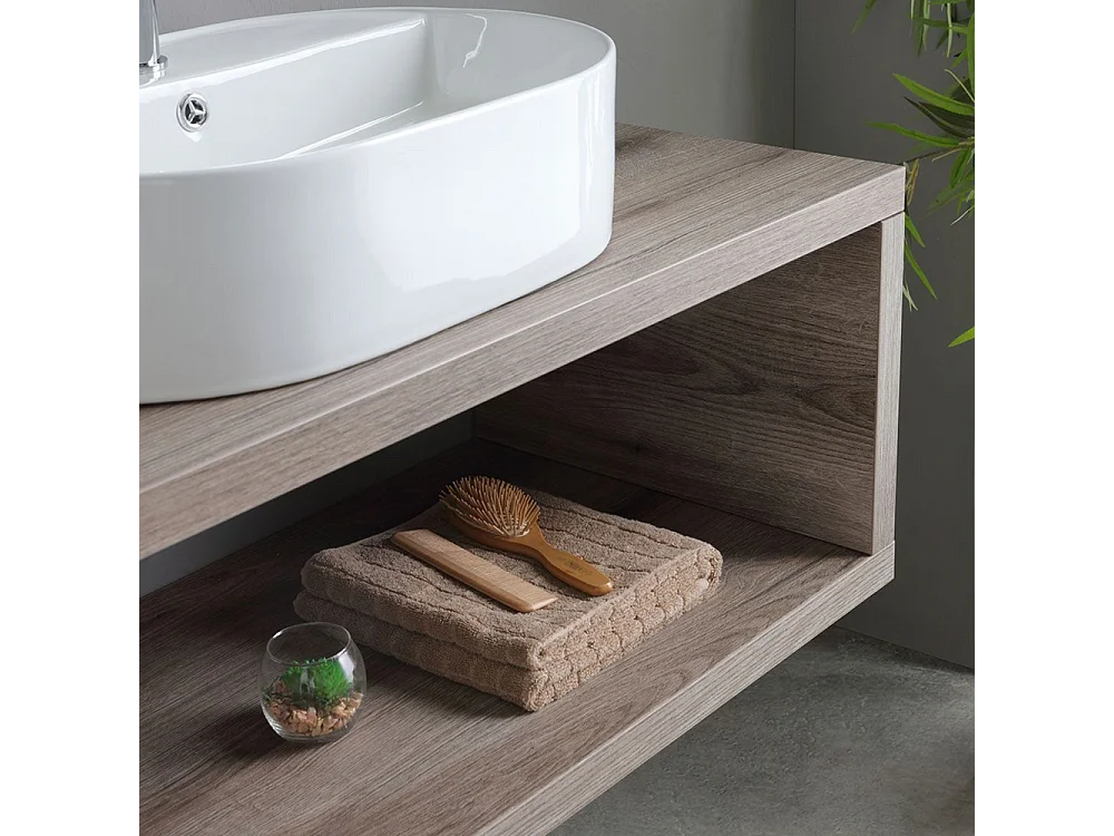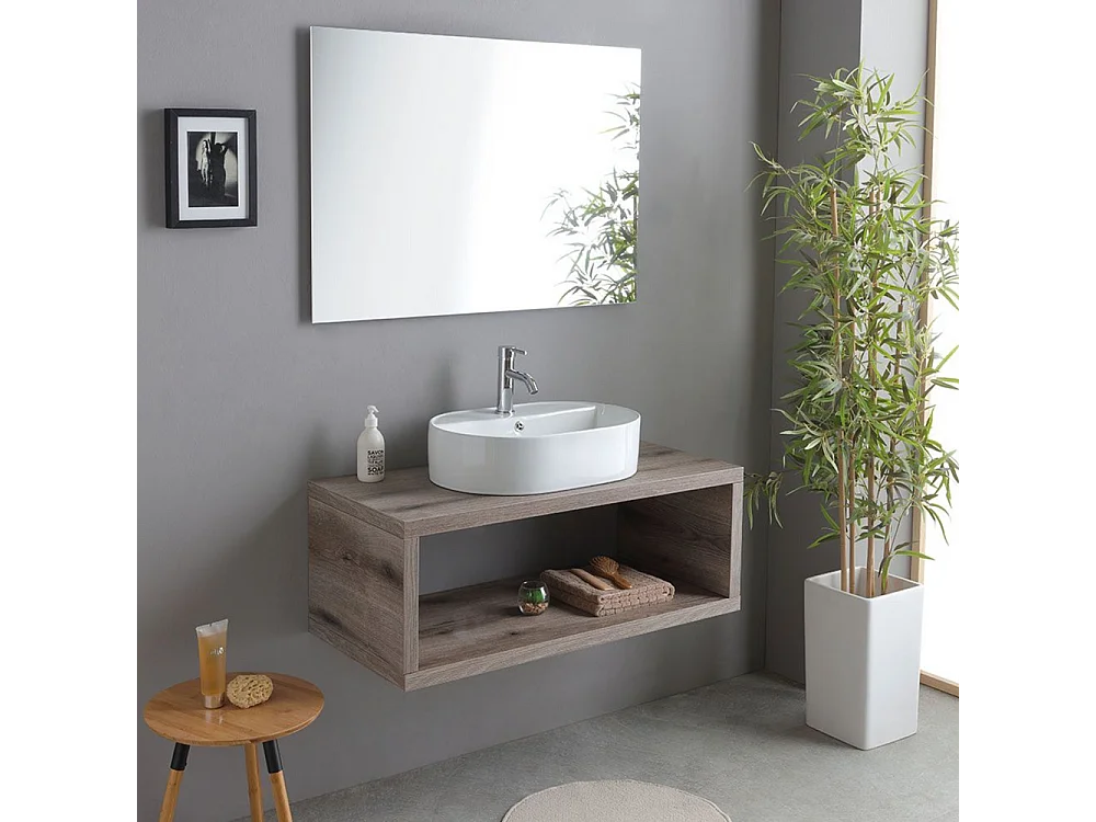 Móvel de casa de banho suspenso "Kos" de 100 cm em carvalho fóssil com lavatório em cerâmica oval branca e espelho retangular