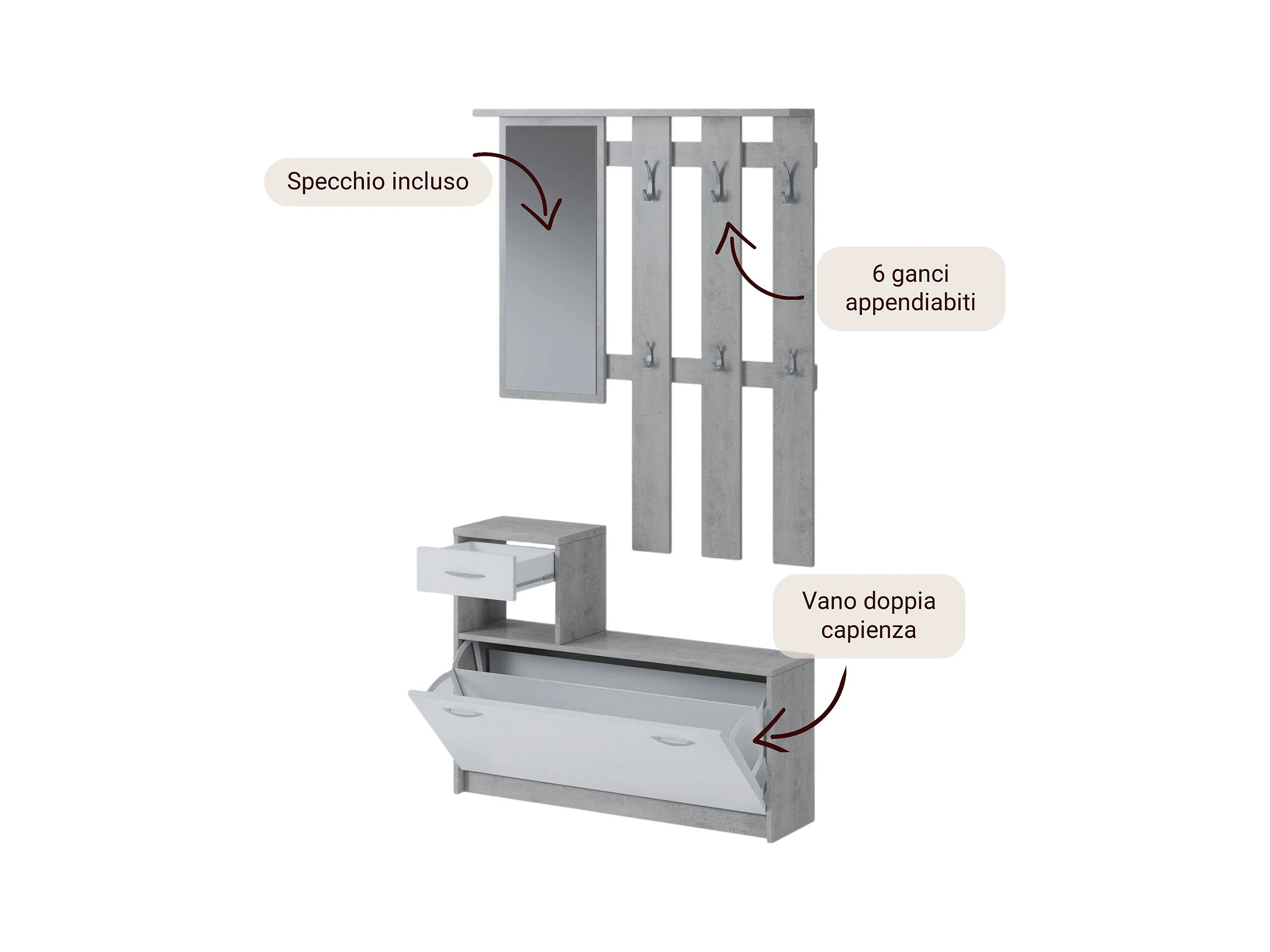 Móvel de entrada Djohnse, Entrada moderna com cabide, Armário com sapateira, Armário com espelho, 50x32h182 cm, Branco e Cimento