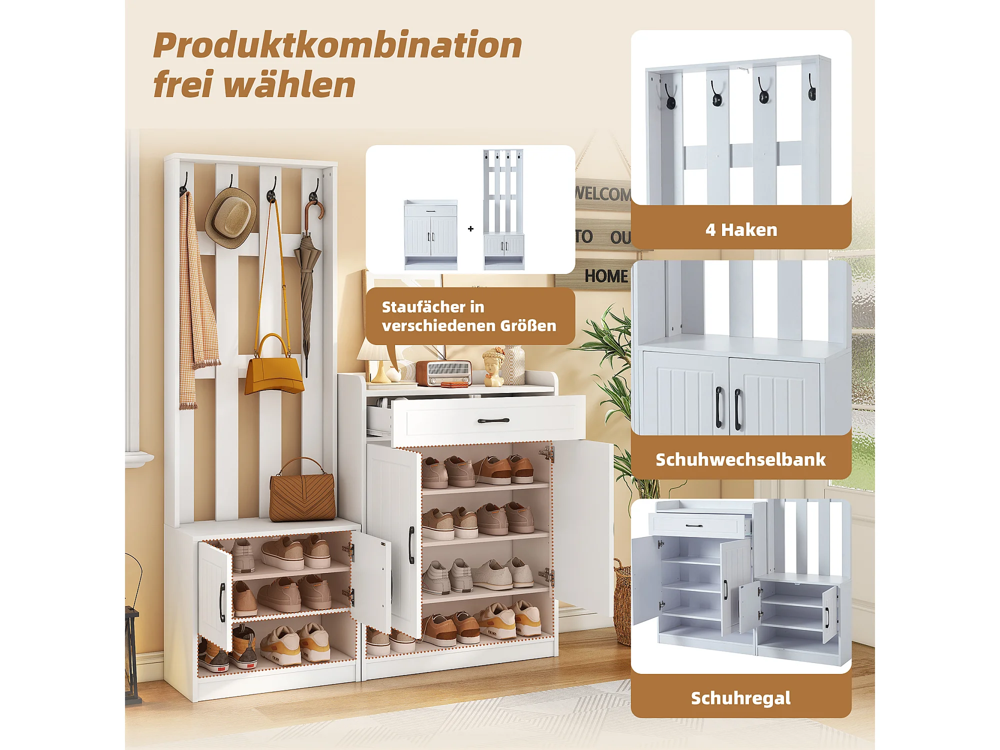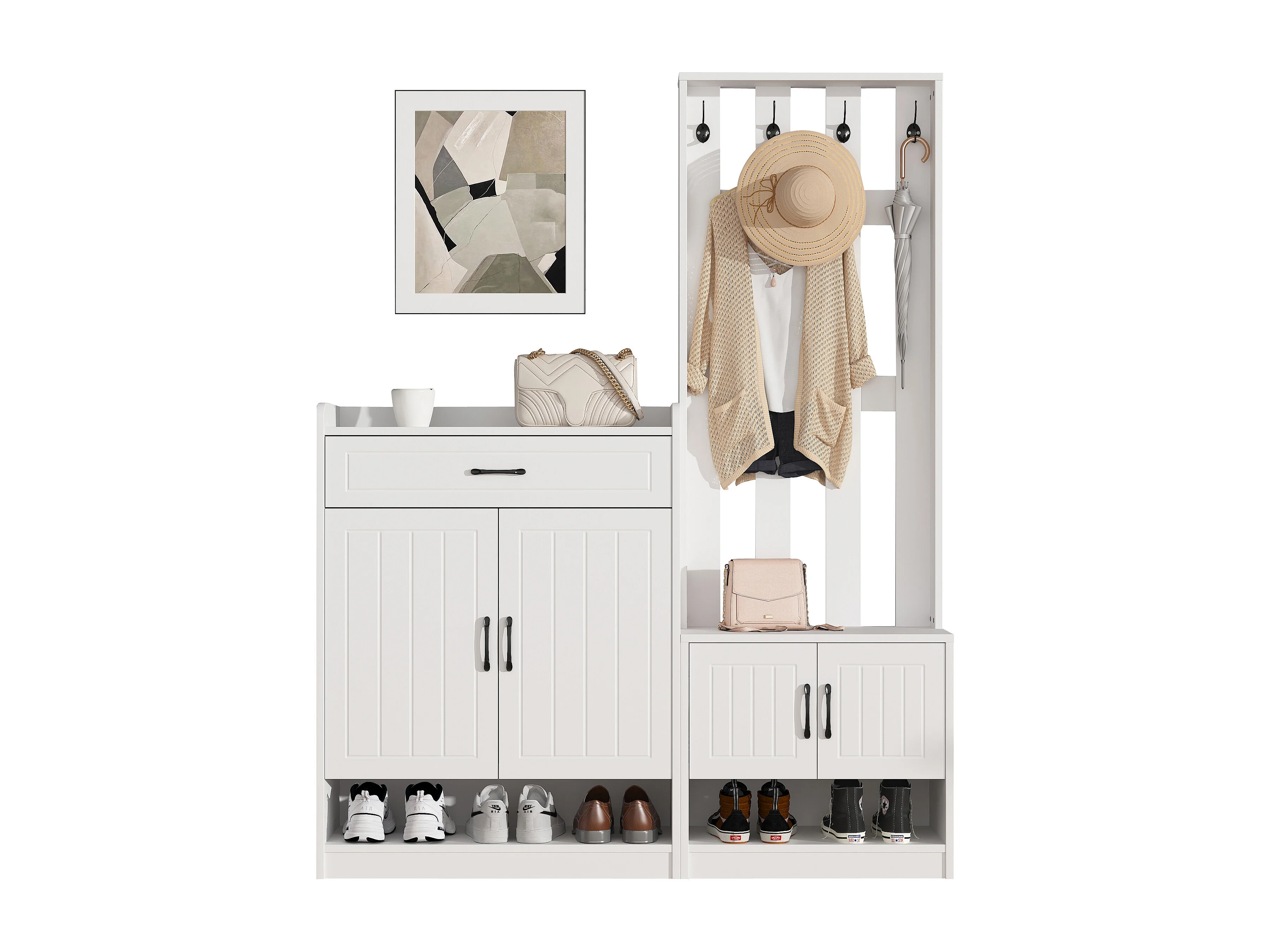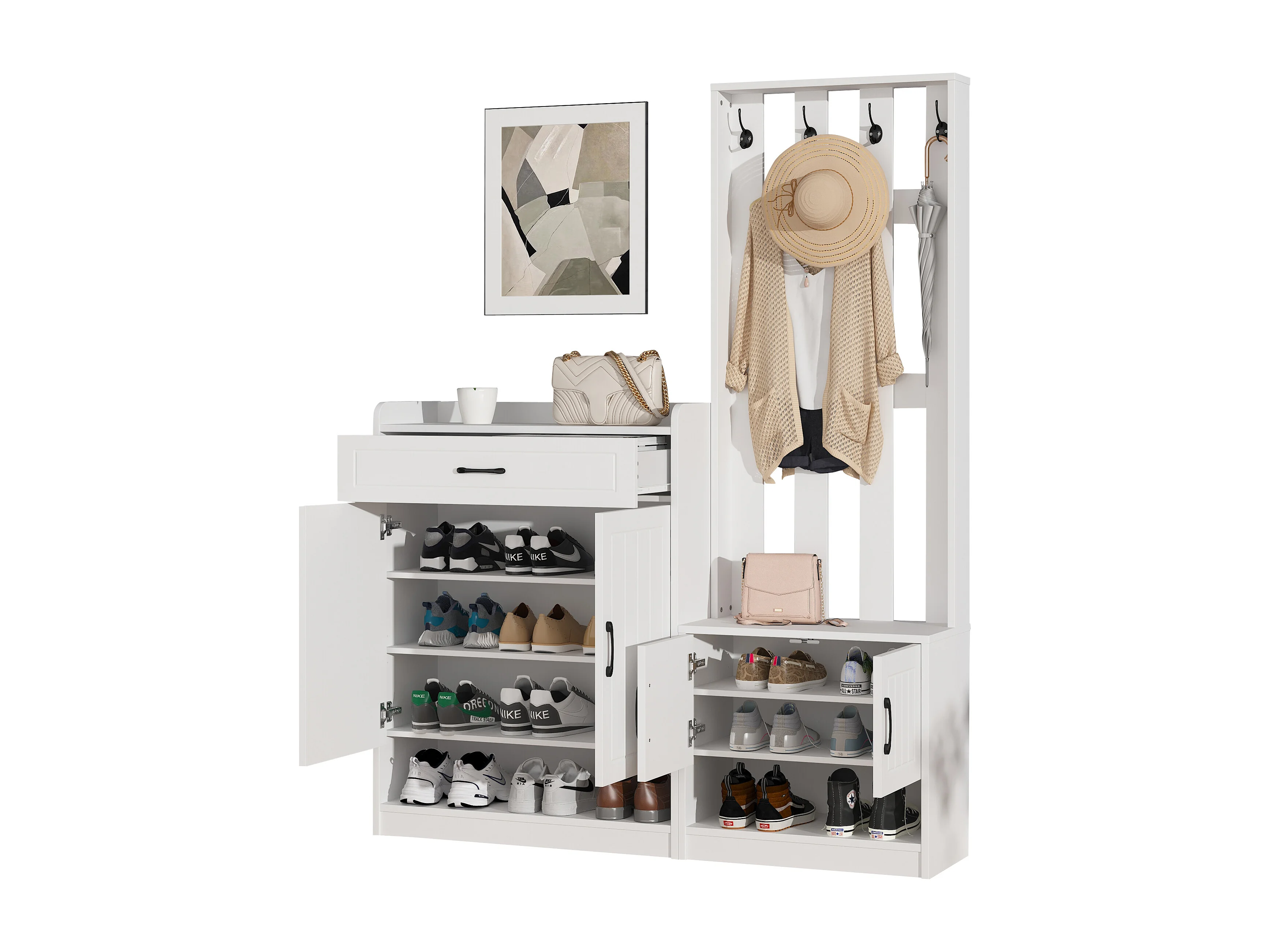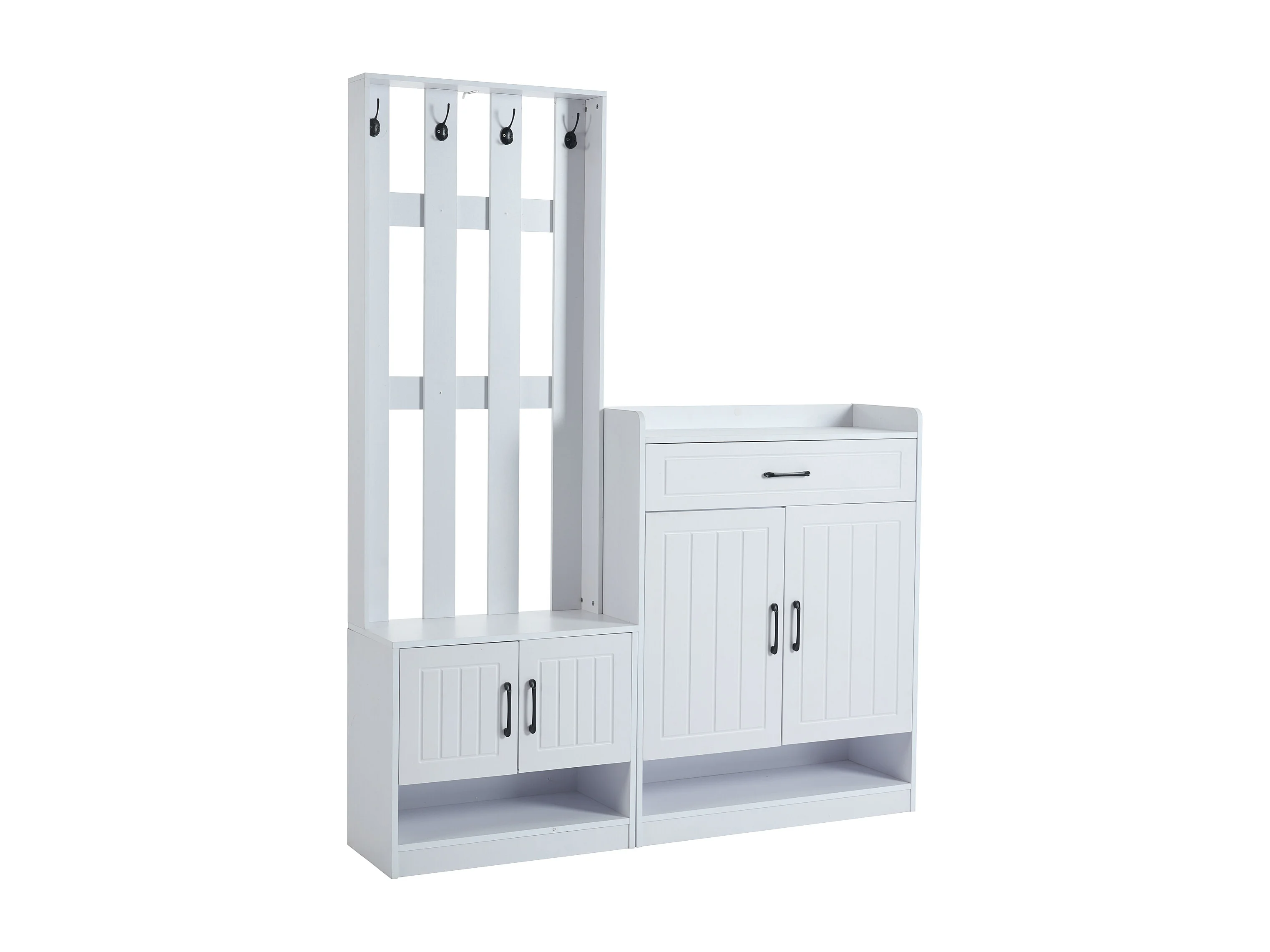 Móvel de entrada 3 em 1, banco de madeira com painel de armazenamento, cabideiro branco 140x32x180 cm