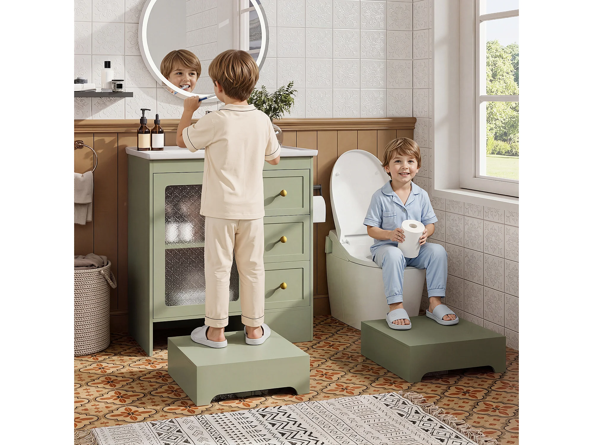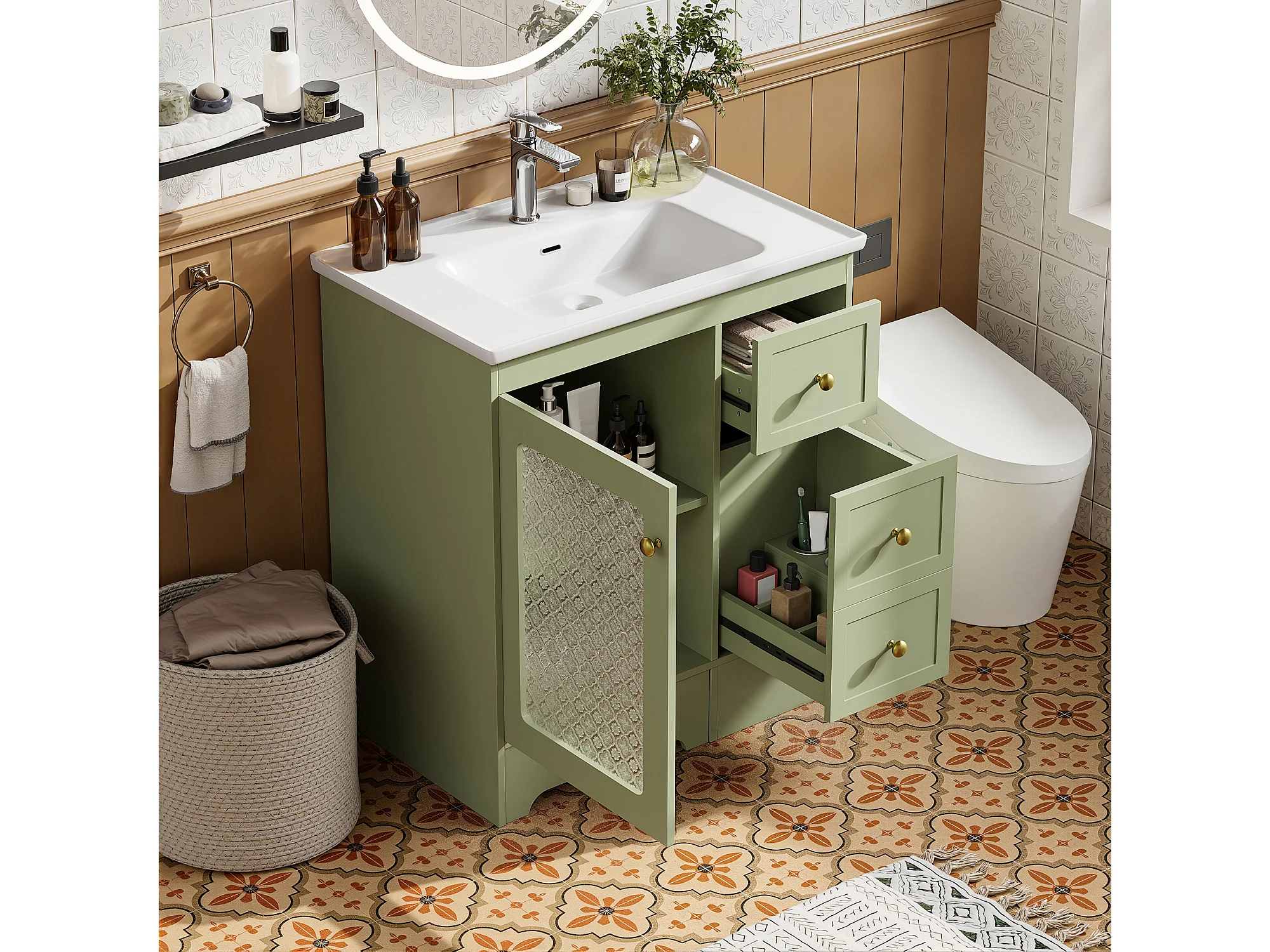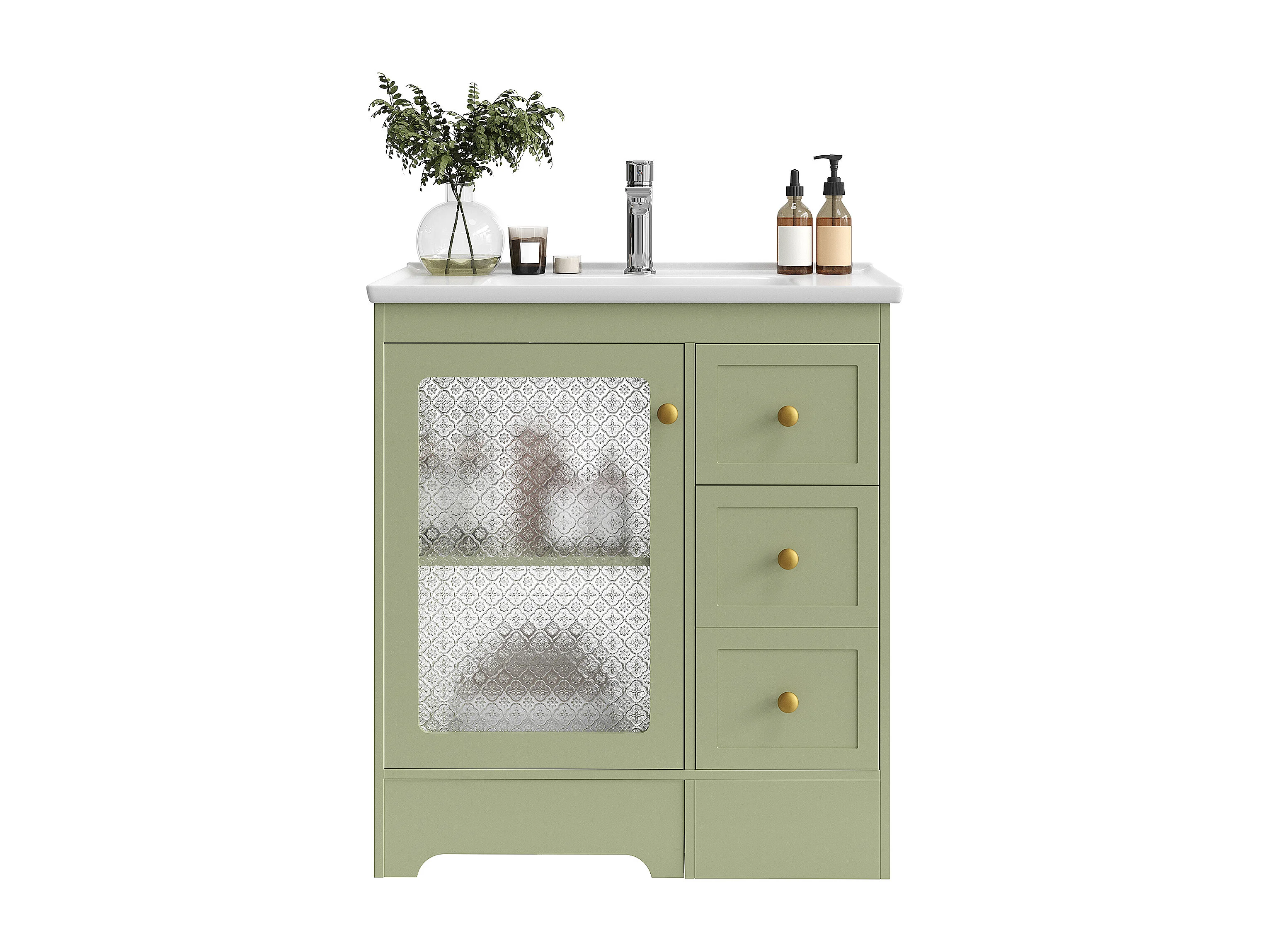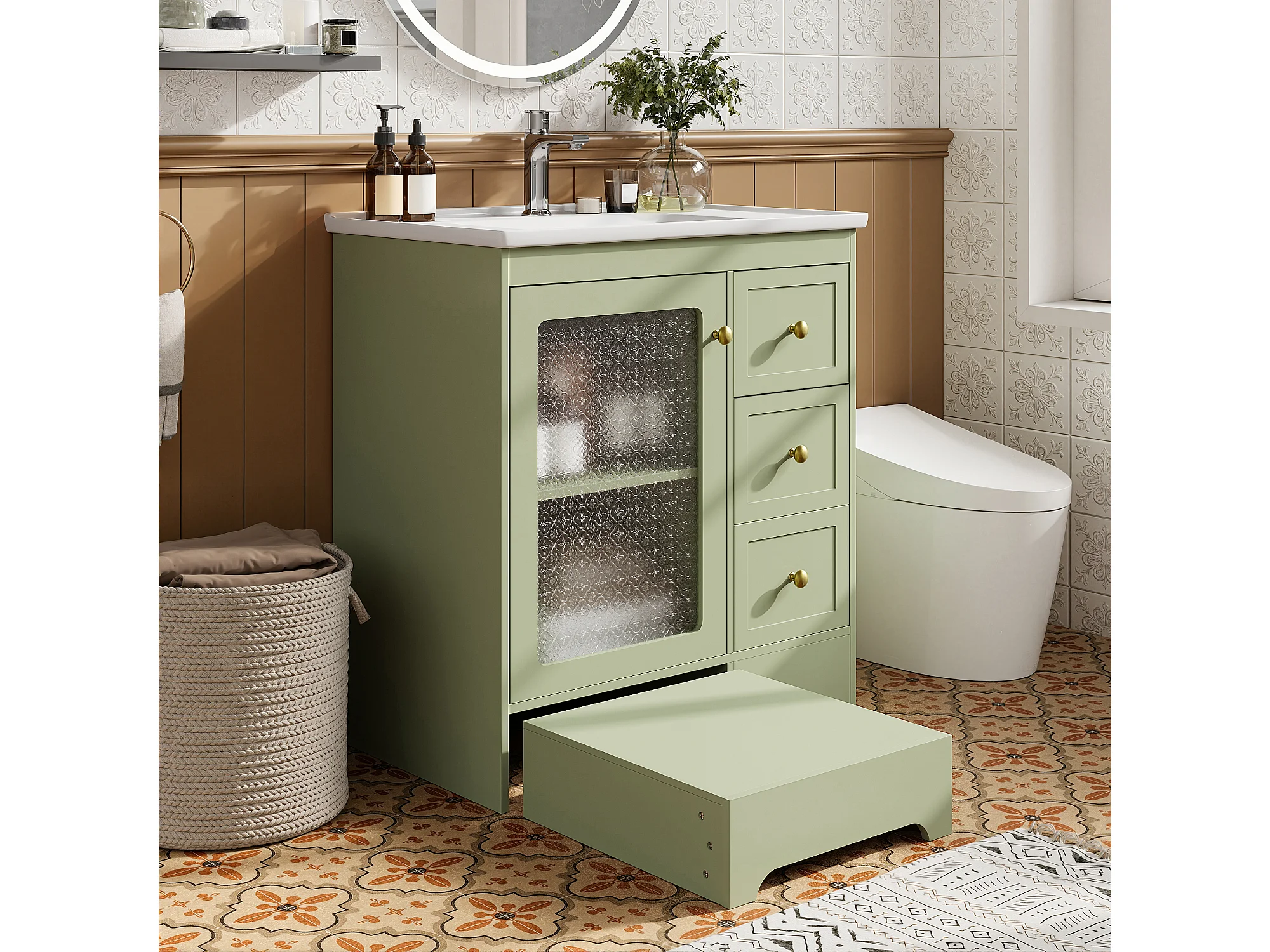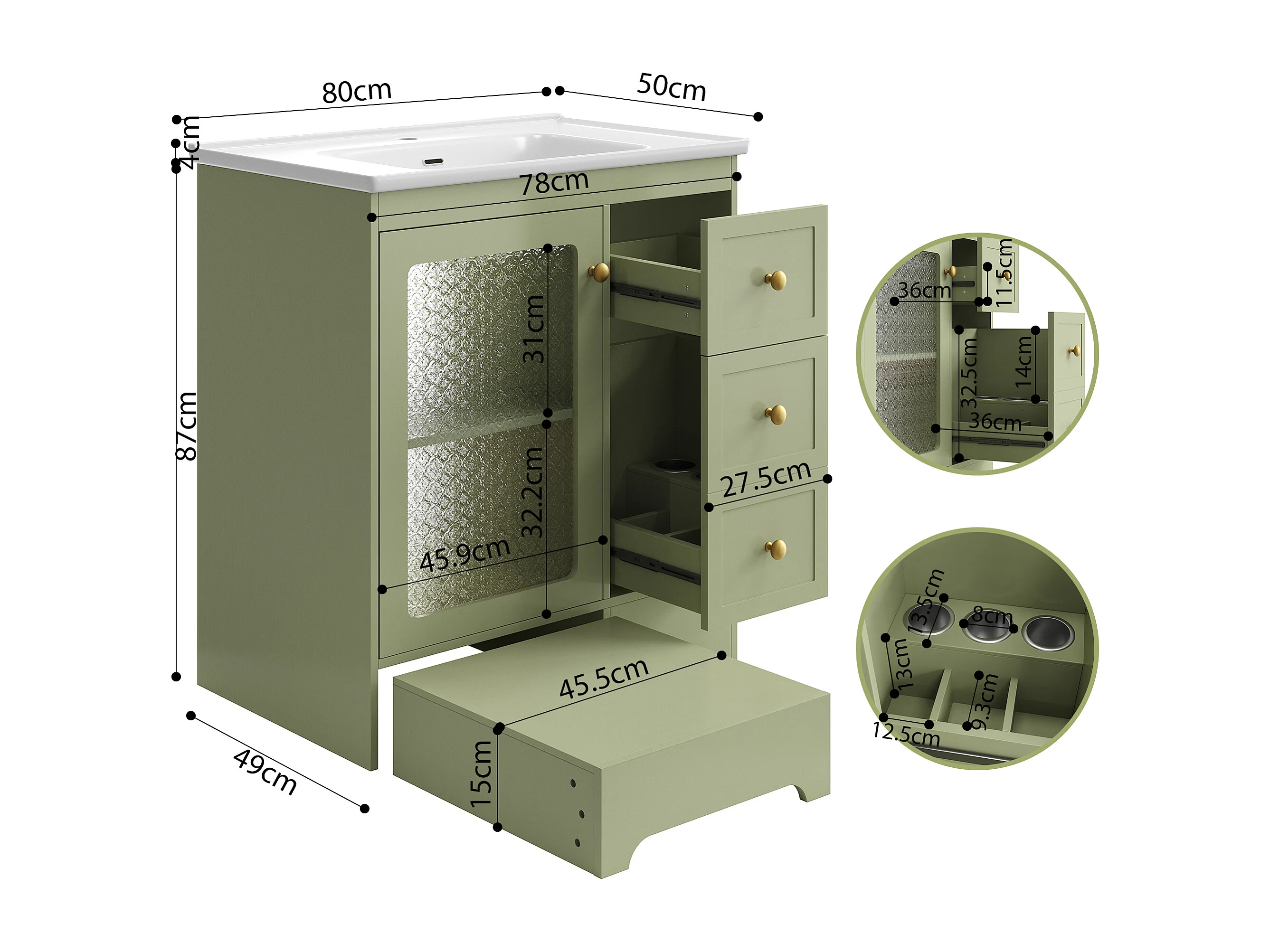 Móvel de lavatório com cuba única em cerâmica lisa - 80 x 50 x 87 cm - com apoio para os pés embutido + LEDs + gavetas + porta - MDF - verde