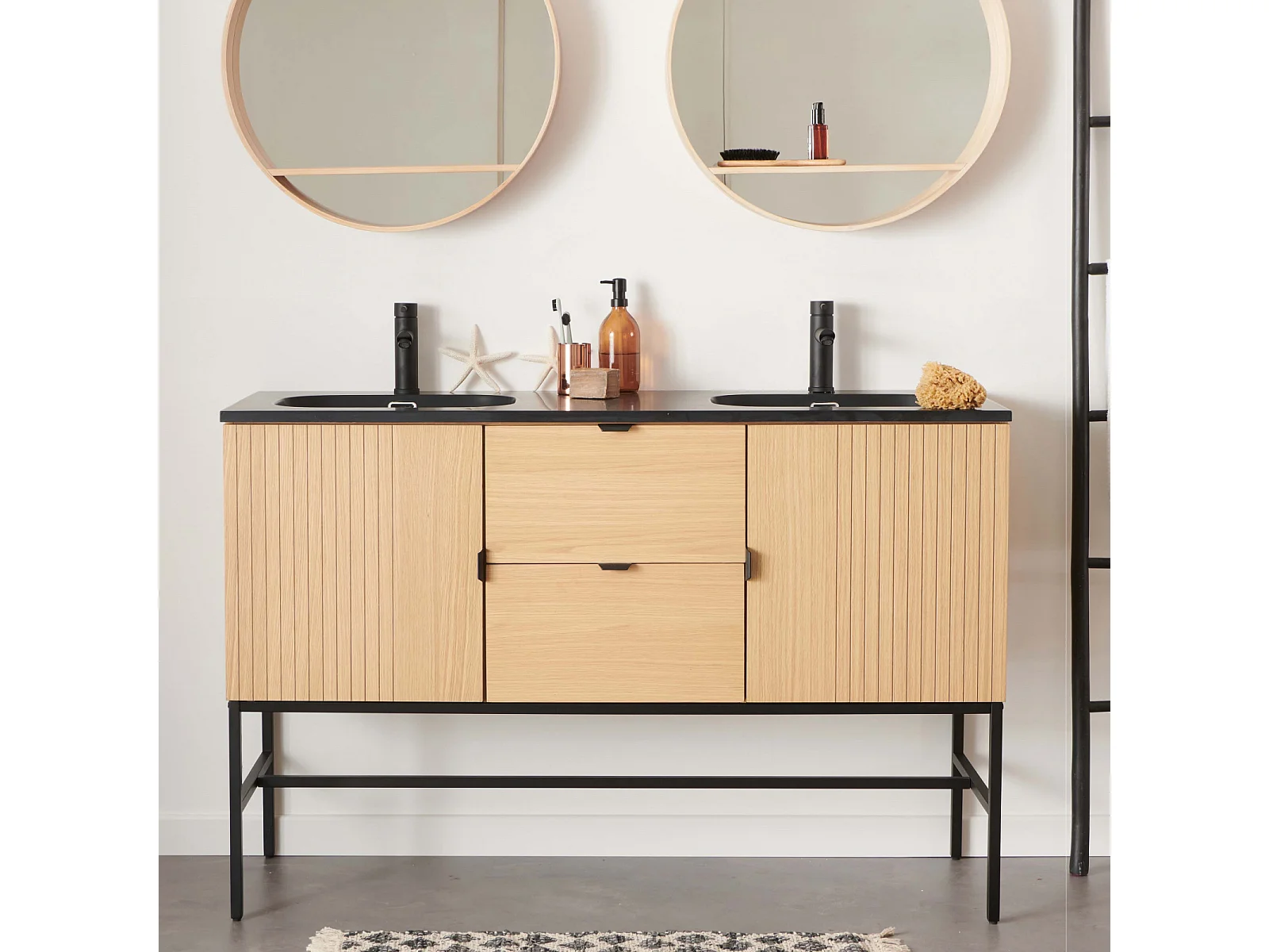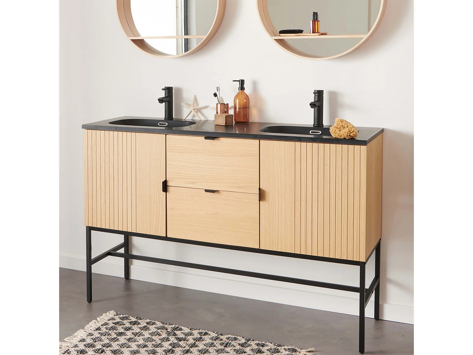 Móvel de lavatório duplo STUDIO de 140 cm em carvalho sobre pés com bancada de lavatório em resina