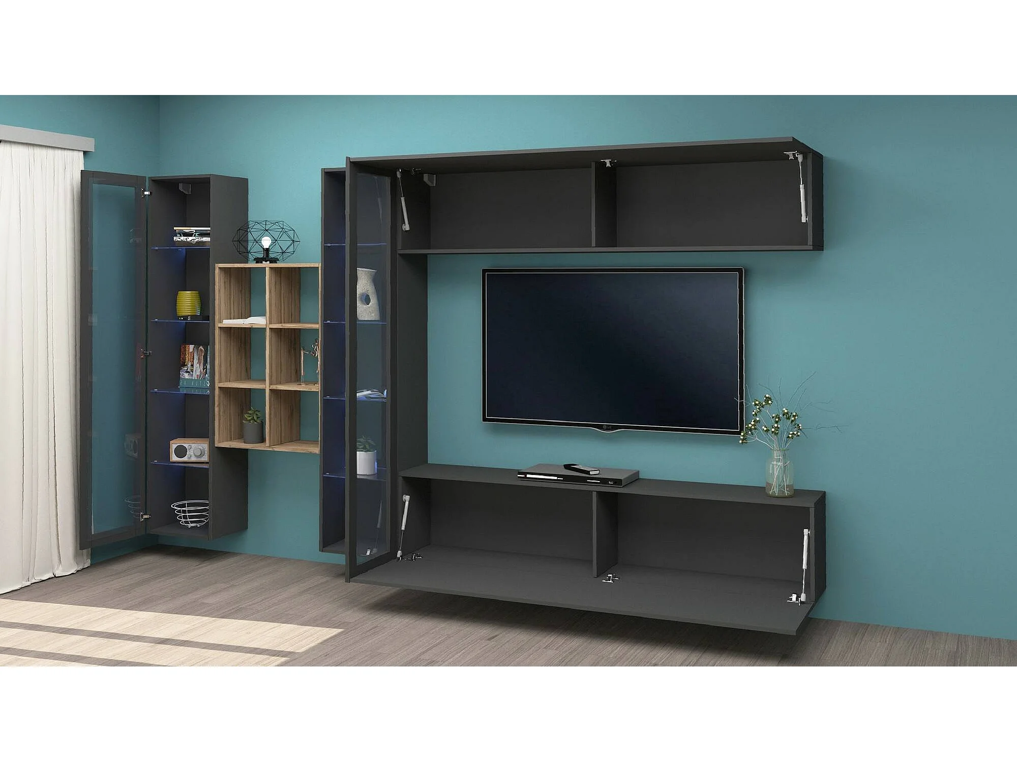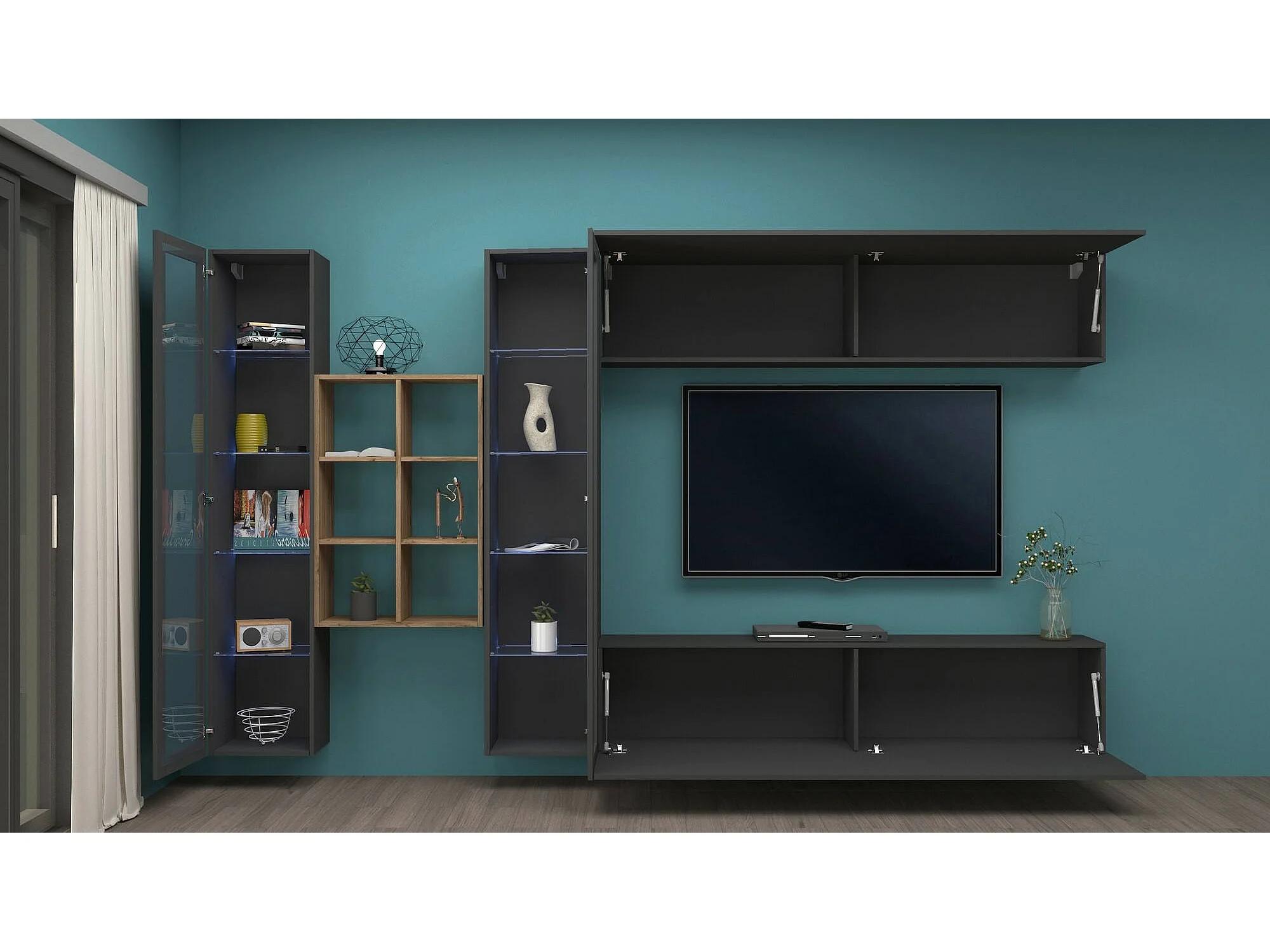 Móvel de parede Dcaprin, conjunto de sala de TV com 4 portas, móveis de sala multiuso, 100% Fabricado na Itália, 280x30h180 cm, Antracite e Bordo