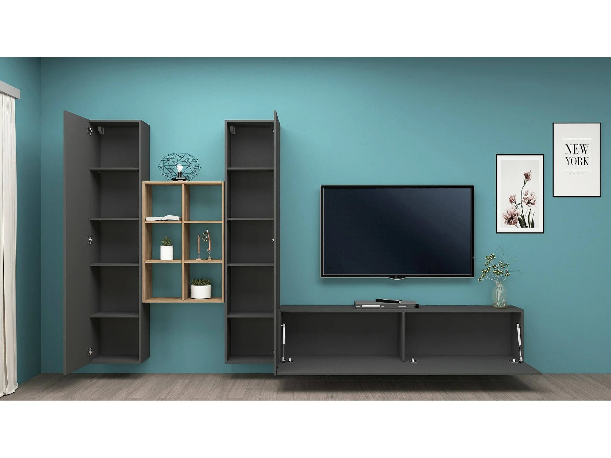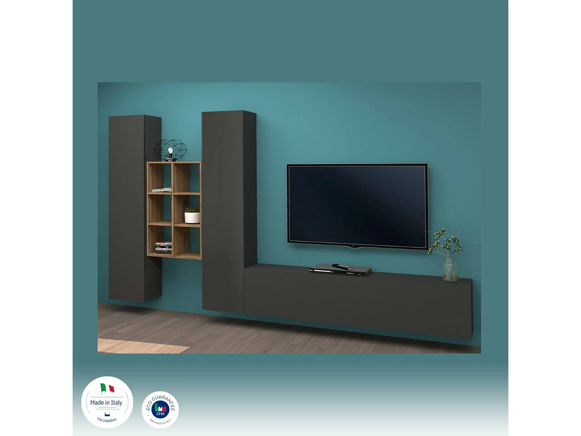 Móvel de parede Emiliano, conjunto de sala de TV com 3 portas, móveis de sala multiuso, 100% Fabricado na Itália, 320x30h180 cm, Antracite e Bordo