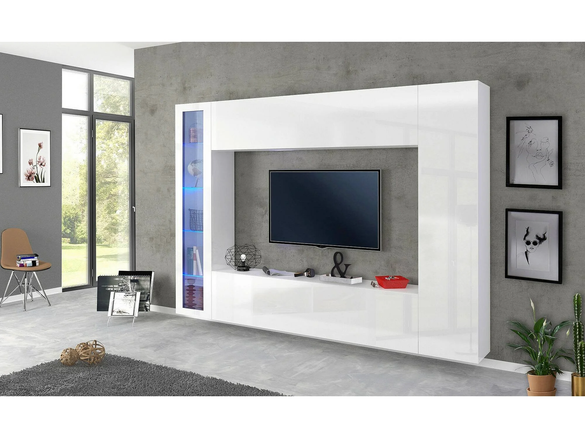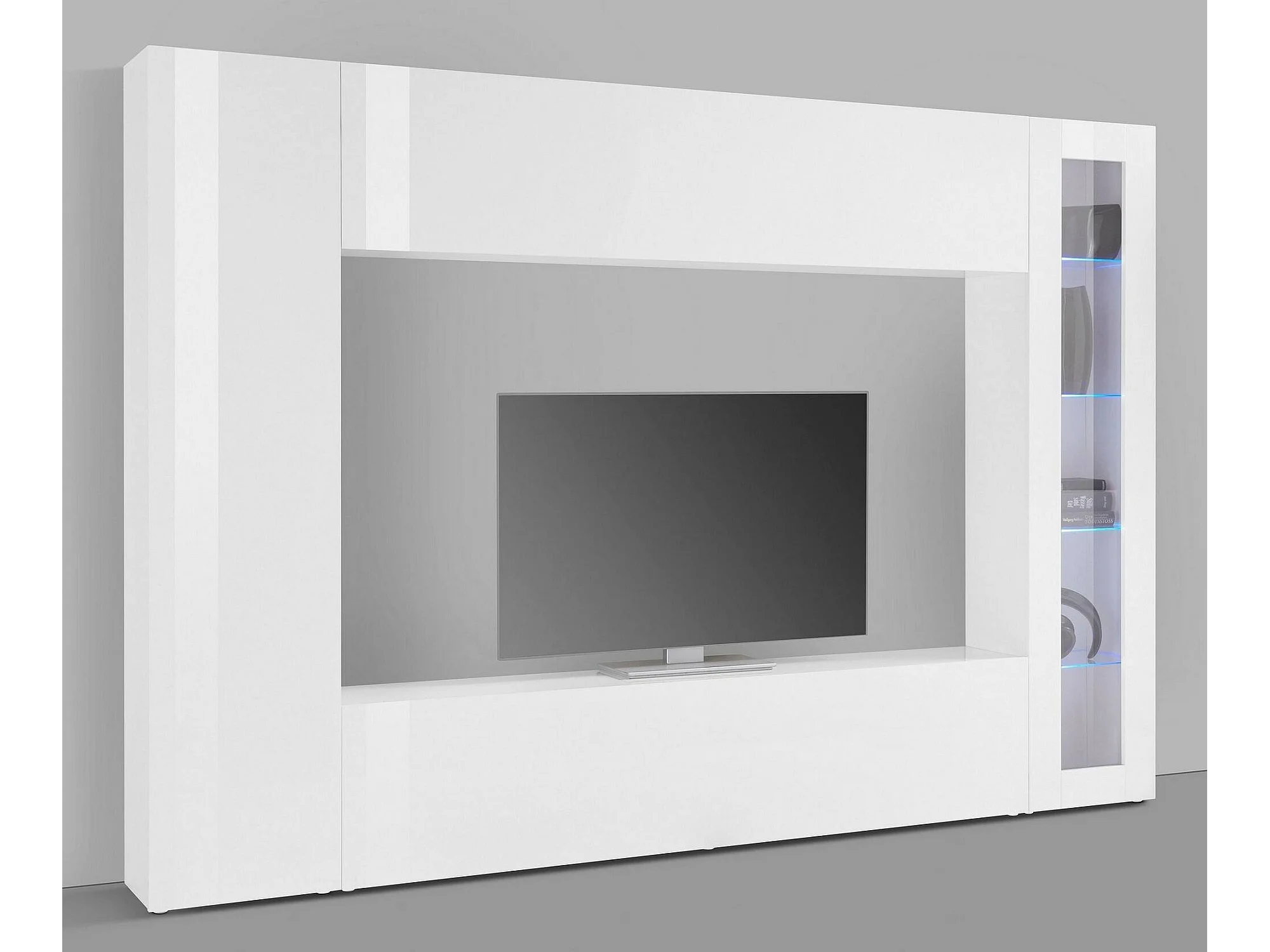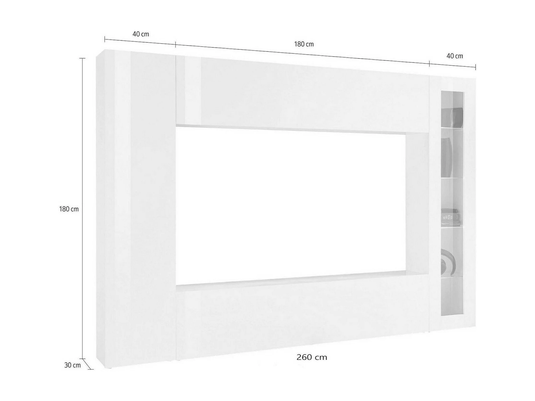 Móvel de parede Luigi, móvel de sala de TV de 4 portas, mobiliário de sala multiuso, 100% Made in Italy, 260x30h180 cm, branco brilhante, com luz LED azul e vitrine