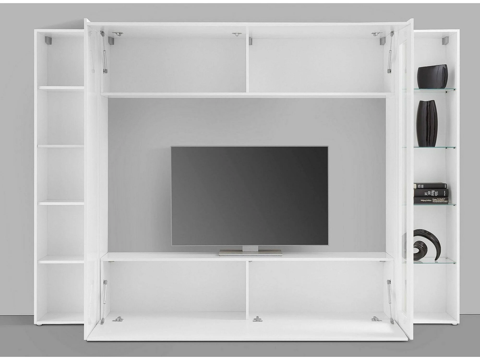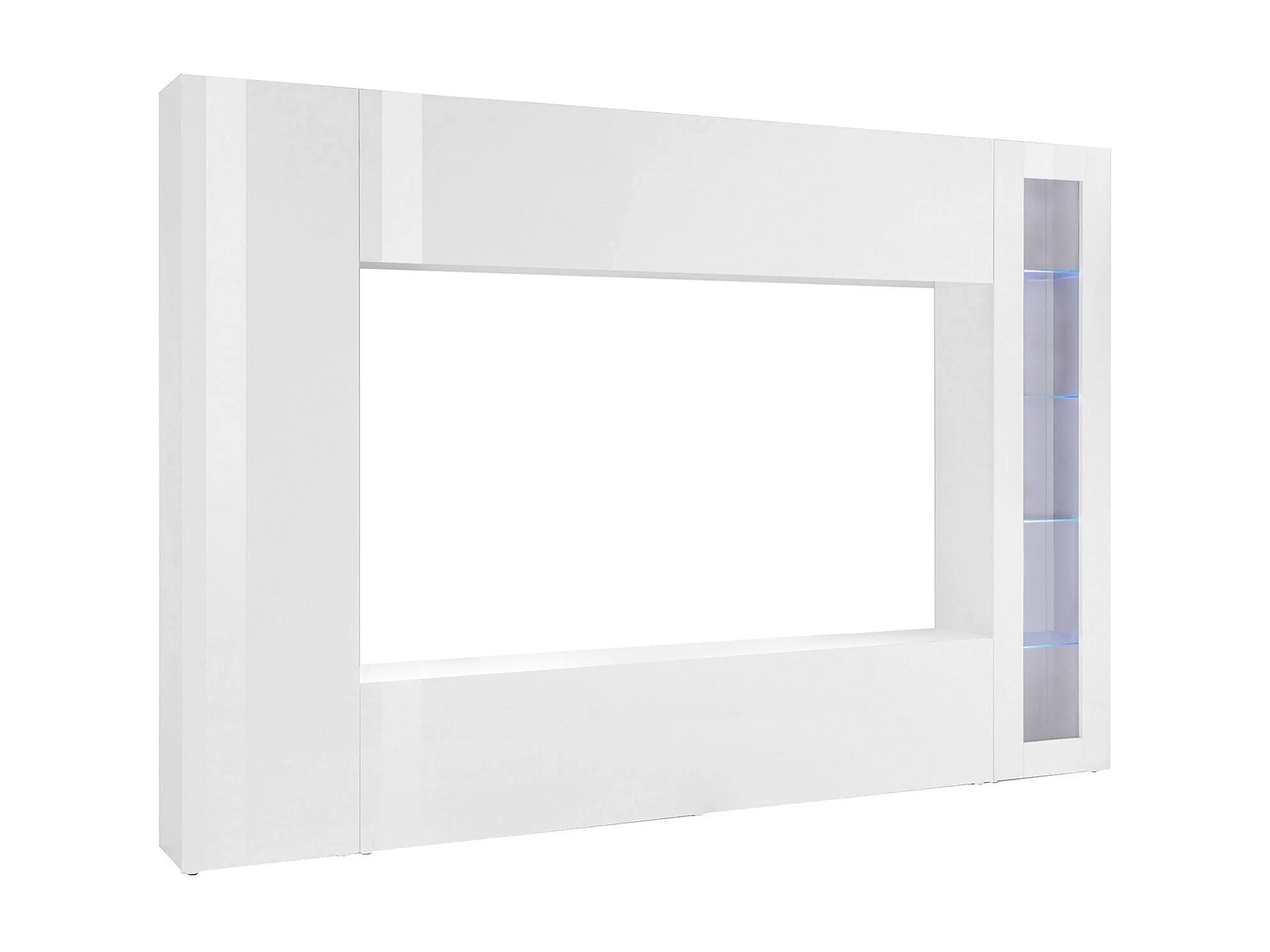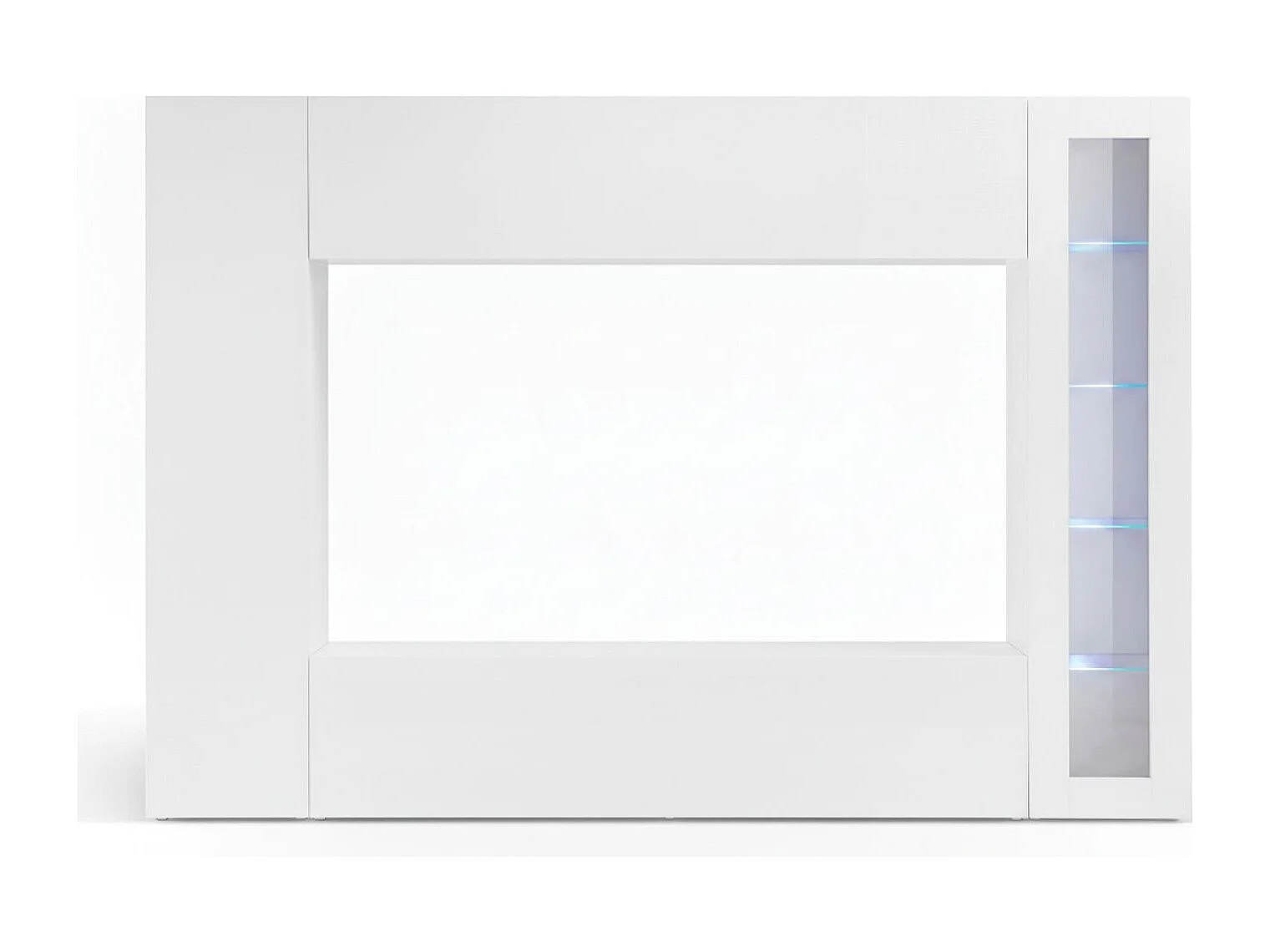 Móvel de parede Luigi, móvel de sala de TV de 4 portas, mobiliário de sala multiuso, 100% Made in Italy, 260x30h180 cm, branco brilhante, com luz LED azul e vitrine