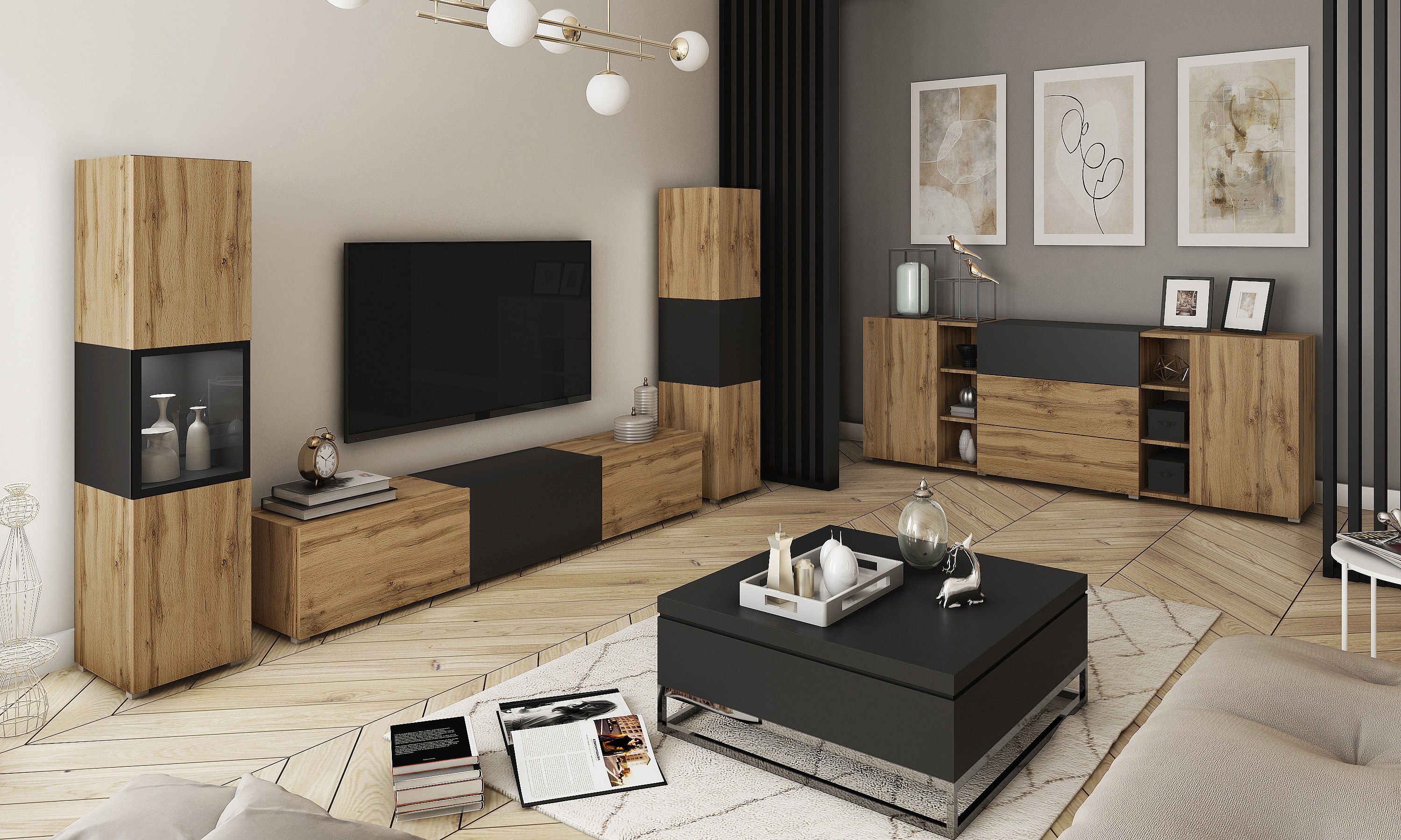 Móvel de sala com iluminação LED, conjunto suspenso e de chão com móvel TV 180 cm, vitrine e coluna, corpo carvalho wotan, inserto preto mate